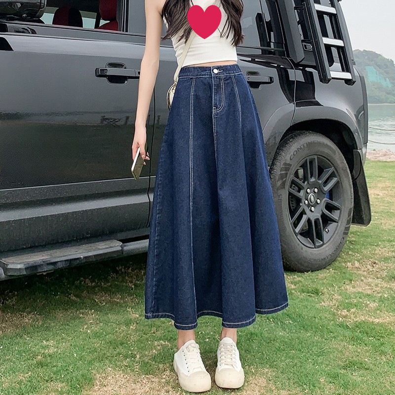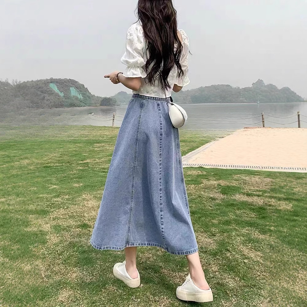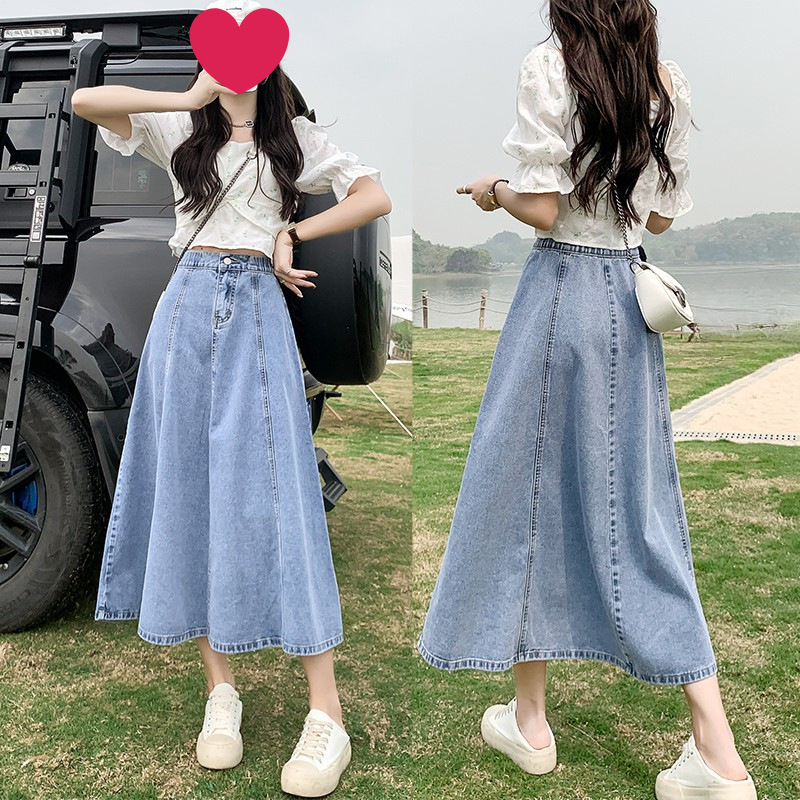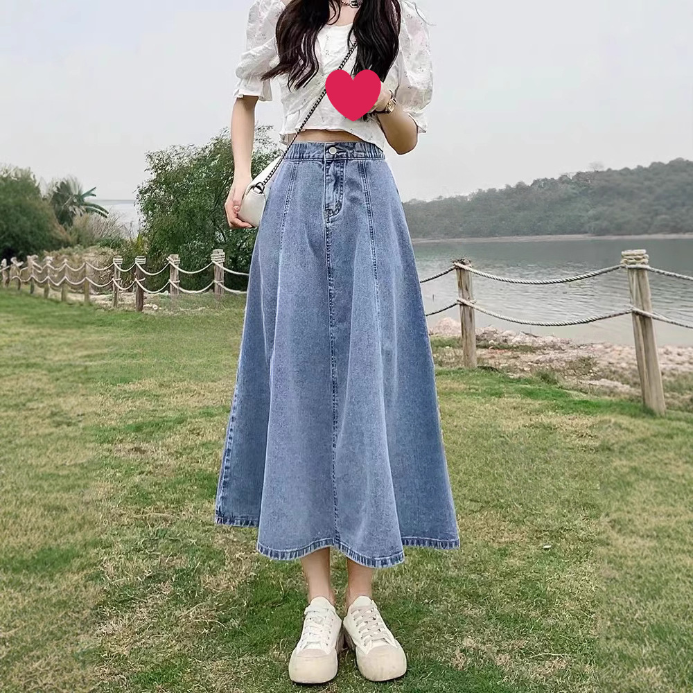 Elasto Waist 데님 긴 치마 여자 치마 여름 새로운 복고풍 슬리밍 중간 길이 높은 허리 A 라인 Dape 우산 치마스토어 가기
