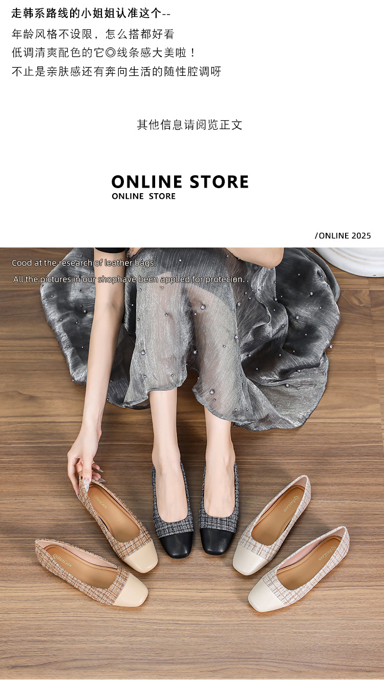 Houndstooth Flat Heels 여성용 향기로운 스타일 색상 매칭 2cm 스퀘어 발가락 얕은 입 우아한 사교계 소프트 가죽 싱글 슈즈 슬립 온스토어 가기