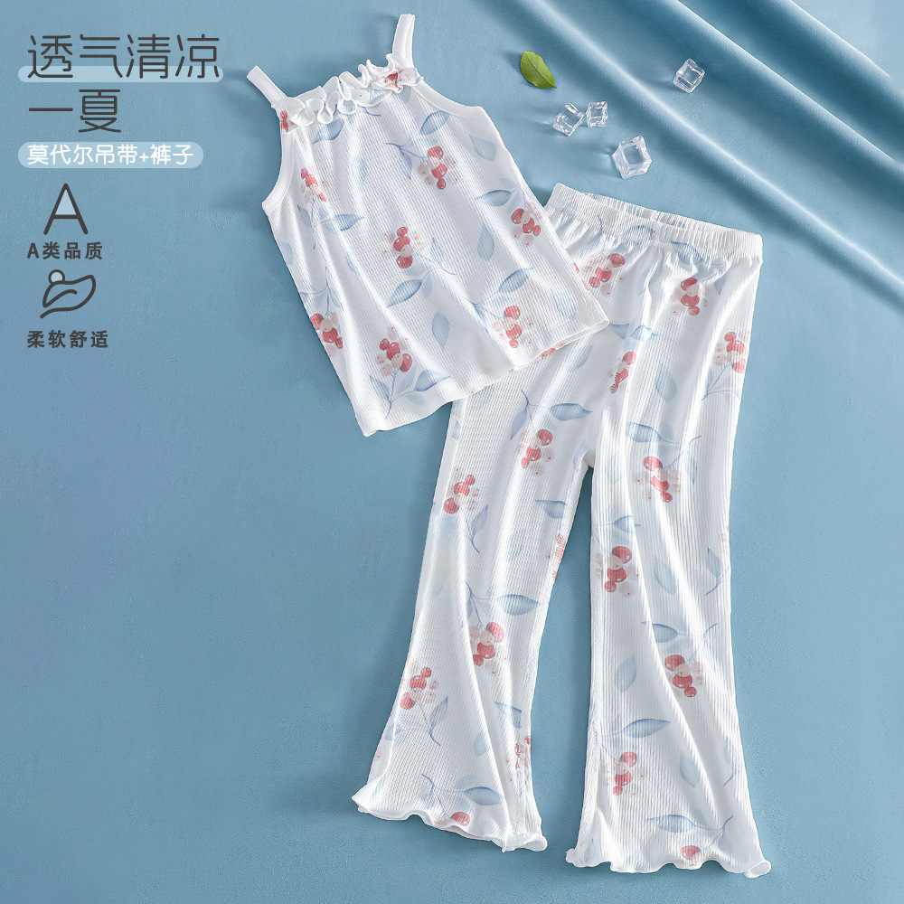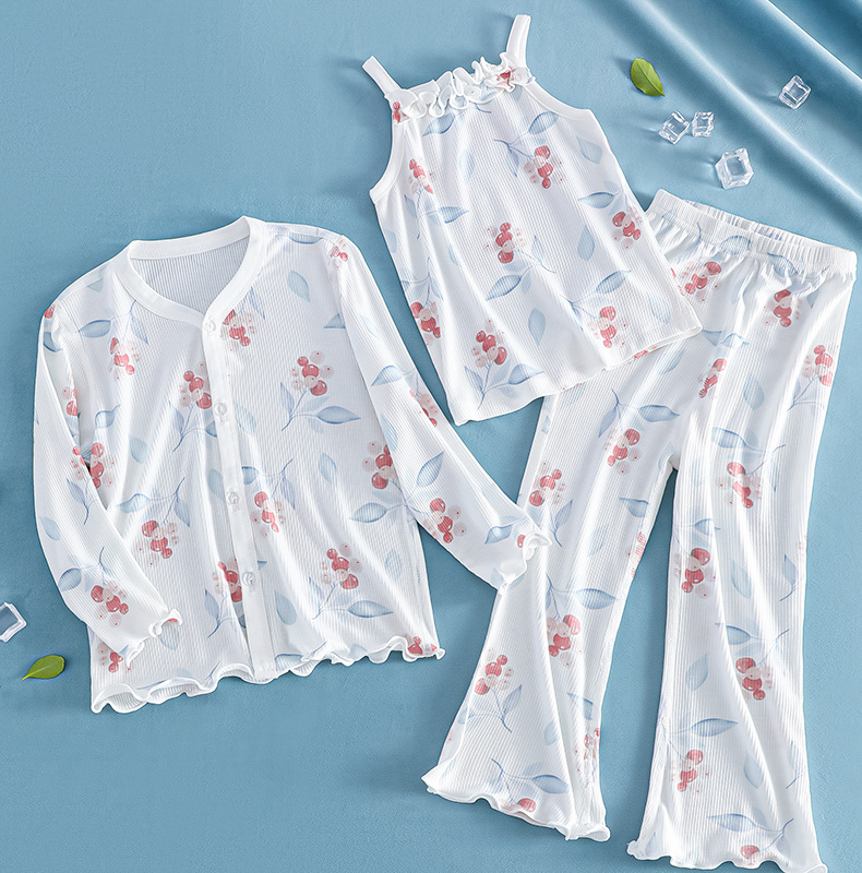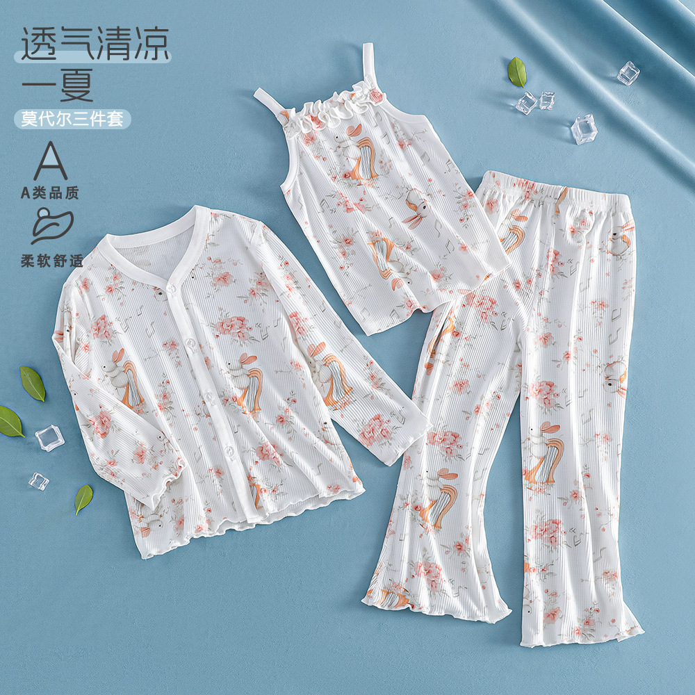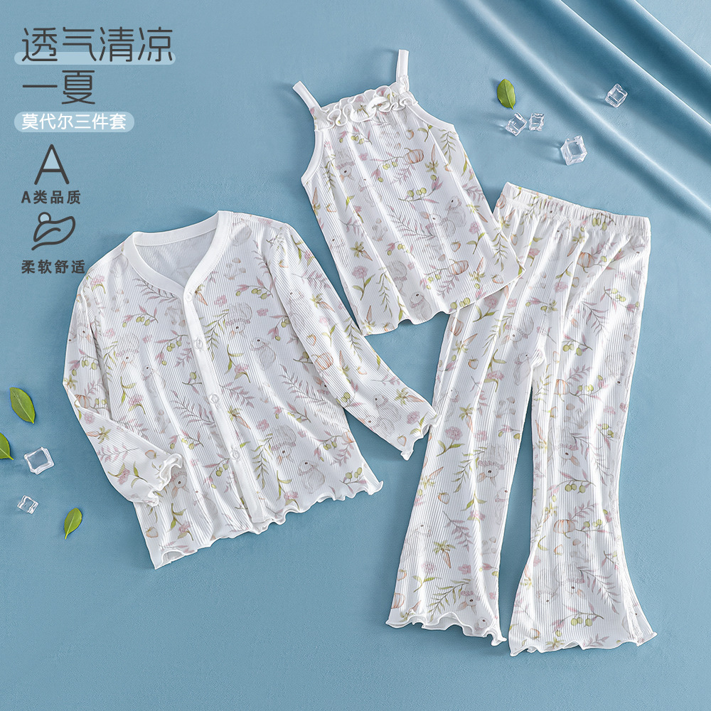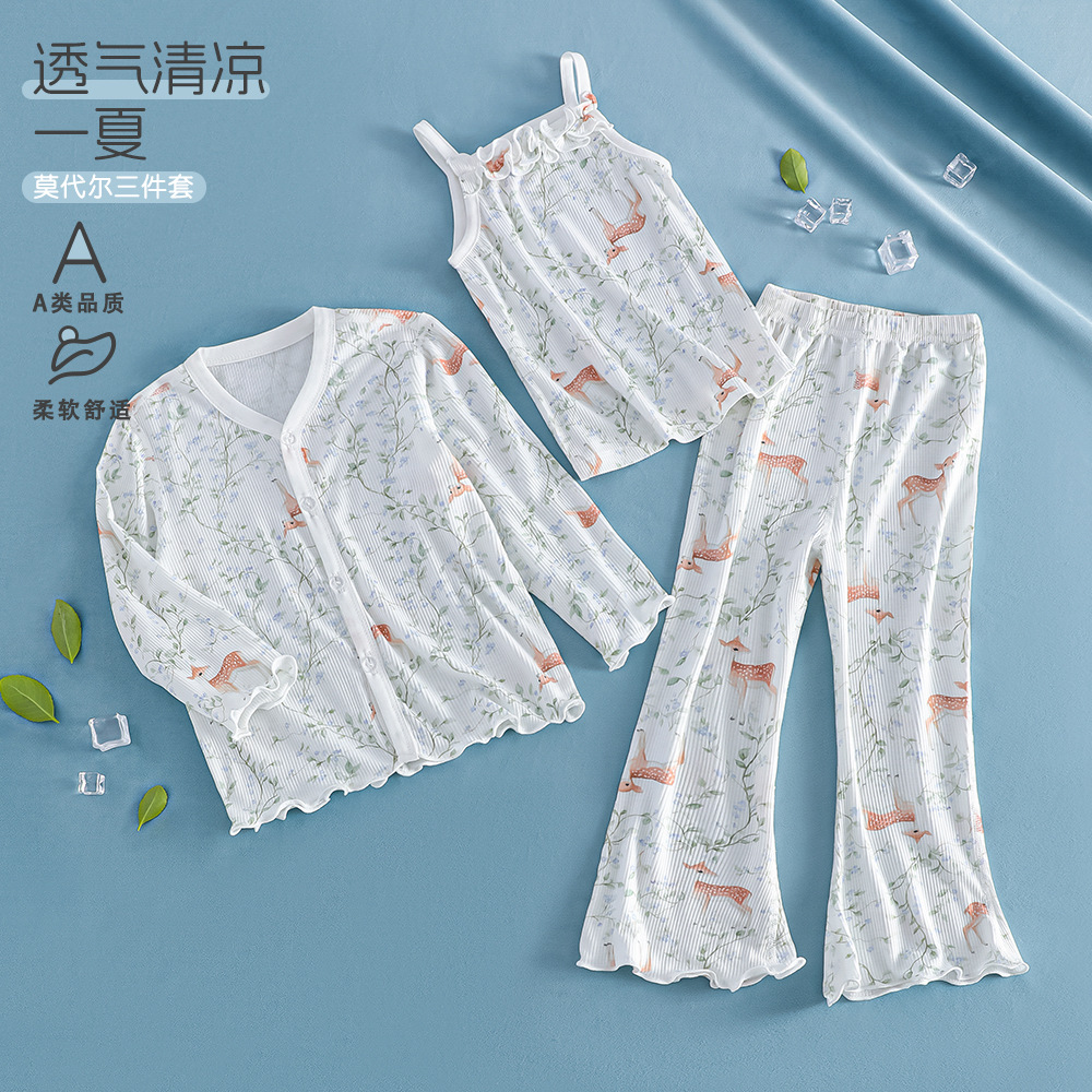 여름 얇은 여아 모달 어린이 잠옷 A 쿨 아이스 실크 걸스 에어컨 의류 3 피스 홈 의류스토어 가기
