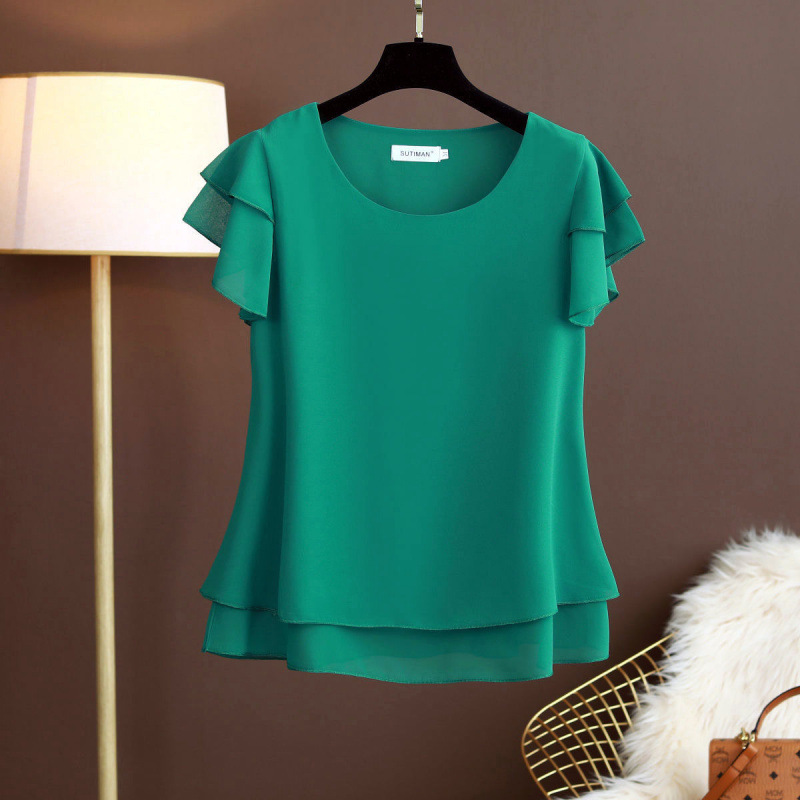 배를 가리는 여름 신작 여성용 반팔 상의, 쉬폰 셔츠, 큰 사이즈 티셔츠, 루즈하고 스타일리시한 셔츠, 여성용 하의 셔츠