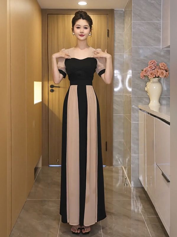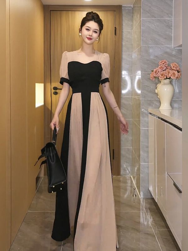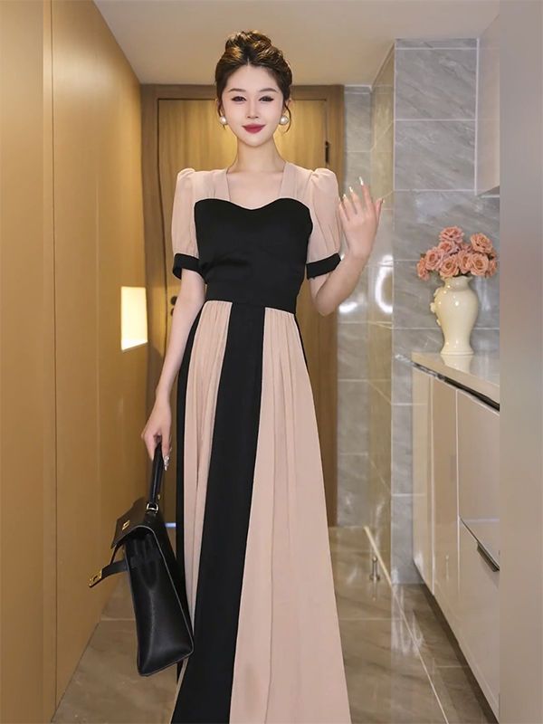 세트 여성 2025 년 여름 새로운 프랑스 스타일 레트로 콘트라스트 컬러 스티칭 탑 우아한 높은 허리 스커트 투피스 세트스토어 가기