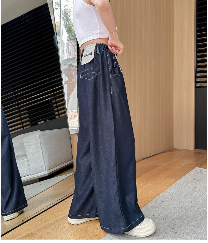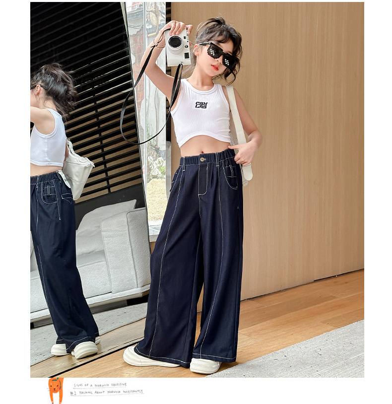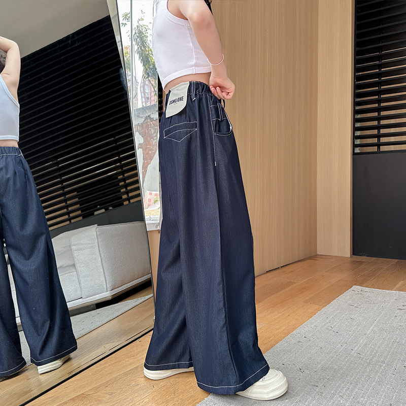소녀 바지 2025 여름 새로운 얇은 어린이 느슨한 스트레이트 넓은 다리 바지 여름 큰 어린이 얼음 실크 청바지