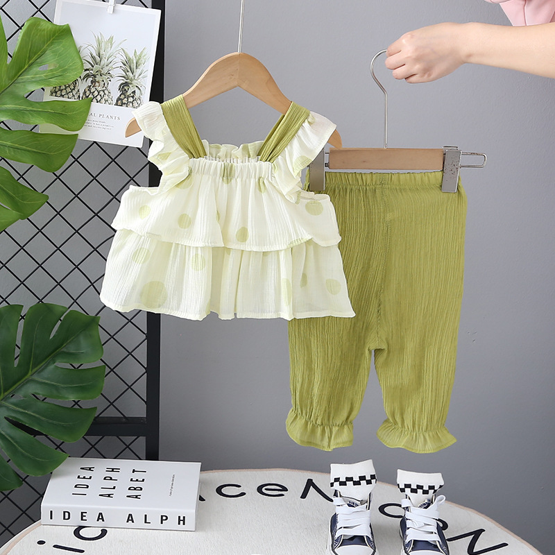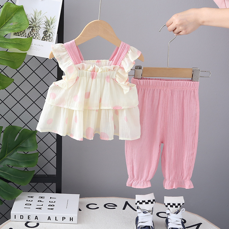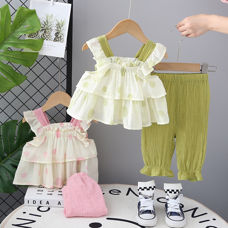 여자 아기의 세련된 드레스와 바지 여름 폴카 도트 달콤한 케이크 드레스 여자 서스펜더 드레스 새로운 투피스 세트