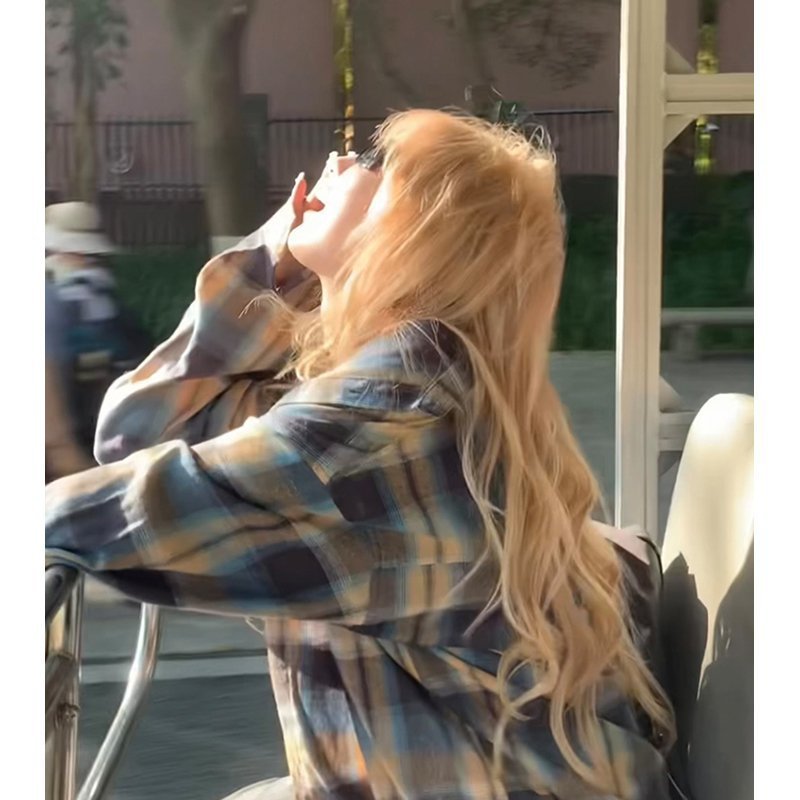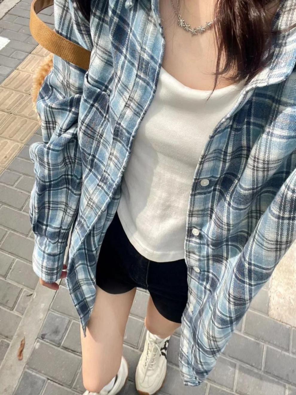 2025 새로운 모리 패셔블 블루 체크 셔츠 재킷 여성의 느슨한 캐주얼 고기 커버 중간 길이 셔츠스토어 가기