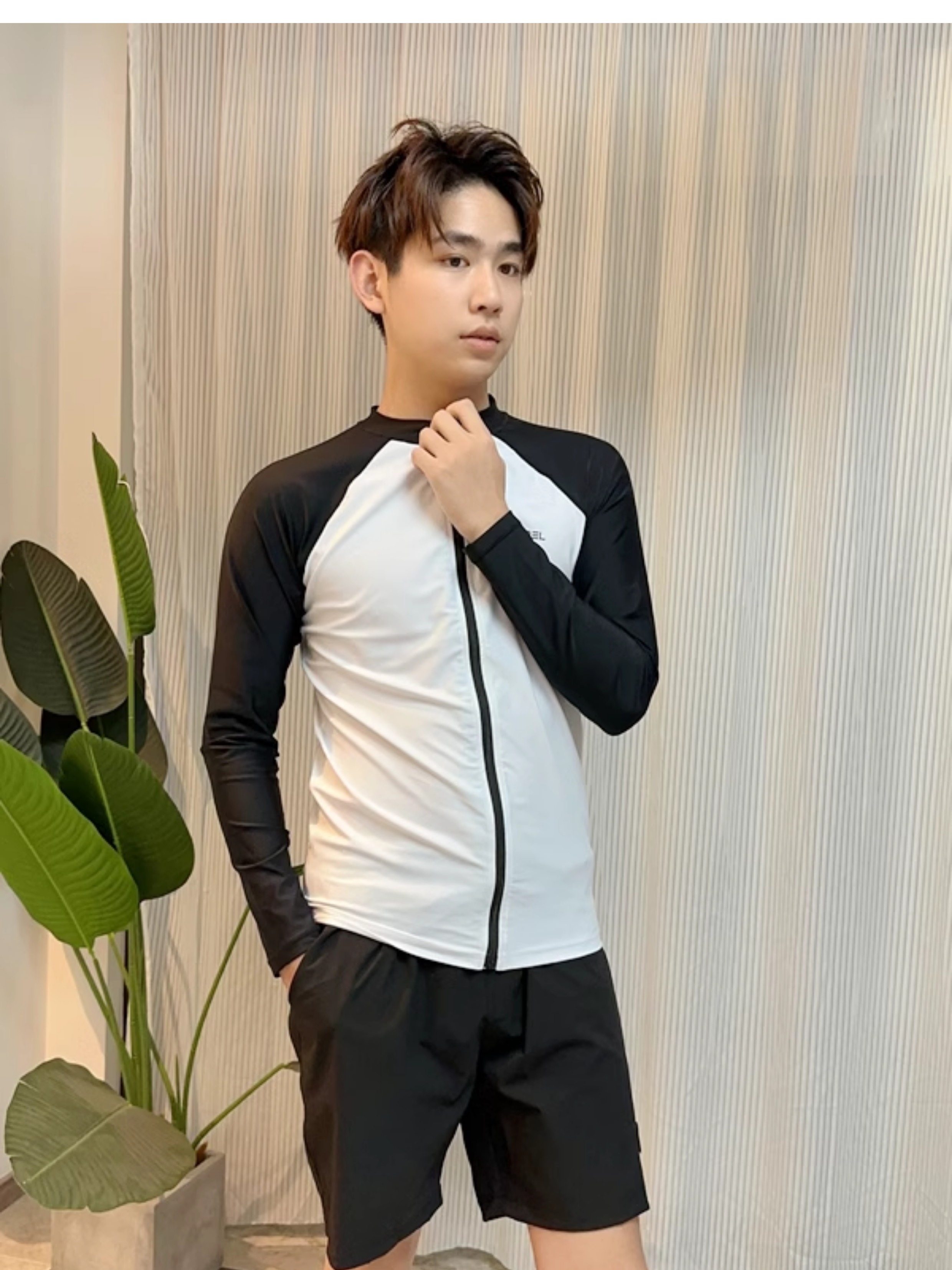• <<남성용 흰색과 검정색 지퍼 탑 + 검정색 반바지 안감 투피스 세트>>