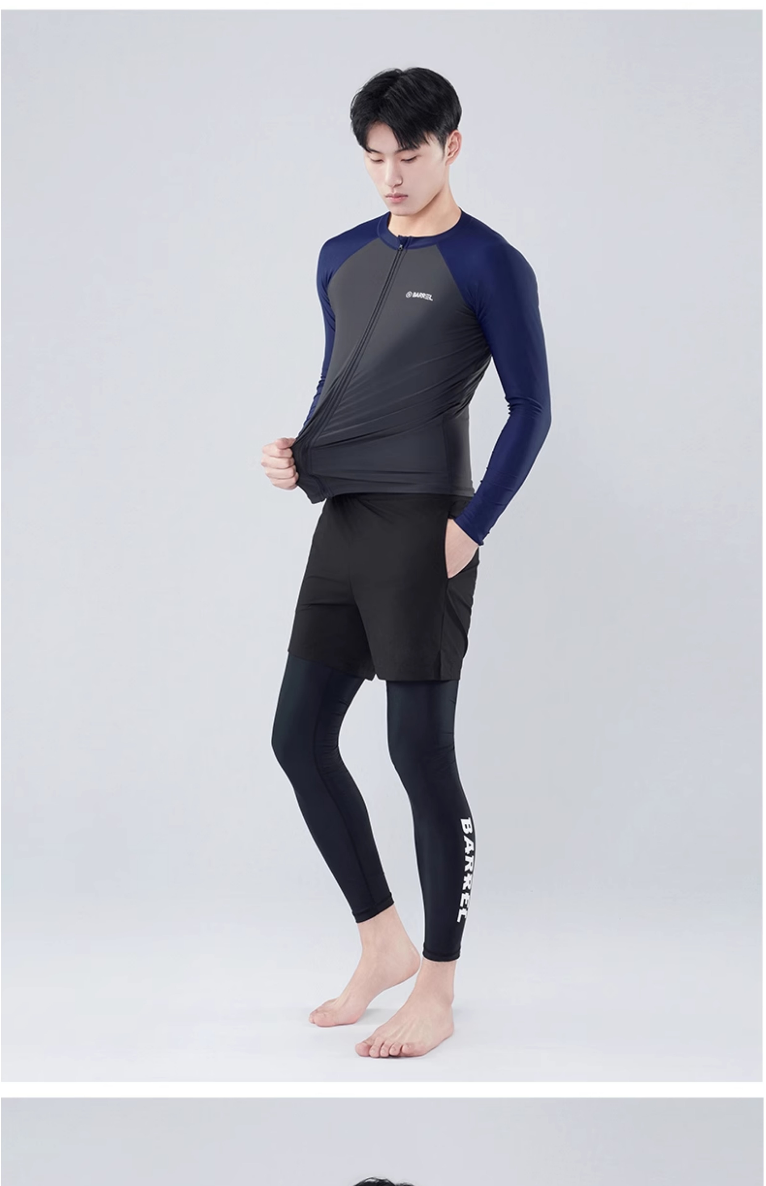 • <<남성용 블루 그레이 지퍼 탑 + 블랙 안감 반바지 투피스 세트>>