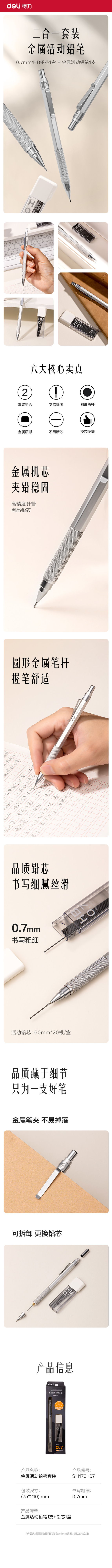 SH170 델리 금속 자동 연필 세트 0.5/0.7mm 초등학생 샤프 펜슬 프레스 연필 심