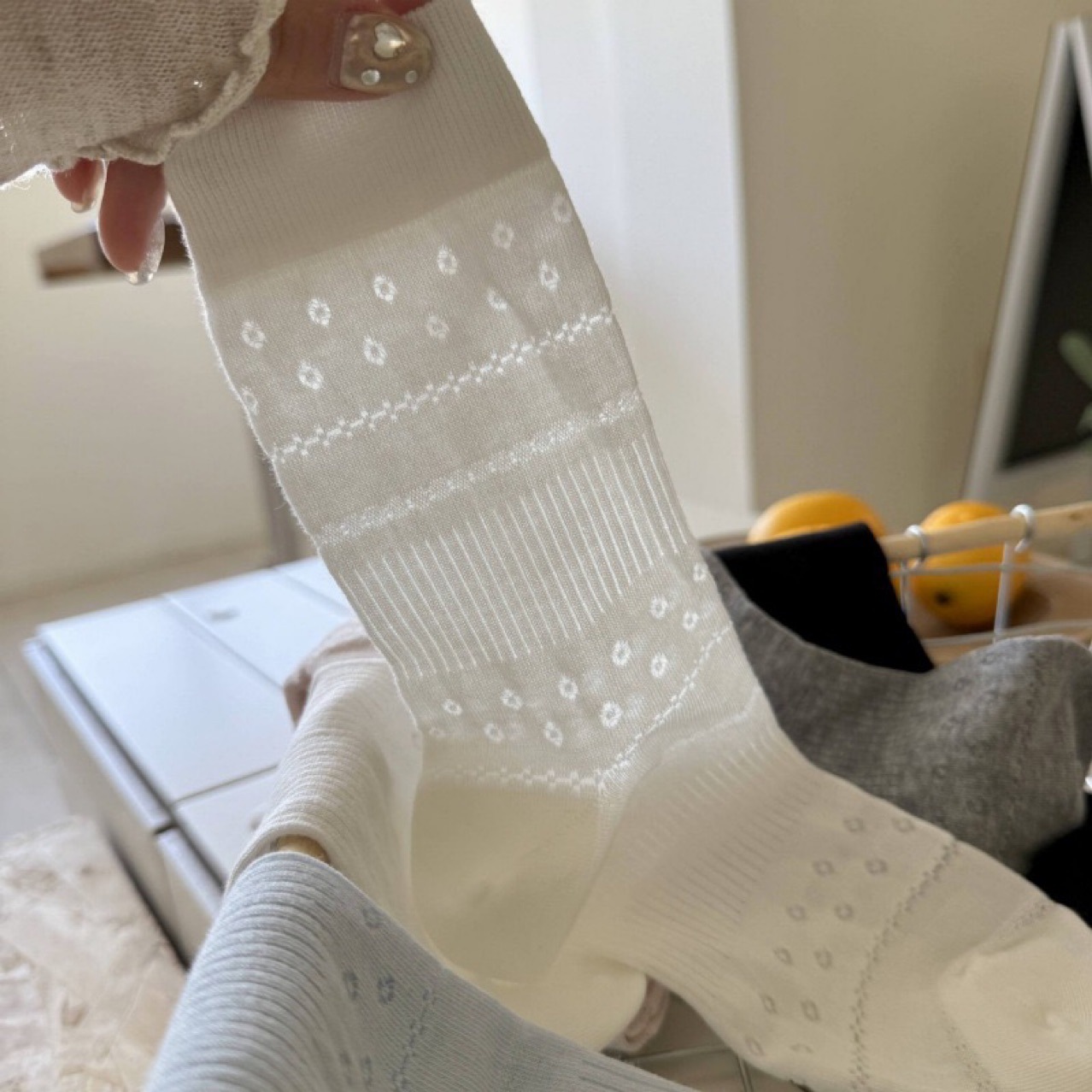 秋冬新品songmu韩国ins灰色丝绒蝴蝶结雪花百搭潮袜棉无骨中筒袜 RMB:4.60