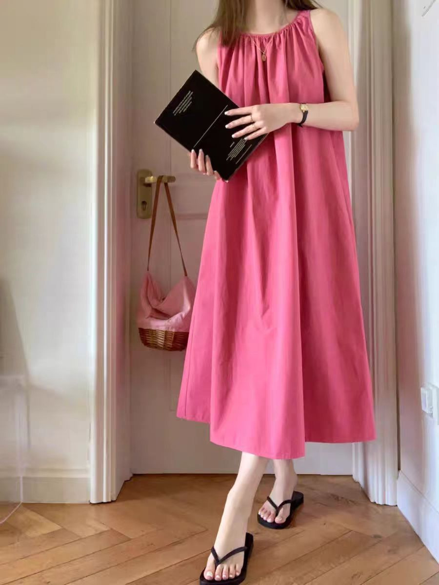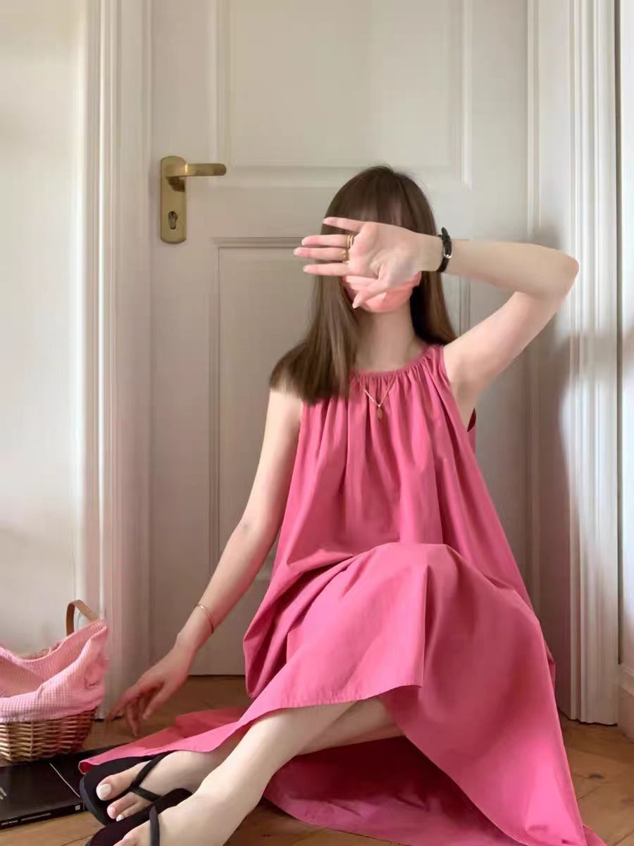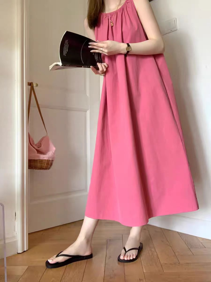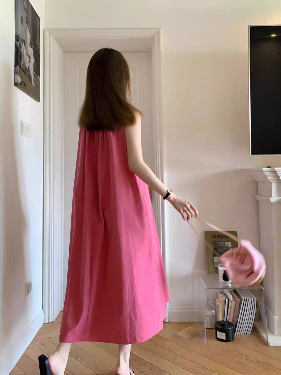 여름 여성을 위한 티 브레이크 프렌치 민소매 서스펜더 드레스, 하이엔드 베스트, A라인 롱 스커트, 화이트 기질, 라즈베리 레드