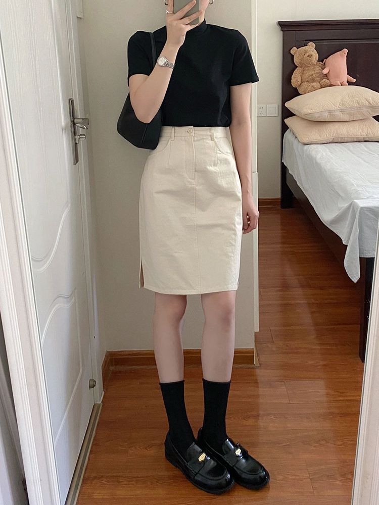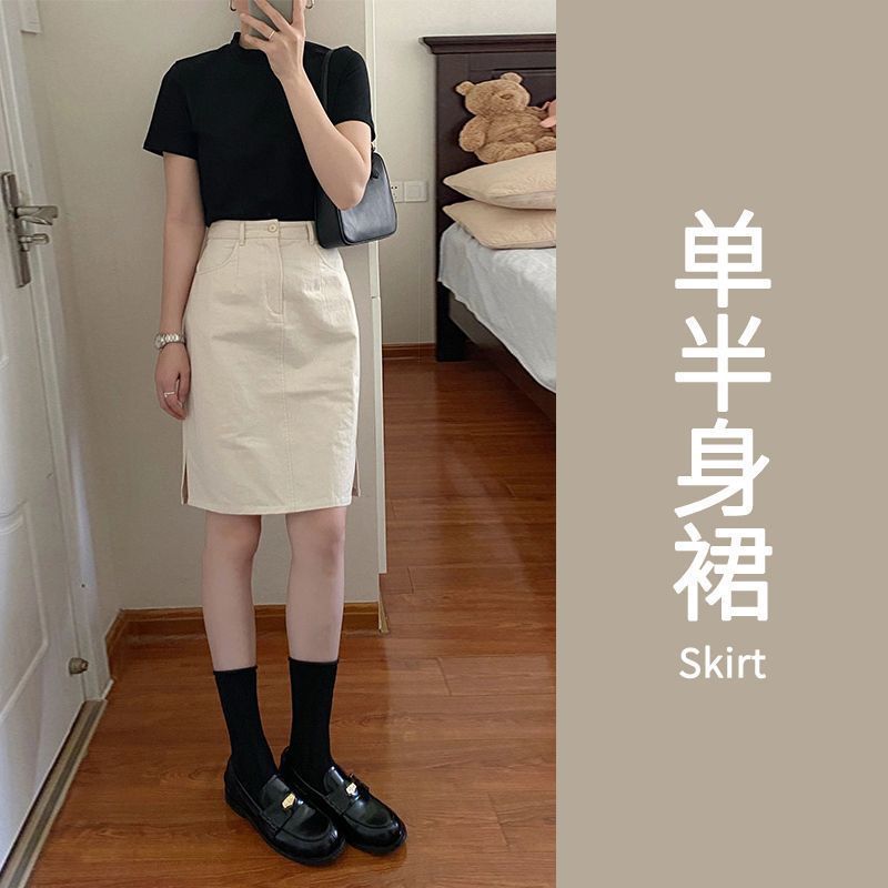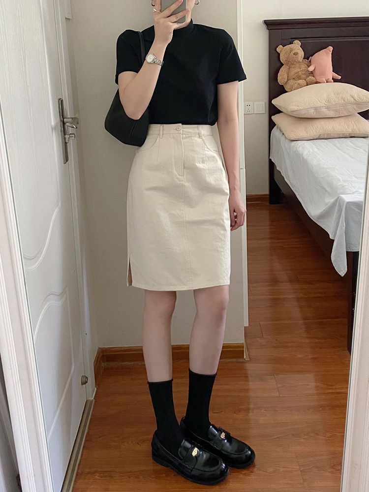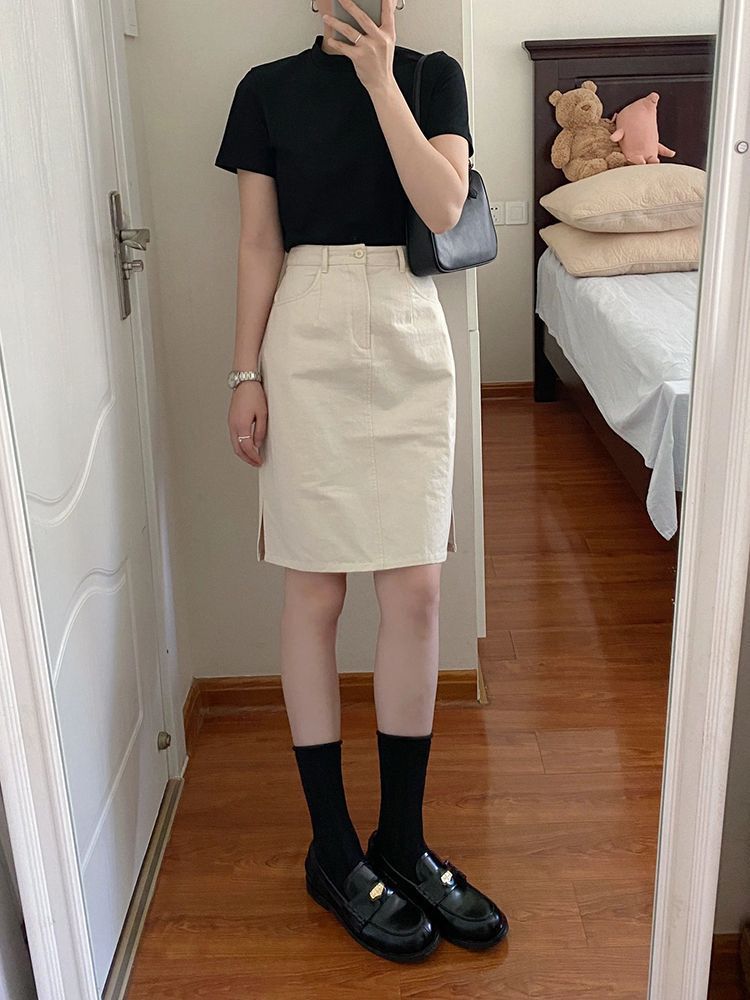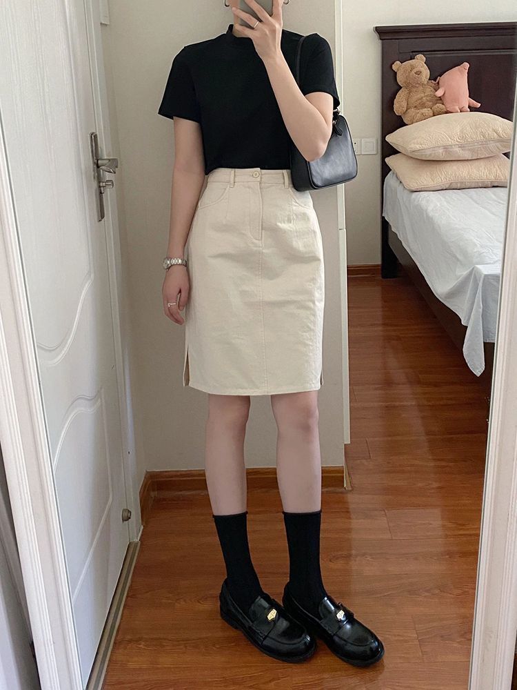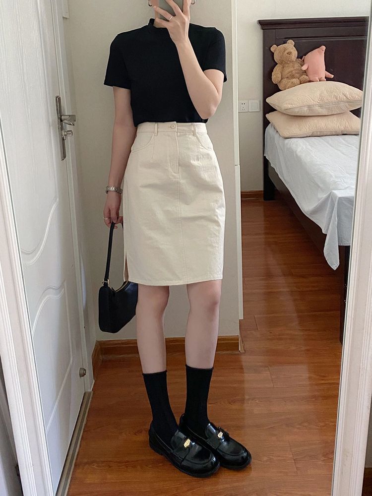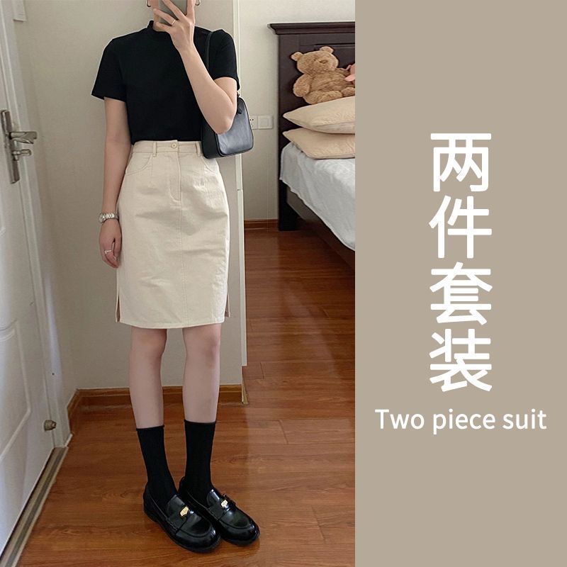 • 투피스 세트 [데님 스커트 + 어깨 블랙 티셔츠]