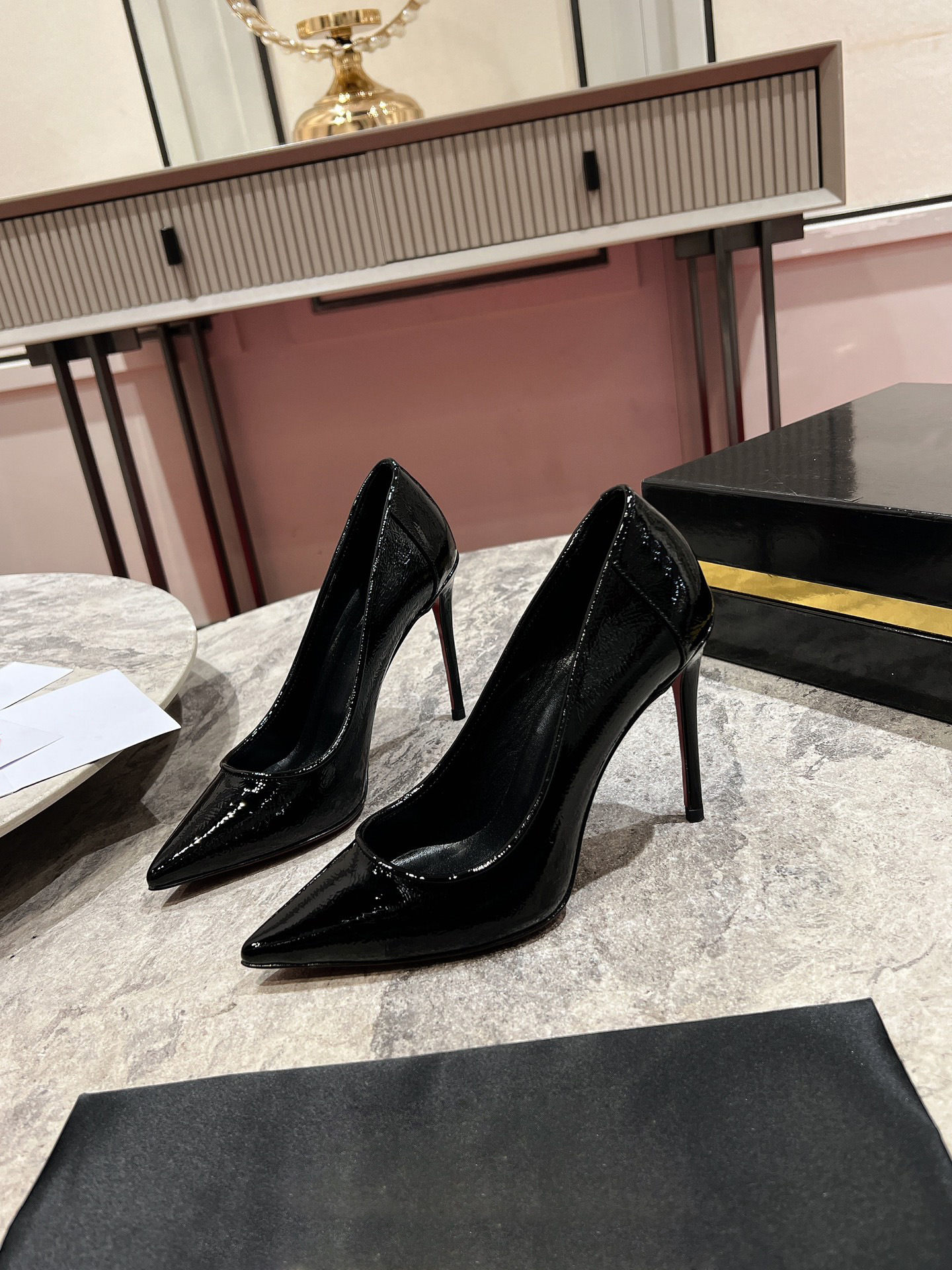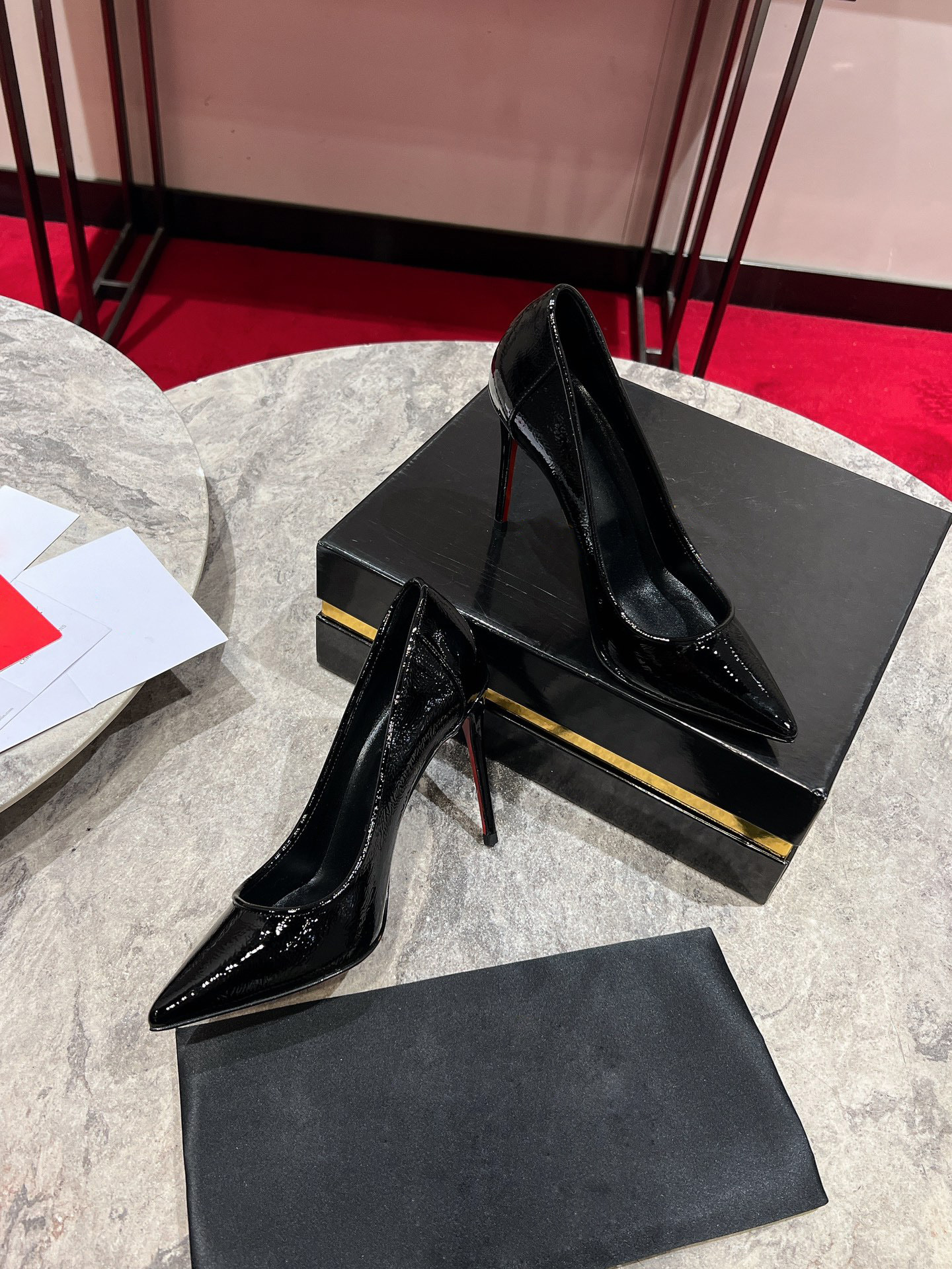 2025 새로운 봄, 가을 뾰족한 발가락 사이드 빈 섹시한 누드 하이힐 여성의 아름다운 스틸레토 힐 블랙 에나멜 가죽 신발스토어 가기