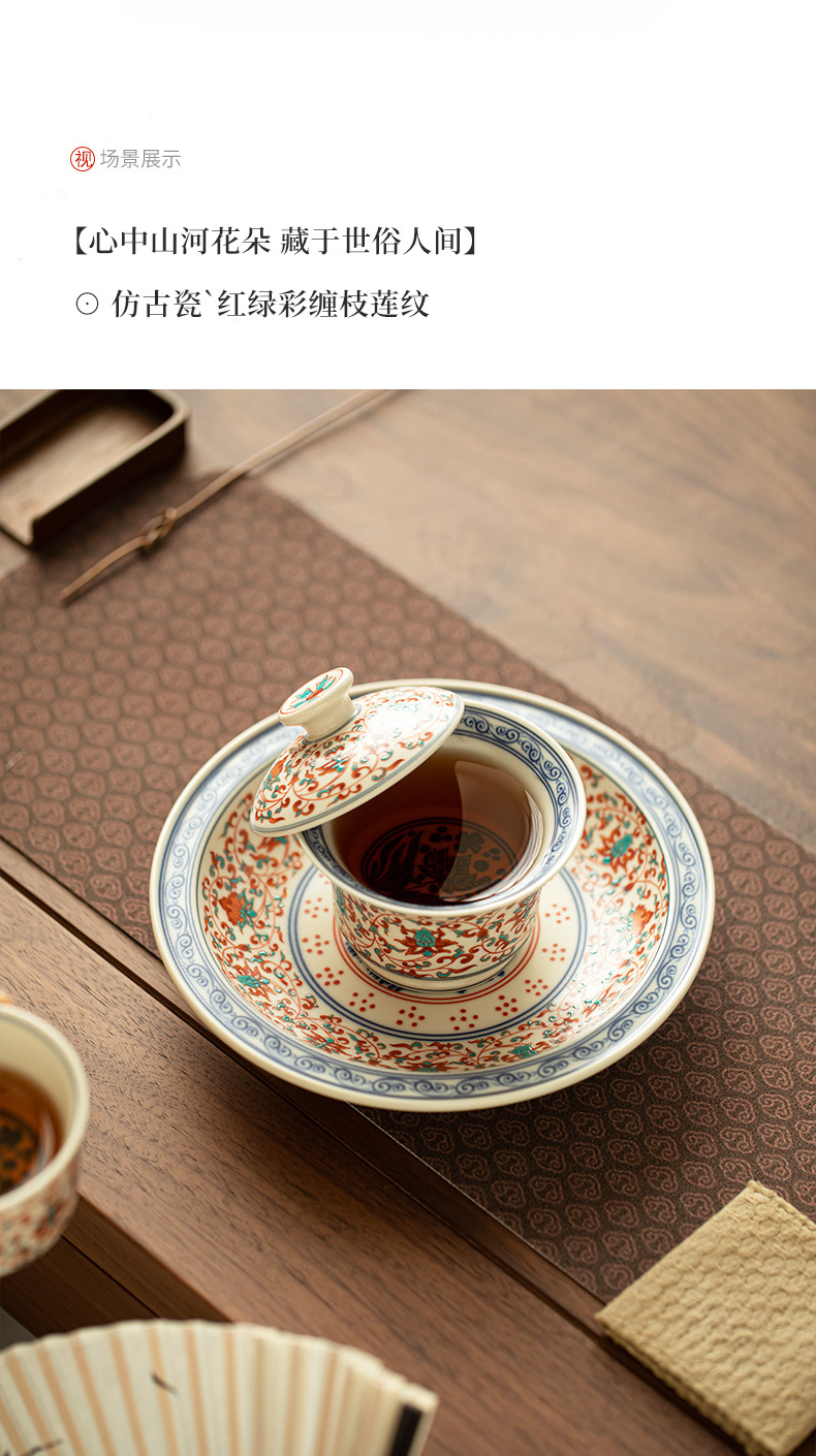 • 골동품 도자기 - 빨간색과 녹색 색상의 연꽃 문양이 있는 두 개의 그릇(간단한 장식)