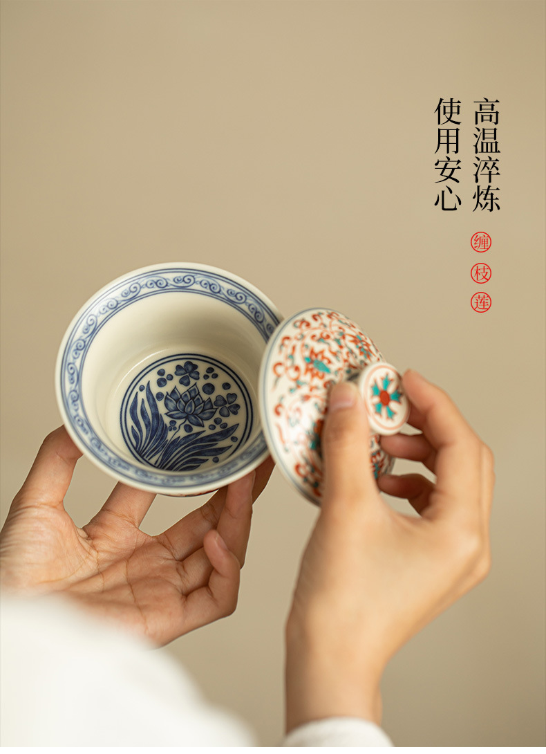 • 골동품 도자기 - 빨간색과 녹색 색상의 연꽃 패턴 호버링 말굽 Sancai 덮은 그릇(간단한 장식)