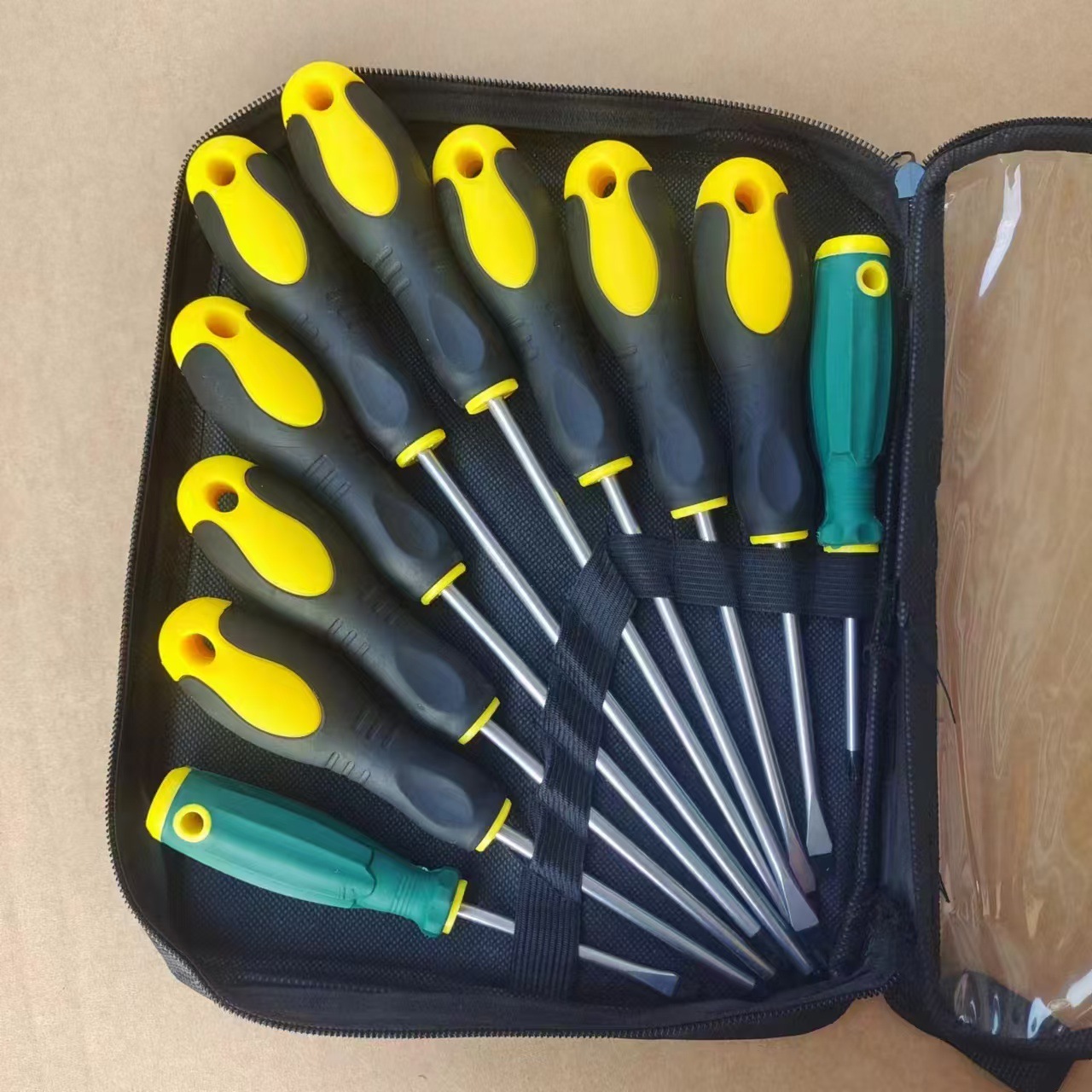 十把螺丝刀组成,组套套袋一面帆布结实耐用,一面透明好看精巧,是一款十分经济实惠耐用好用的多功能家用维修组套工具。