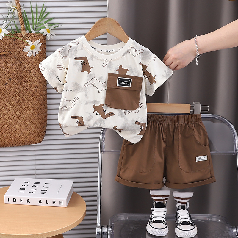 소년 여름 정장 2025 새로운 아기 어린이 얇은 라운드 넥 셔츠 만화 반팔 반바지 투피스 세트 유행 배송