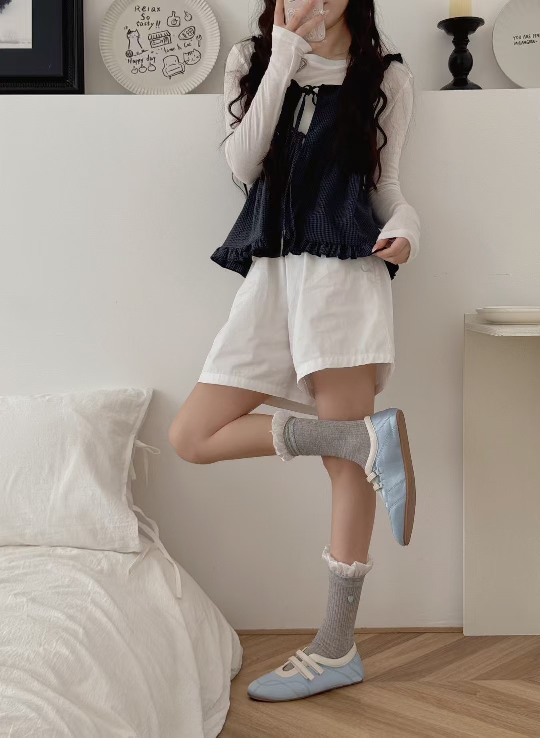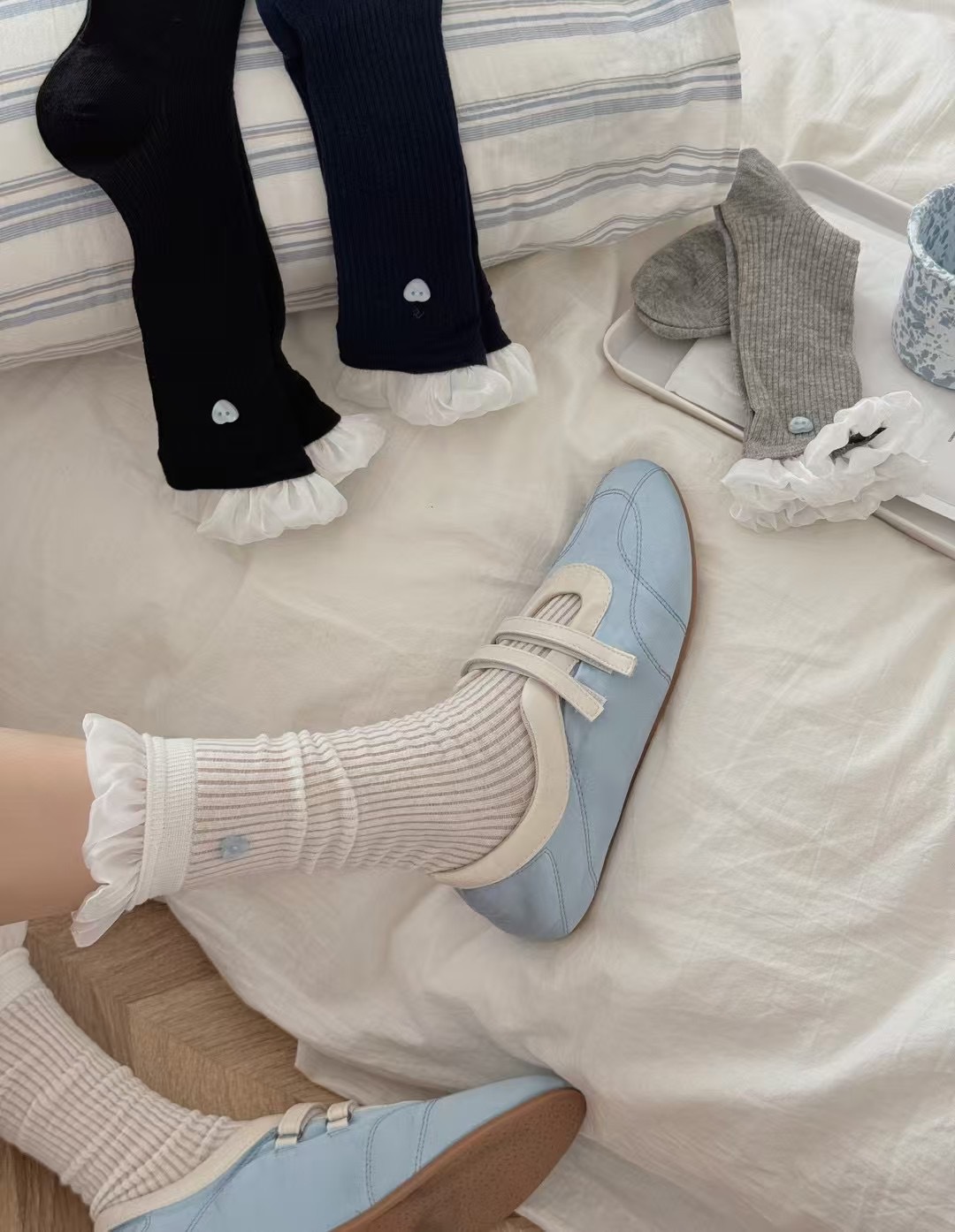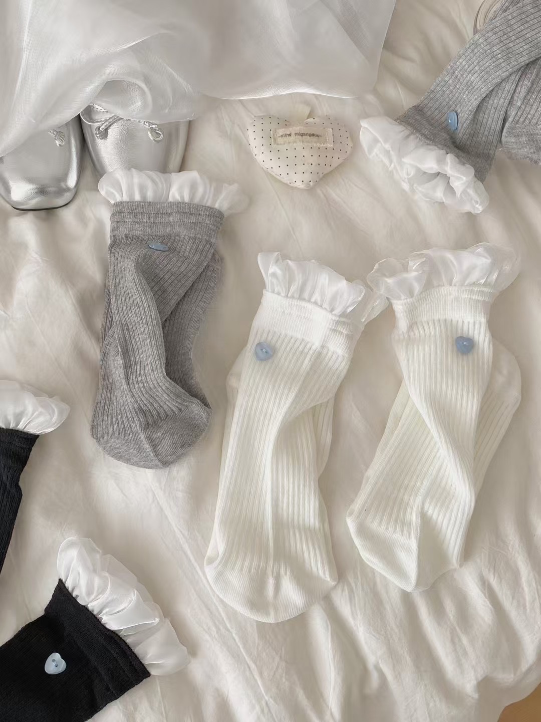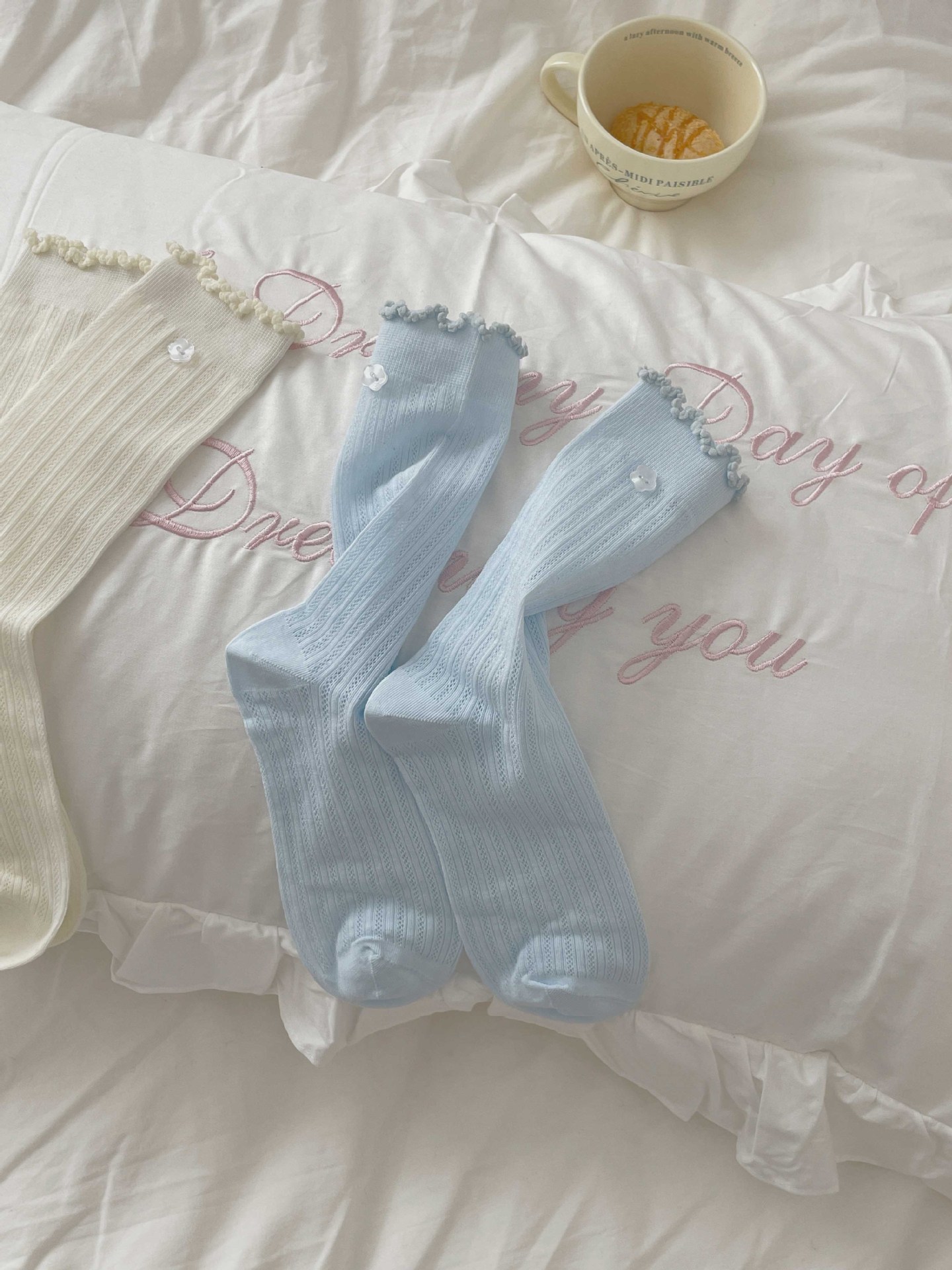 藏青ins日系复古格纹花边纽扣女袜珍珠袜口蝴蝶结堆堆袜藏青合集 RMB:5.00