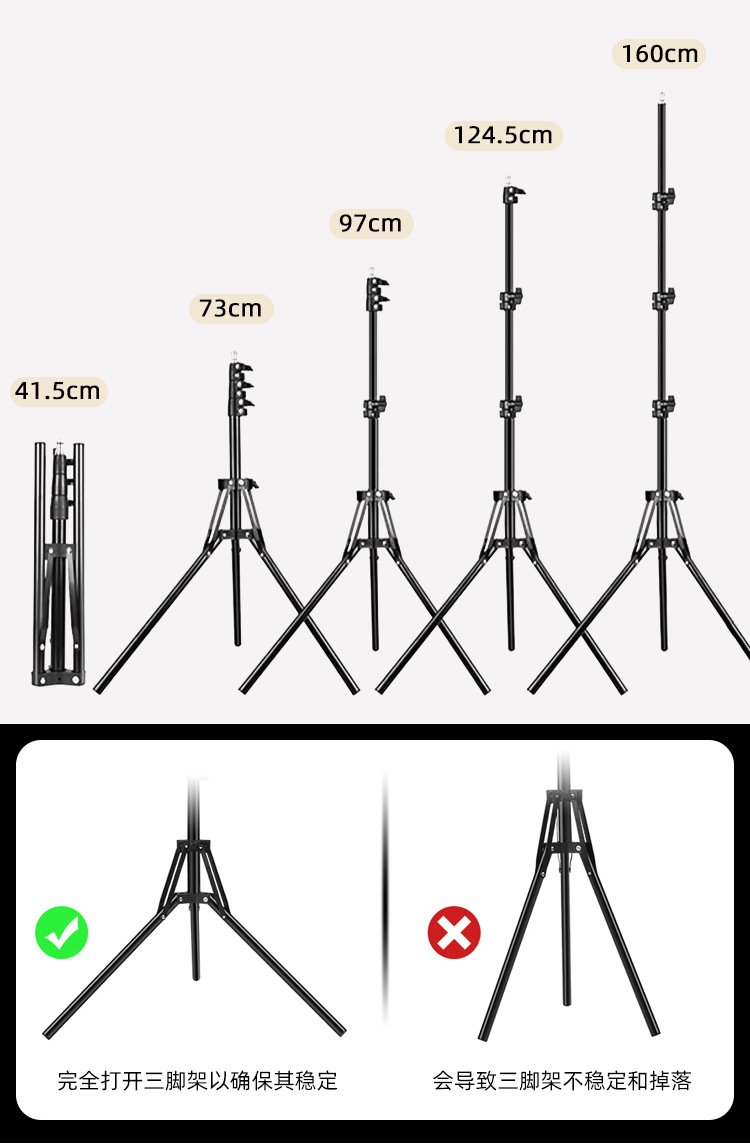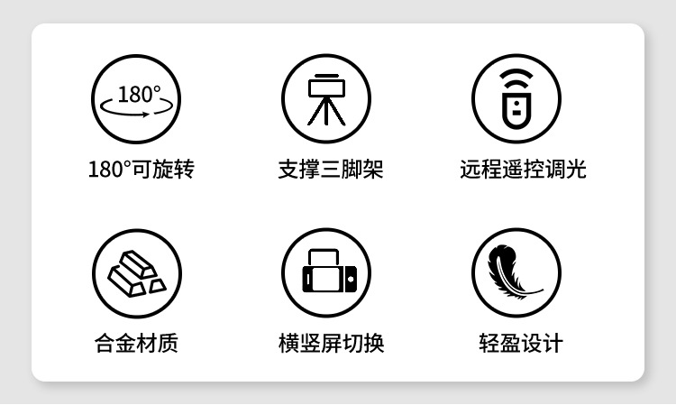 • 1.6m 반사 브래킷 + 360도 조정 가능한 팬/틸트 + 휴대폰 및 태블릿 이중 목적 클립 + 블루투스
