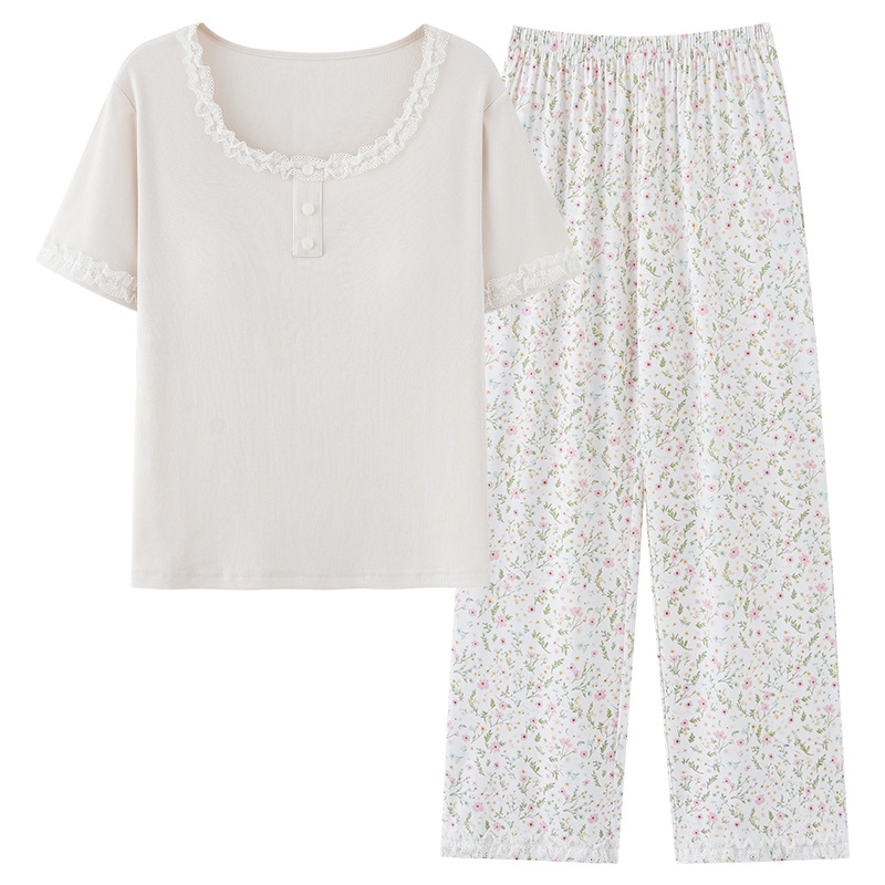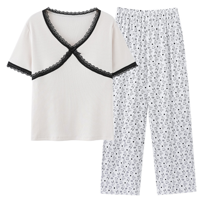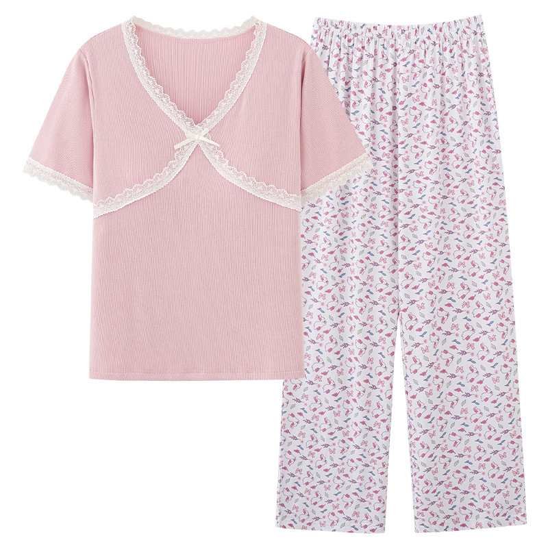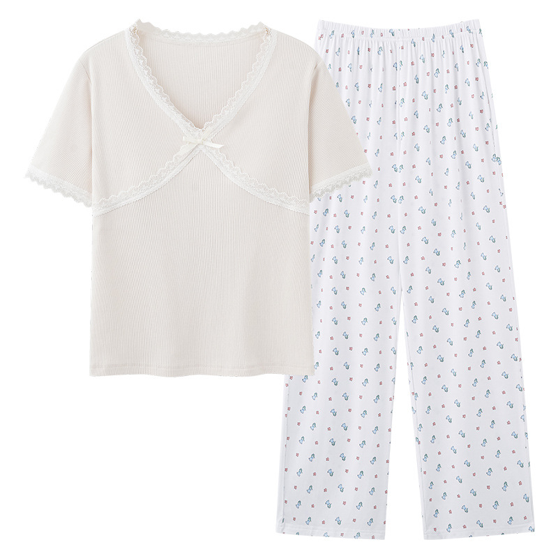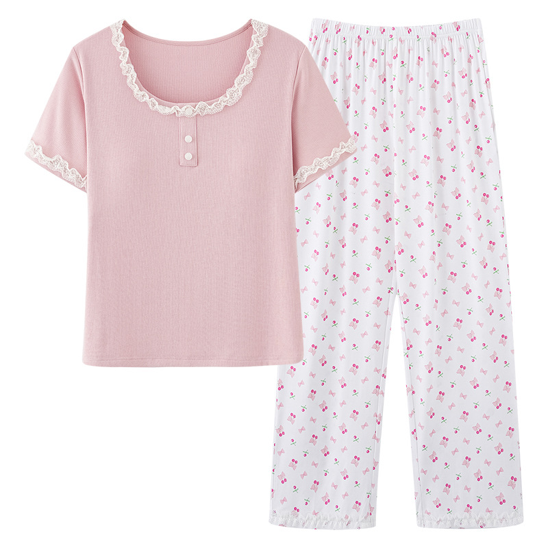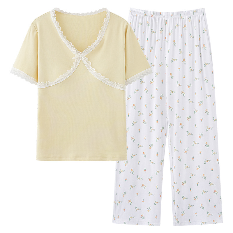 [가슴 패드와 함께] 잠옷 여성 여름 쿨 아이스 실크 반팔 바지 세트 간단한 하이 엔드 외부 옷을 입고스토어 가기