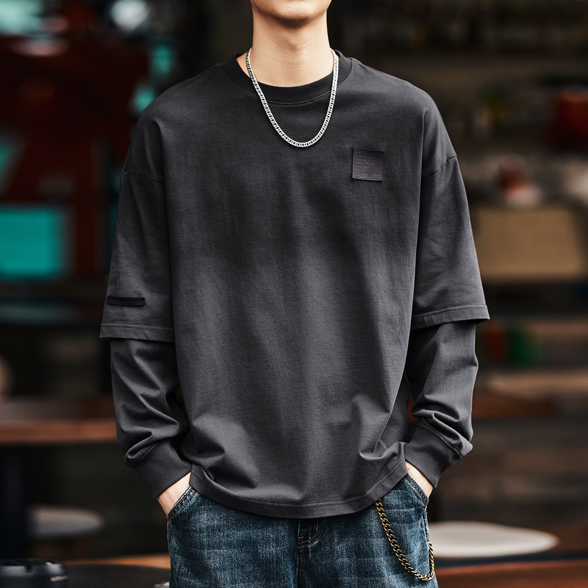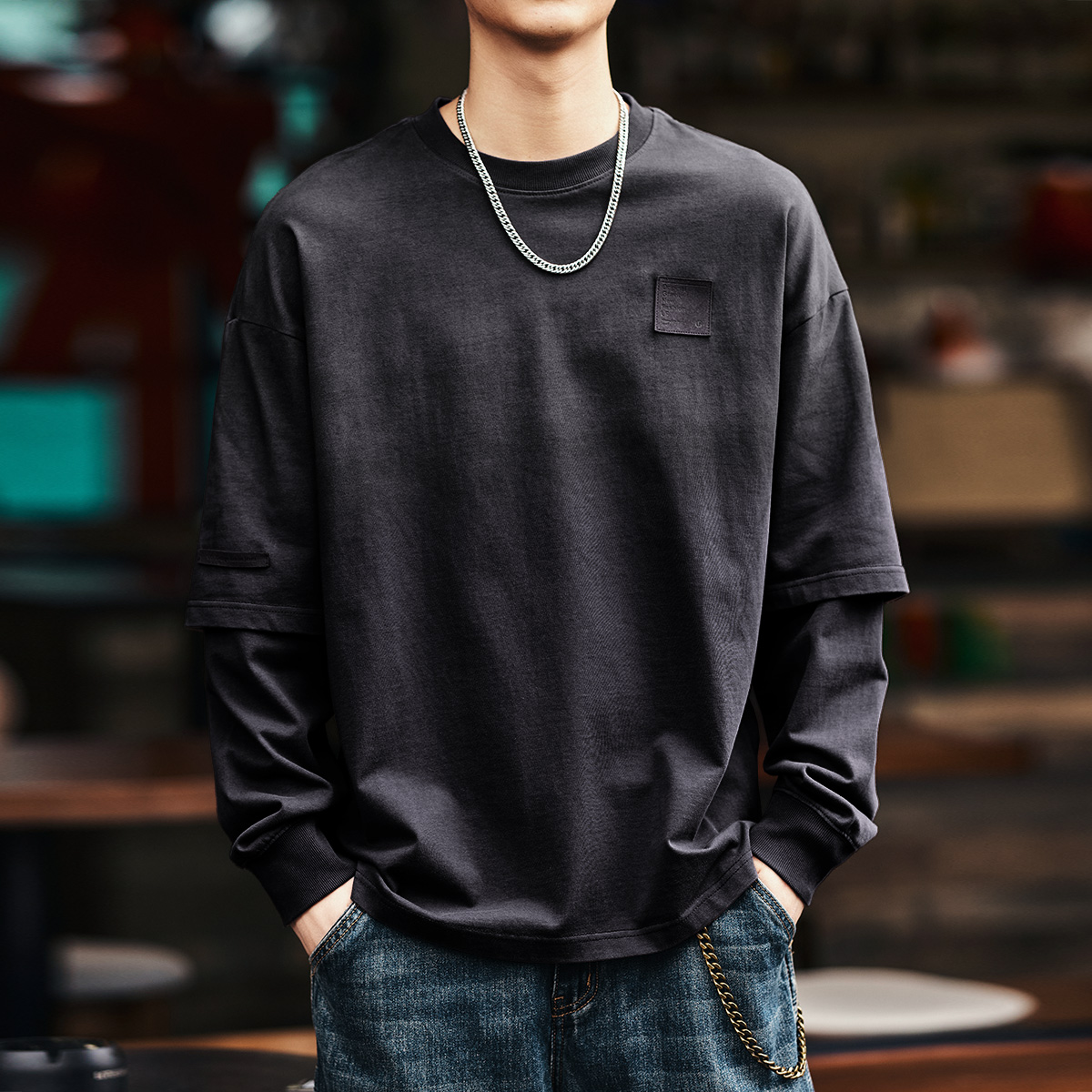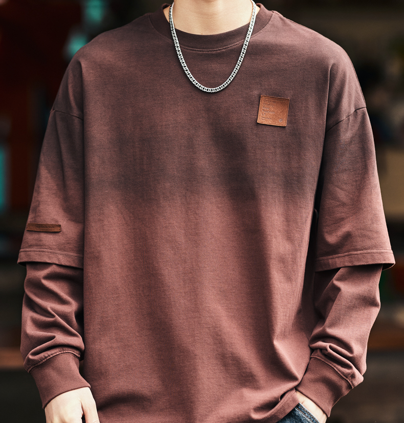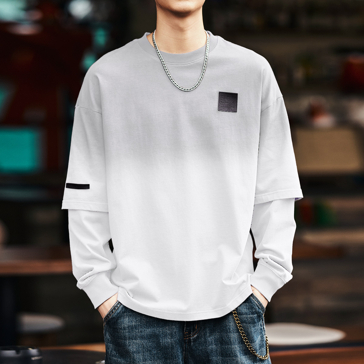 Gelan Deer 빈티지 그라디언트 와시 가짜 투피스 긴팔 티셔츠 남성용 봄과 가을 트렌디 브랜드 루즈 캐주얼 티셔츠