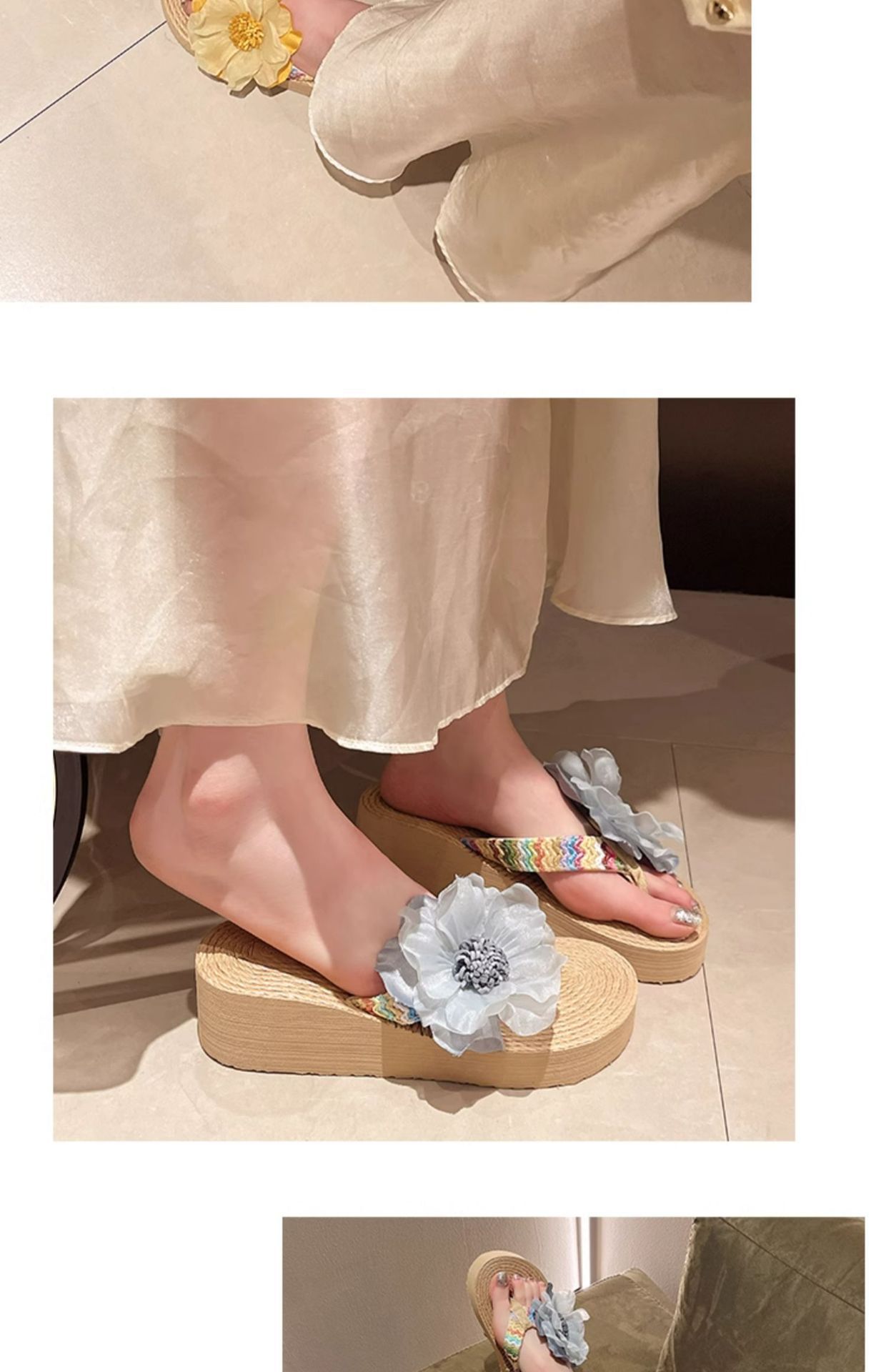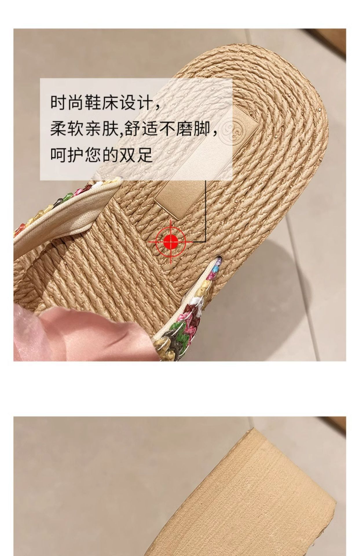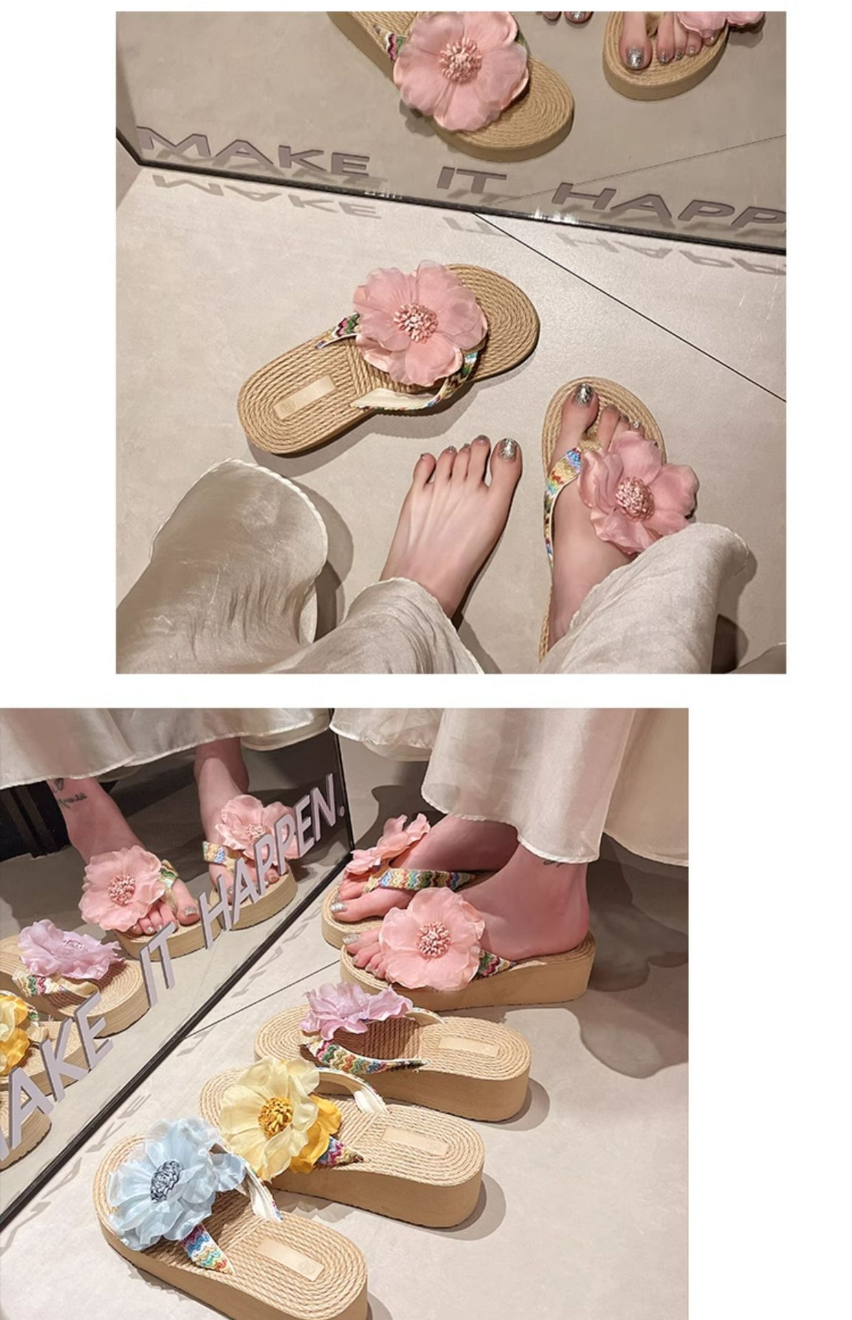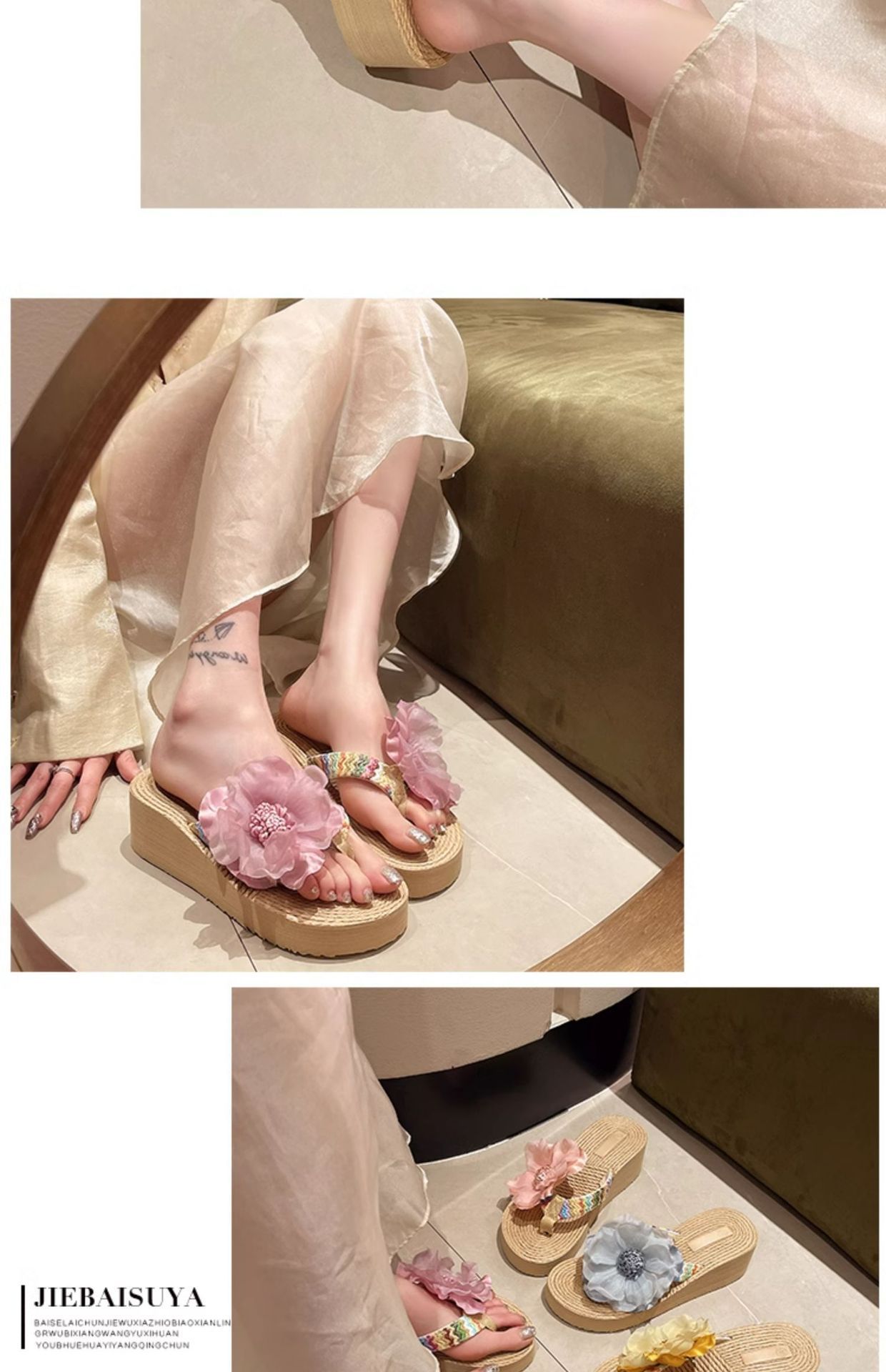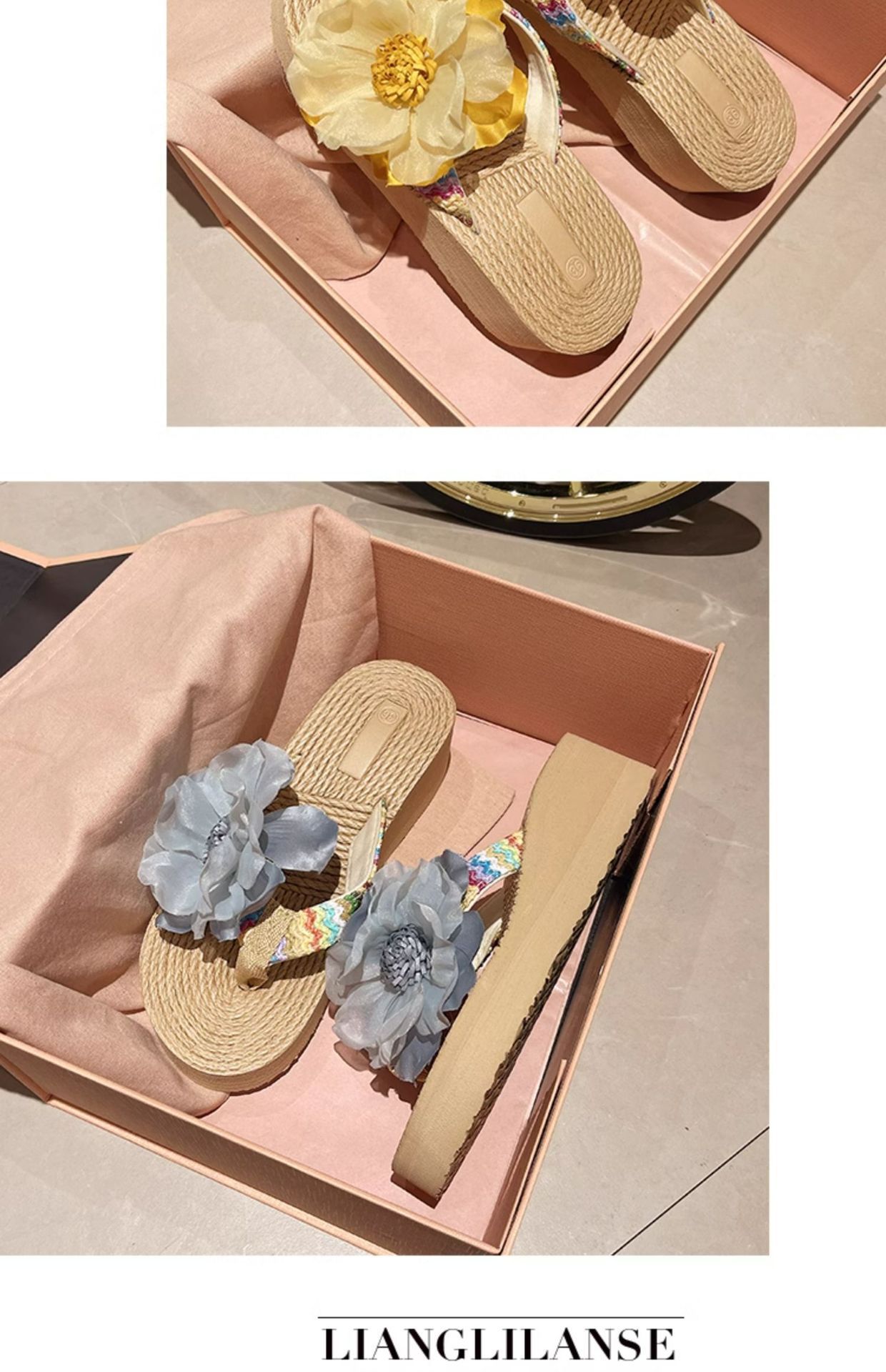 Xiaozhong 새로운 요정 바람 쐐기 플립 플롭 여성 여름 패션 밀짚 꽃 두꺼운 바닥 목회 휴가 비치 신발