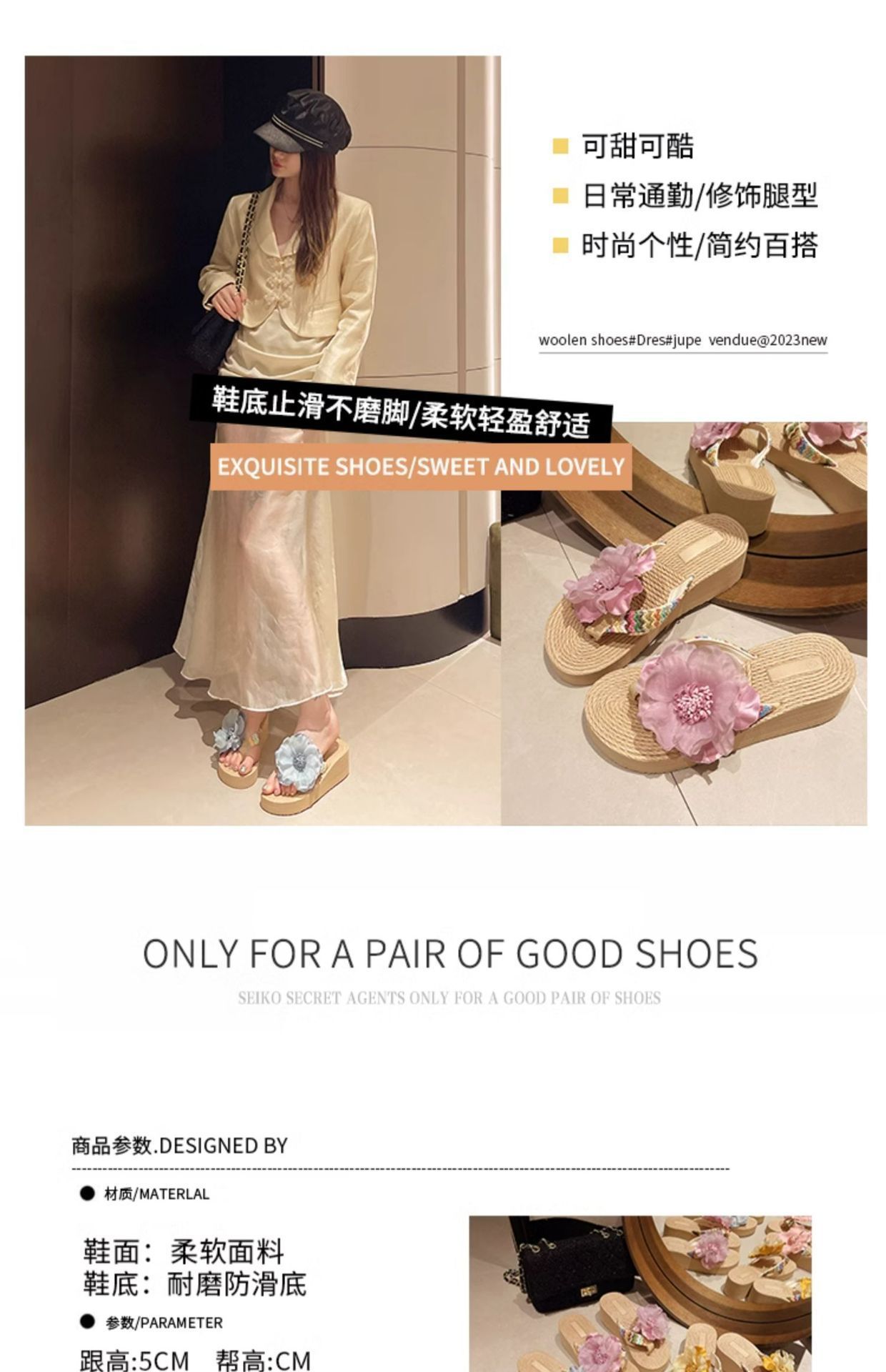 Xiaozhong 새로운 요정 바람 쐐기 플립 플롭 여성 여름 패션 밀짚 꽃 두꺼운 바닥 목회 휴가 비치 신발스토어 가기