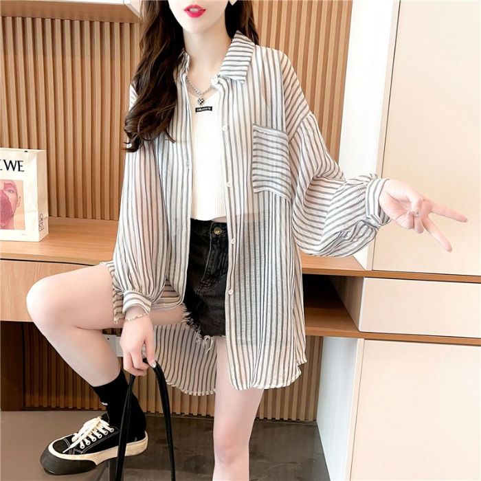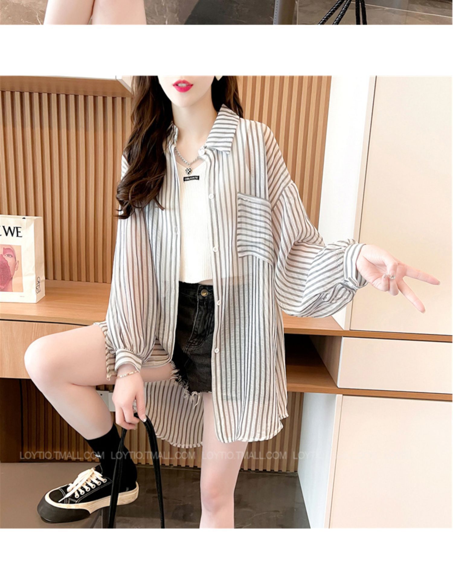시폰 스트라이프 긴소매 중장 태양 보호 의류 여성 봄 가을 플러스 사이즈 셔츠 코트 한국식 루즈 패션 올매치