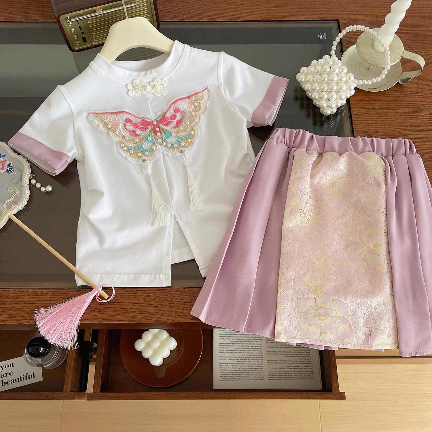소녀 세트 새로운 중국 스타일 중국 스타일 2025 새로운 여름 나비 자수 어린이 짧은 소매 주름 치마 투피스 세트