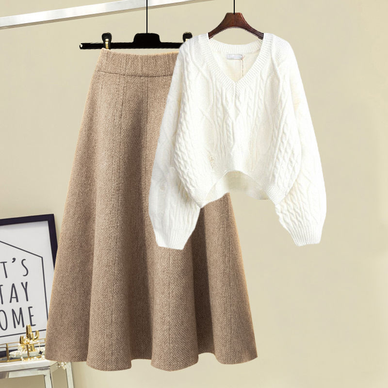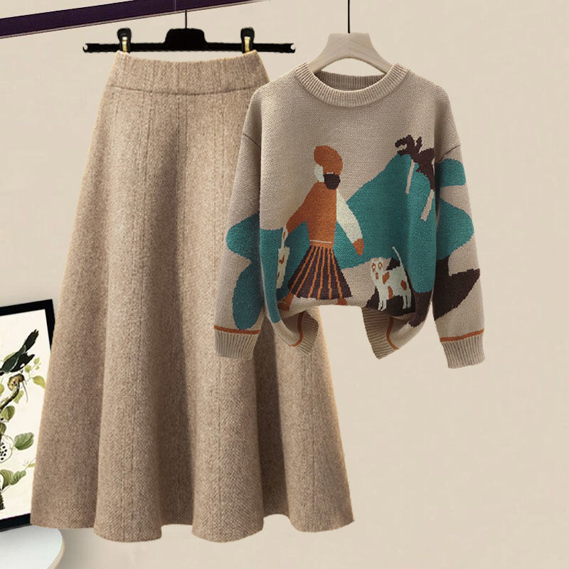 • 살구 스커트 + 카키색 스웨터 [투피스세트]