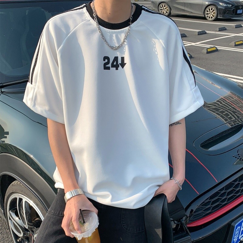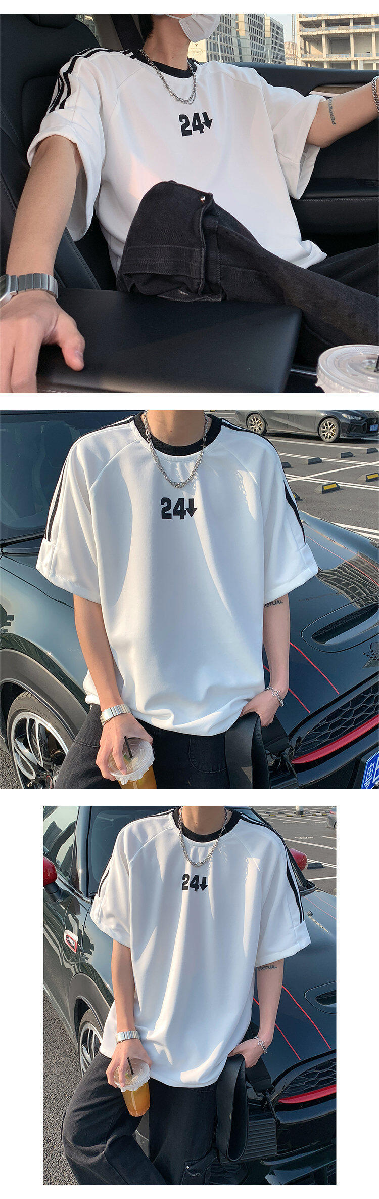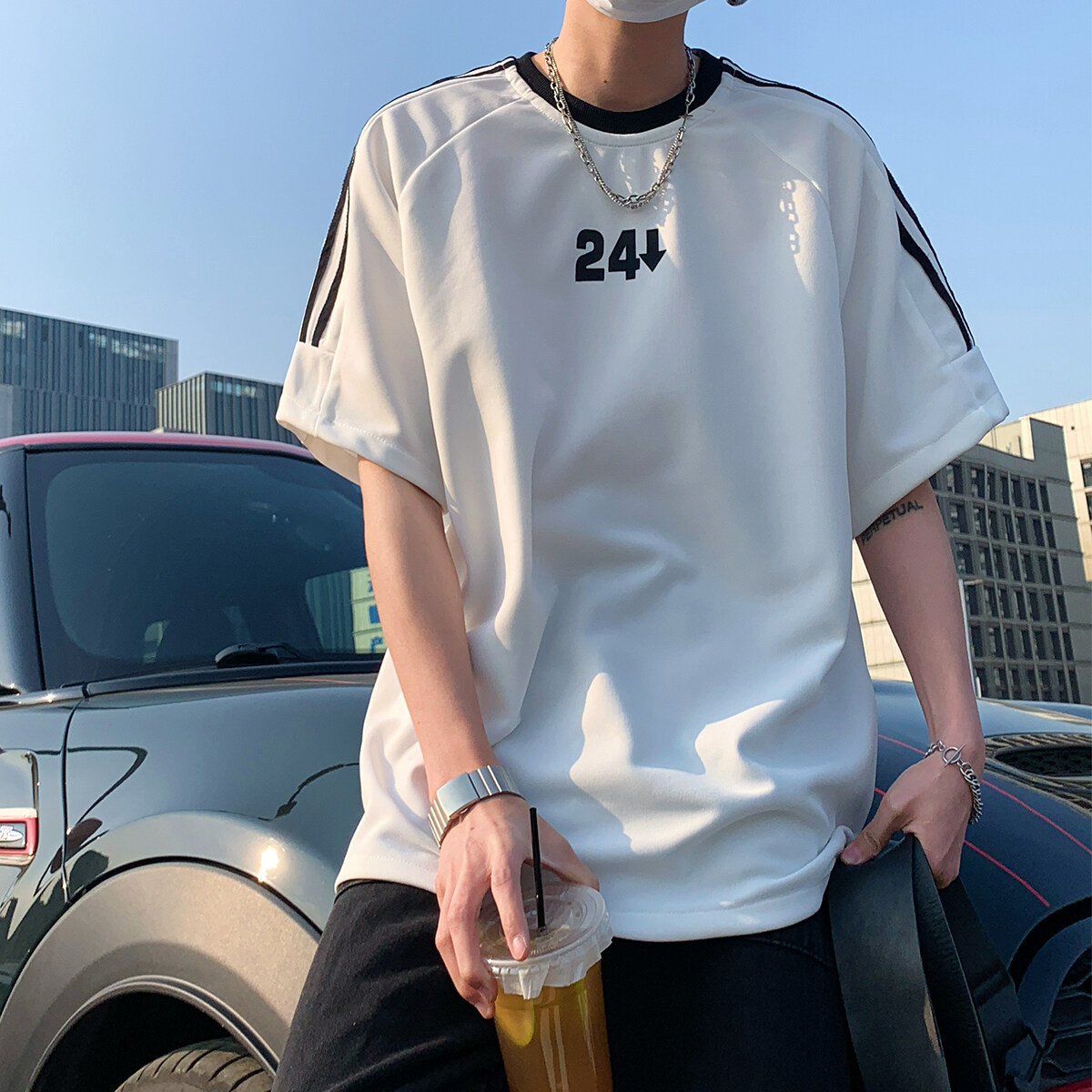 웨빙 스플라이스 반팔 티셔츠 남성 여름 플러스 사이즈 트렌디 브랜드 뚱뚱한 남자 루즈 스포츠 티셔츠 홍콩 스타일 반팔 얇은 스타일스토어 가기