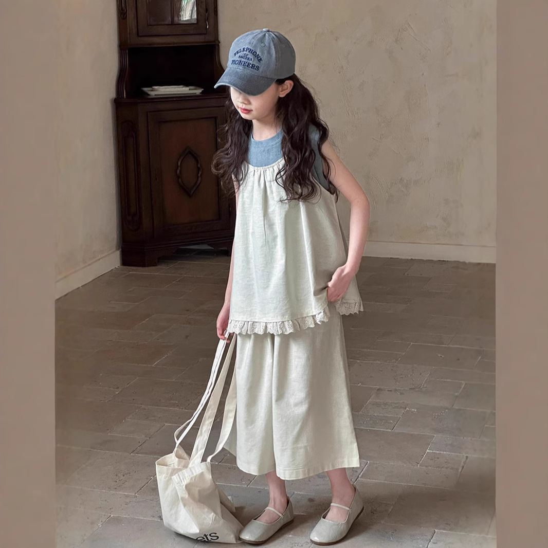 소녀 세트 여름 2025 새로운 세련된 패션 스트랩 짧은 소매 중대형 어린이 캐주얼 와이드 다리 바지 3 조각 트렌디