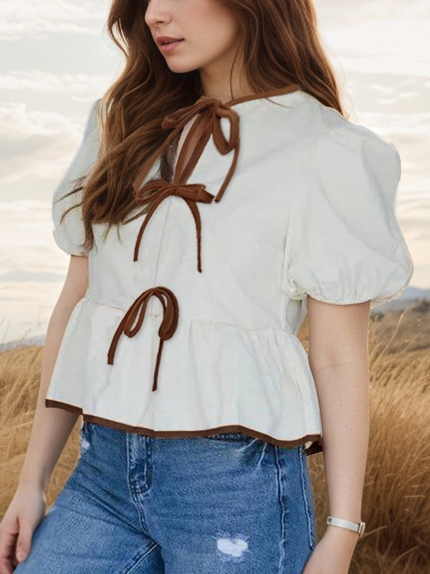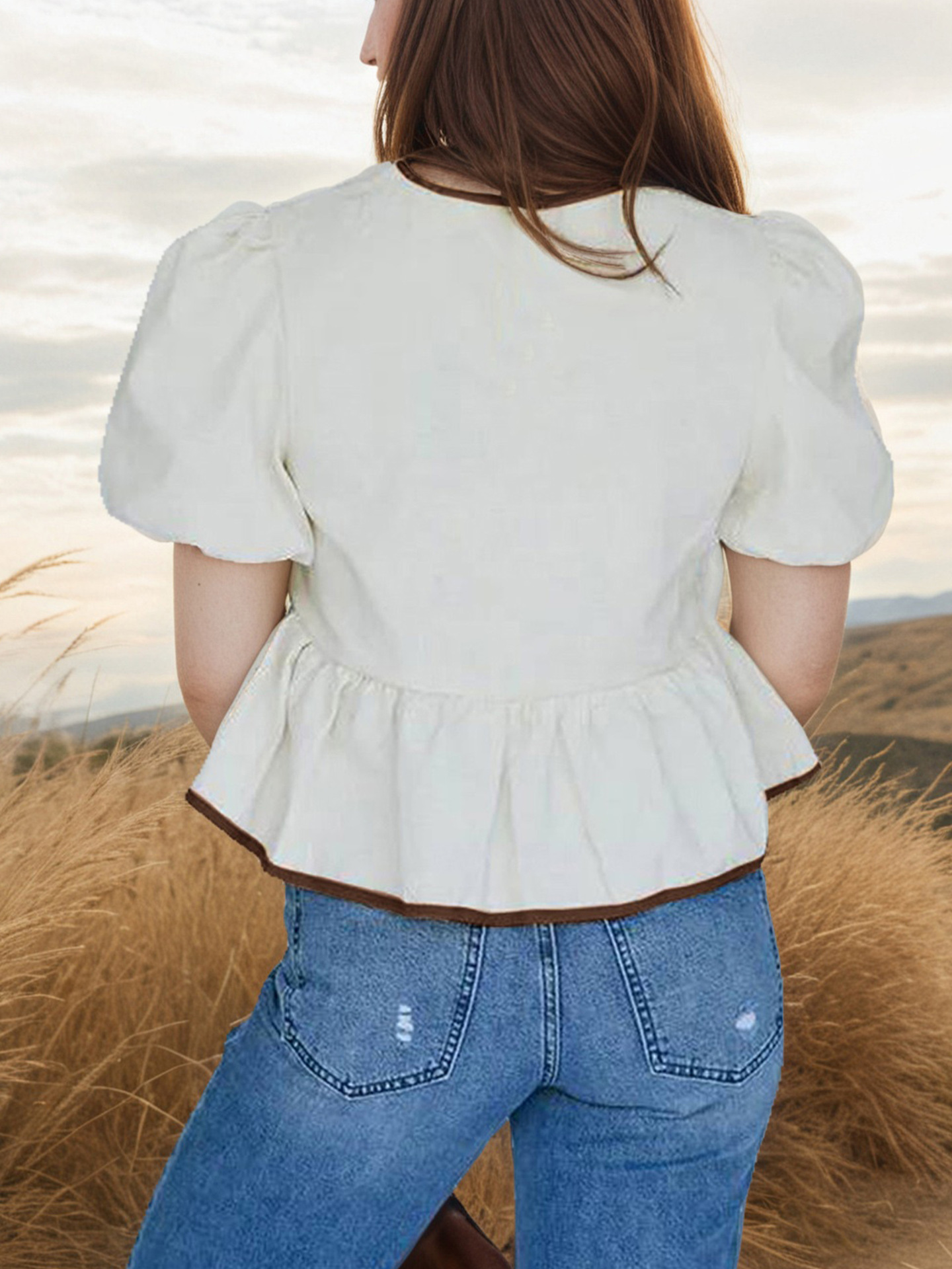 유럽과 미국의 대외 무역 여성 의류 아마존 새로운 여성 복고풍 스타일 활 디자인 느슨한 거품 소매 셔츠 짧은 소매