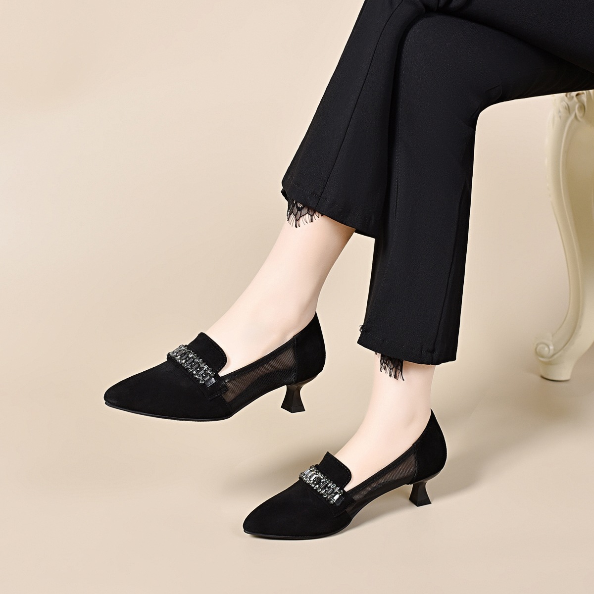 뾰족한 하이힐 여성 2025 봄 라인스톤 메쉬 작은 신발 낮은 입 슬립 온 패션 신발 스틸레토 힐 원피스 신발스토어 가기