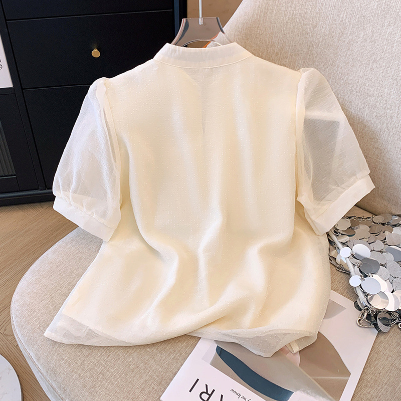 새로운 중국 스타일 국가 스타일 자수 쉬폰 반팔 셔츠 여성용 여름 플러스 사이즈 통통녀 슬리밍 작은 셔츠 버클