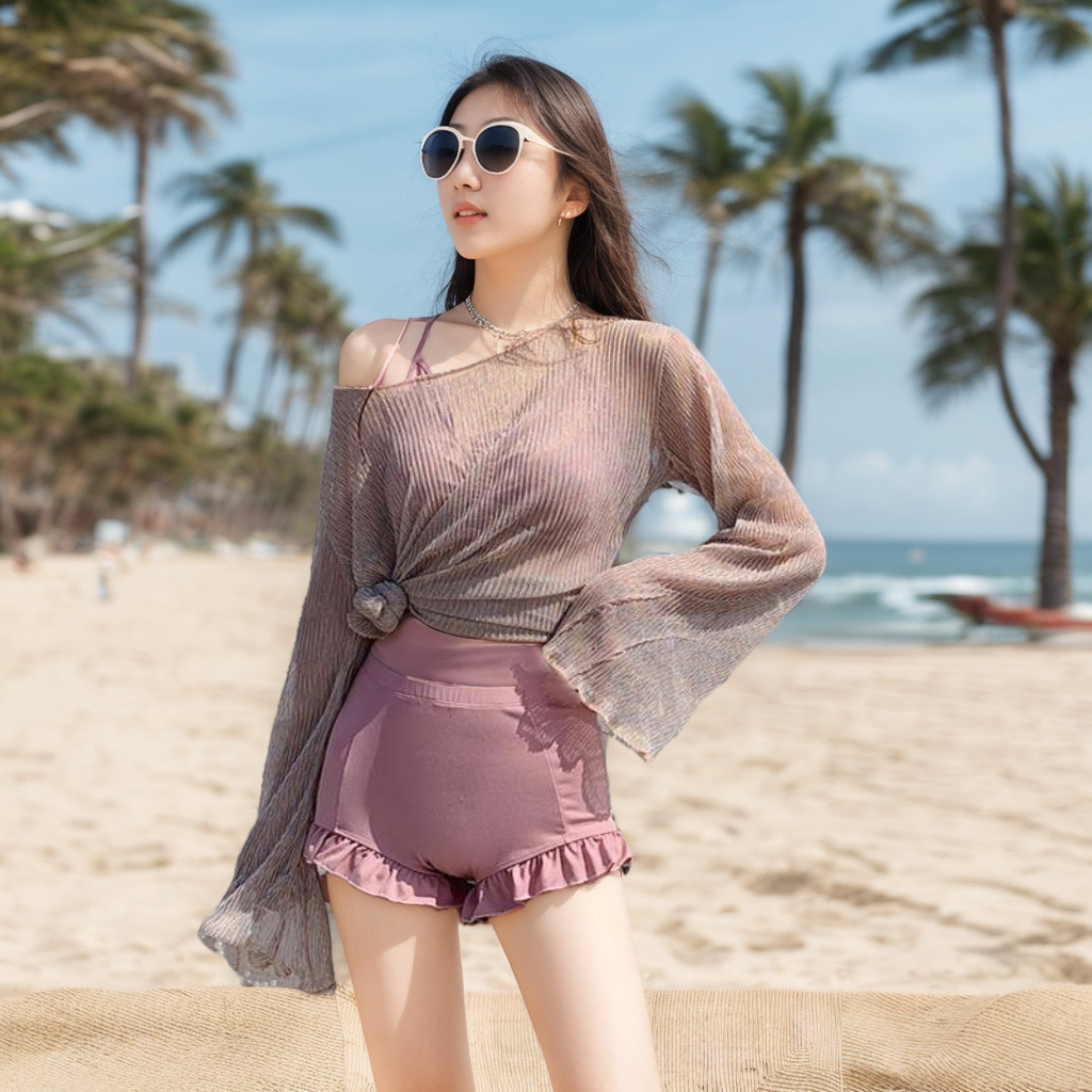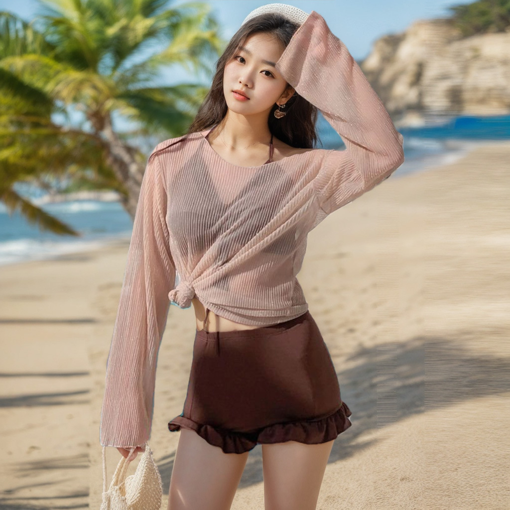 2025 여성 수영복 한국어 ins 섹시 슬리밍 배 커버 스플릿 비키니 비키니 3 피스 긴팔 수영복
