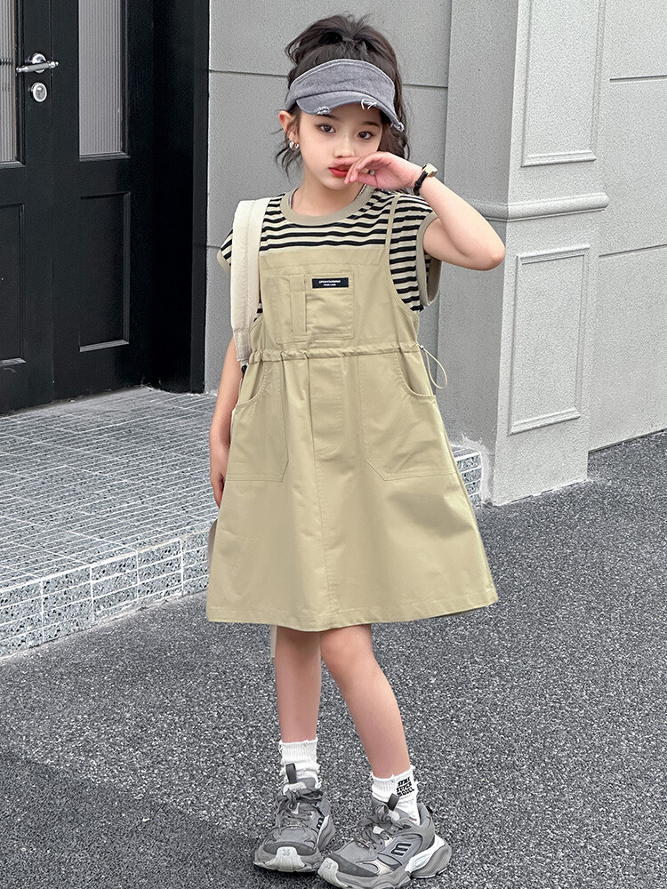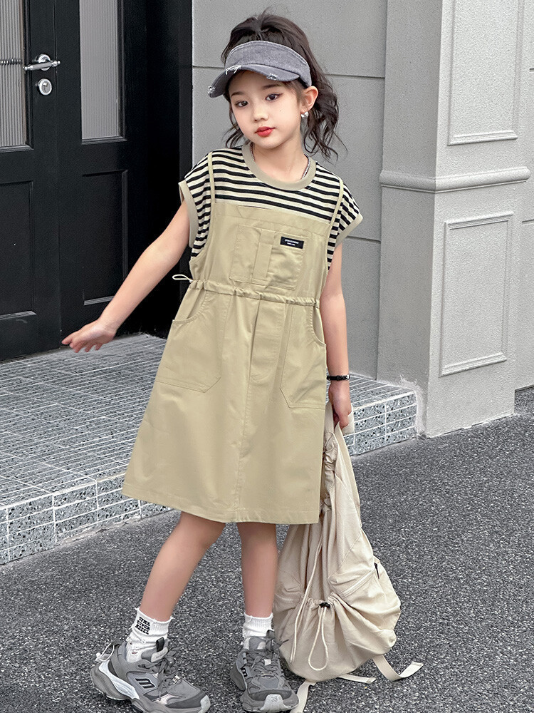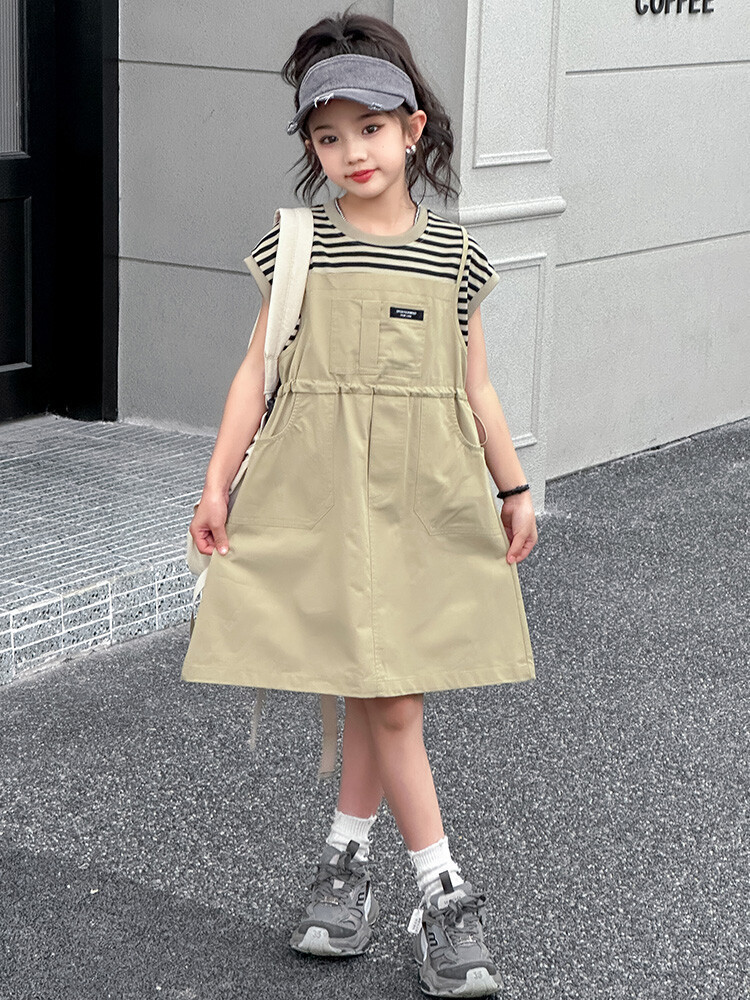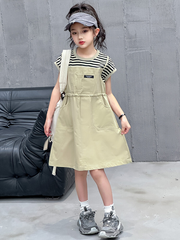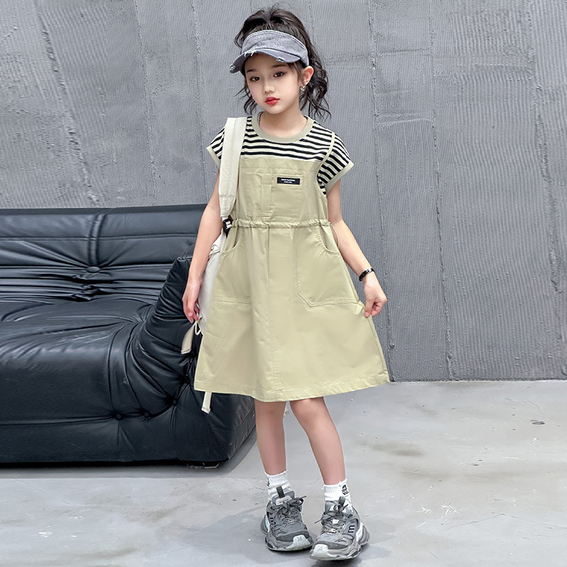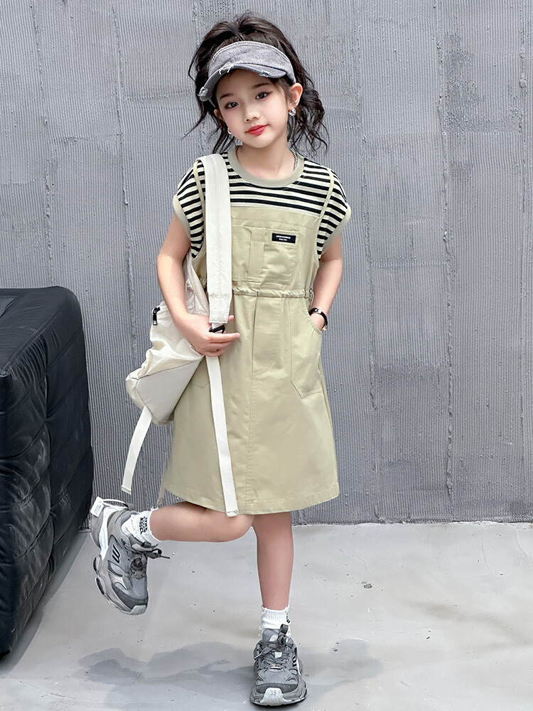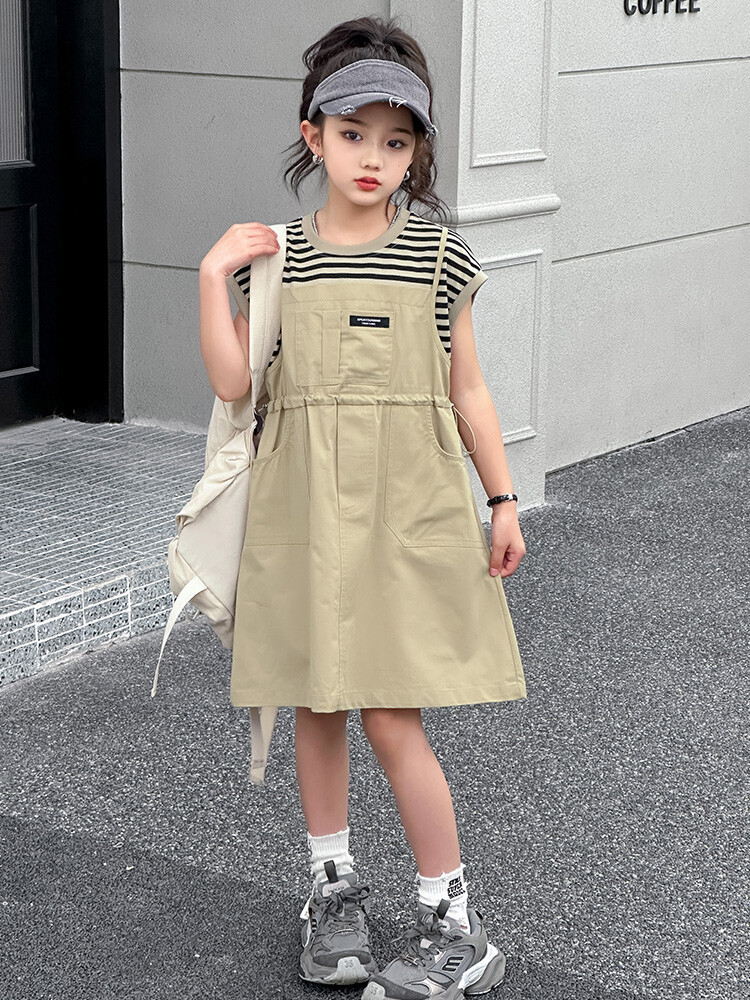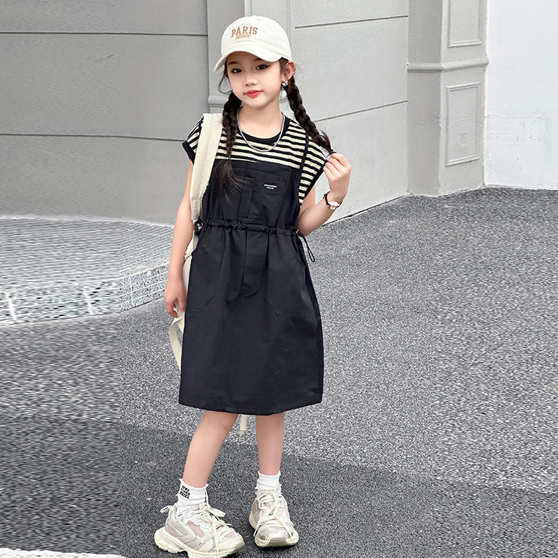 소녀 소녀의 치마 줄무늬 느슨한 어린이 치마 가짜 여름 여름 여름 작업복 캐주얼 스타일 원피스