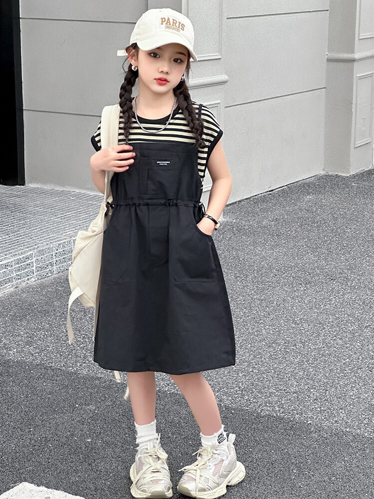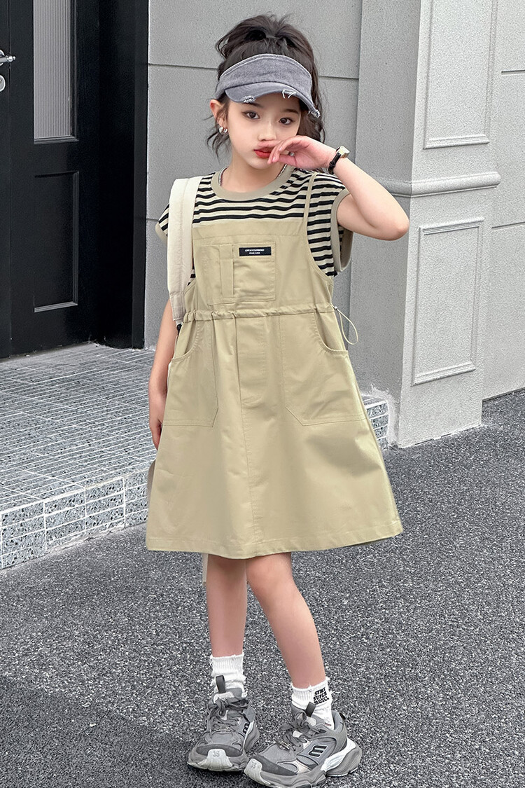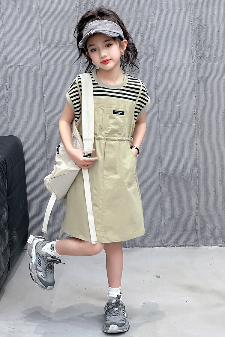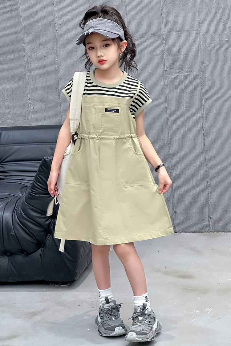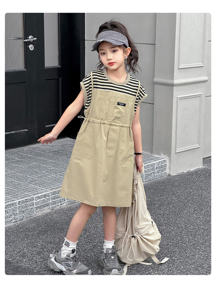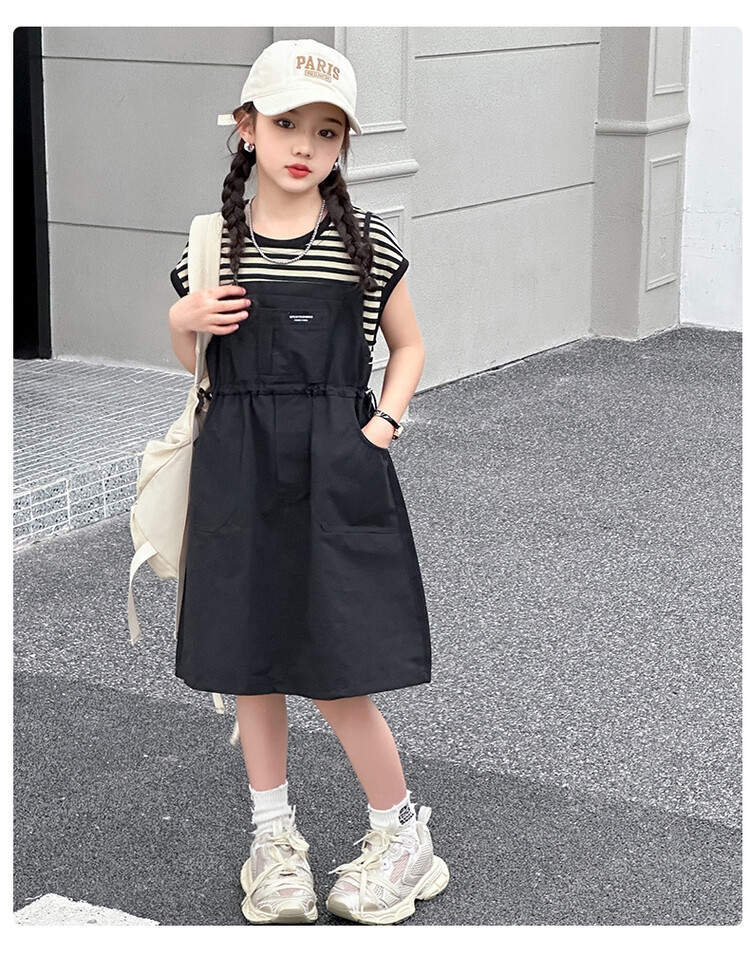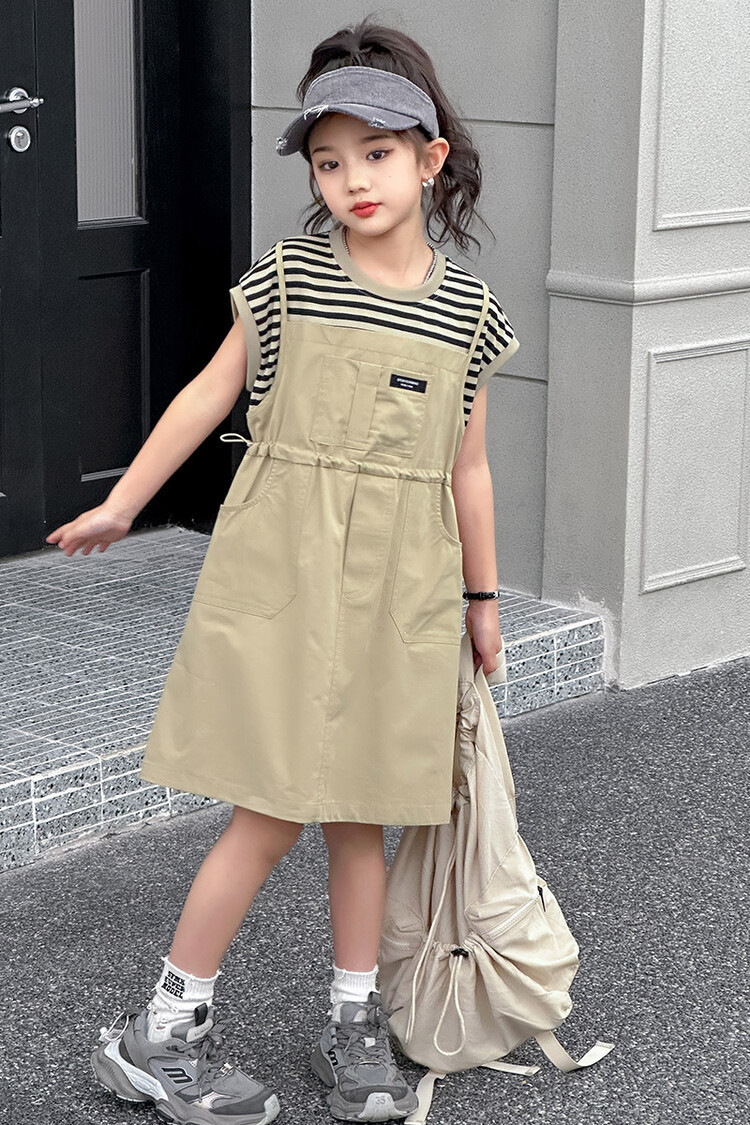 소녀 소녀의 치마 줄무늬 느슨한 어린이 치마 가짜 여름 여름 여름 작업복 캐주얼 스타일 원피스