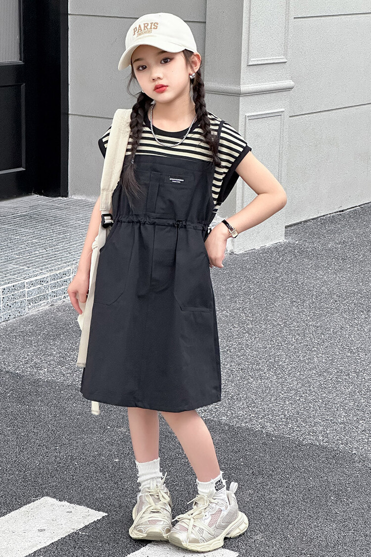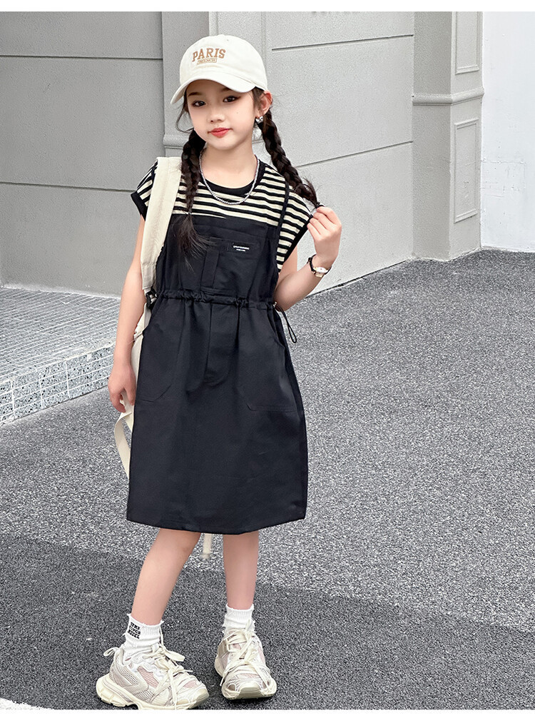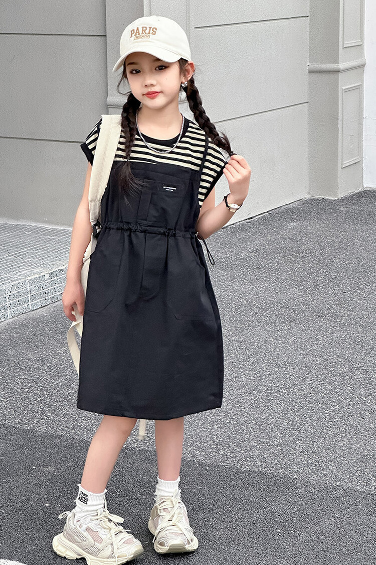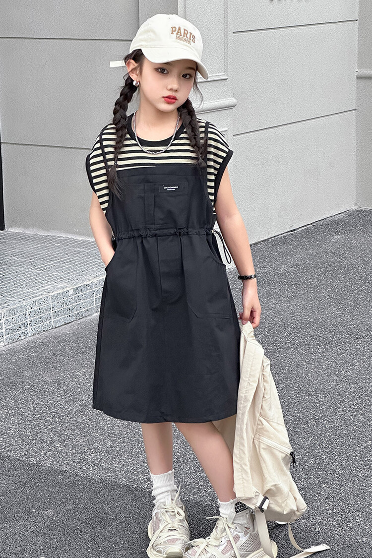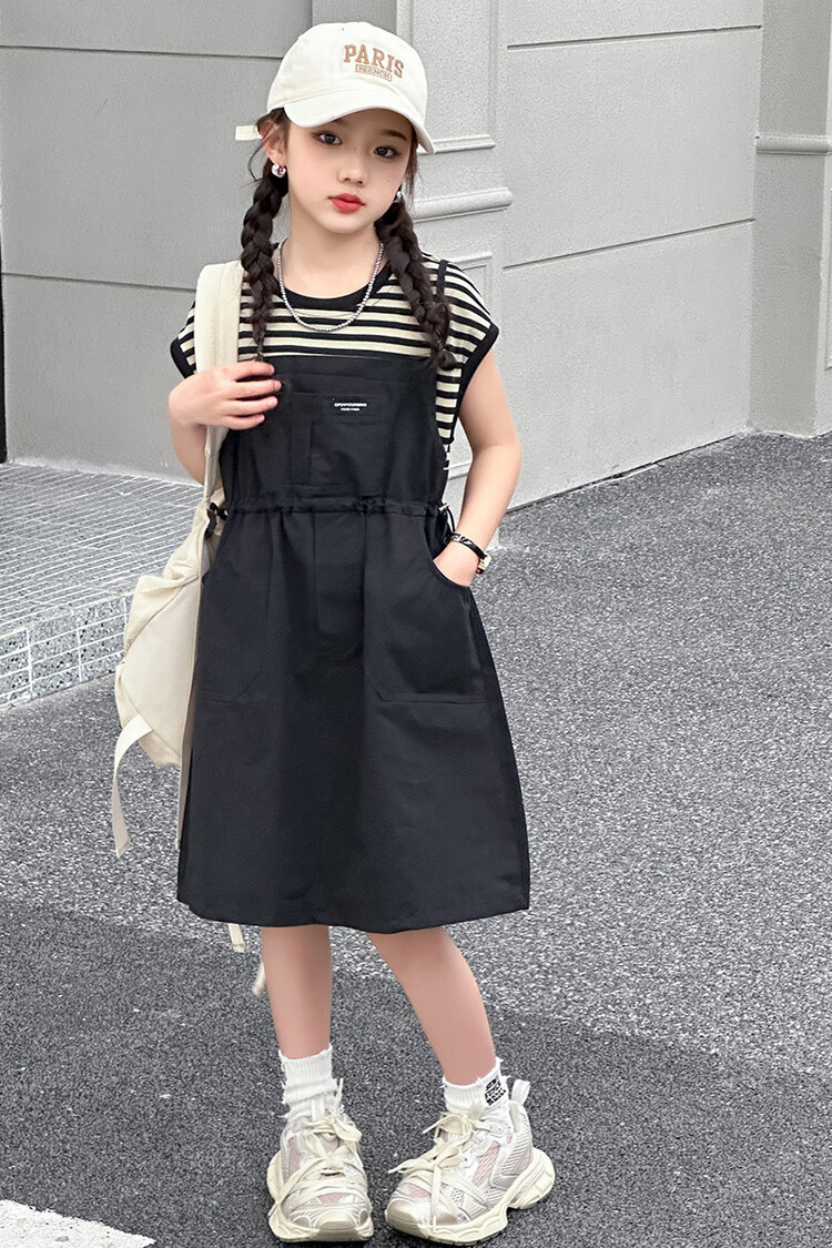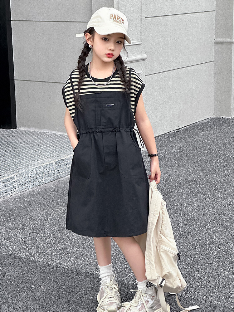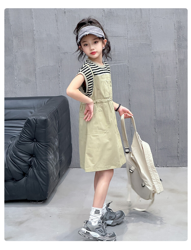 소녀 소녀의 치마 줄무늬 느슨한 어린이 치마 가짜 여름 여름 여름 작업복 캐주얼 스타일 원피스