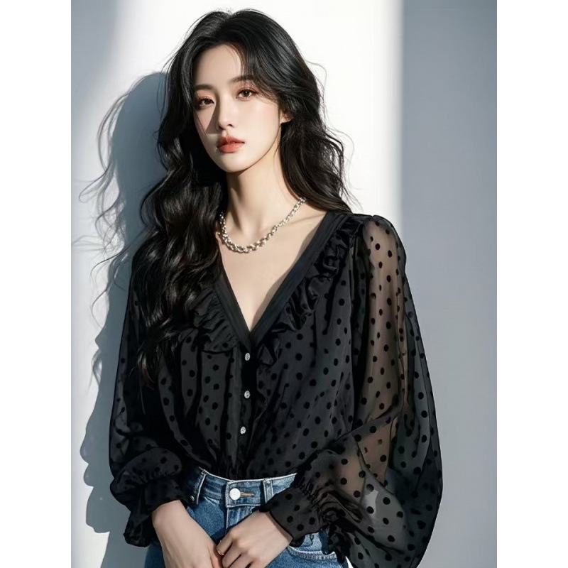 프랑스 스타일 하이 엔드 독특한 슈퍼 잘 생긴 우아한 루즈 탑 블랙 웨이브 도트 러플 쉬폰 셔츠 여성용 봄스토어 가기