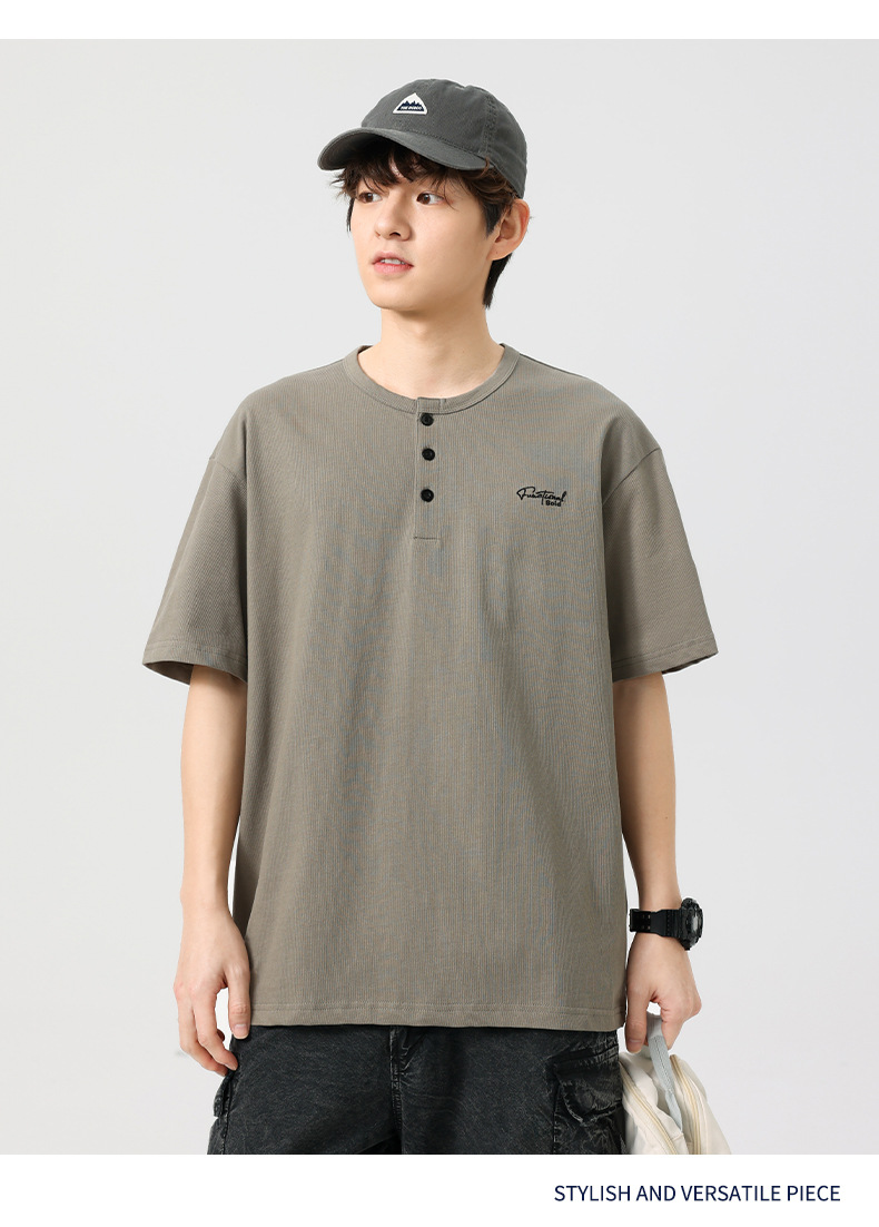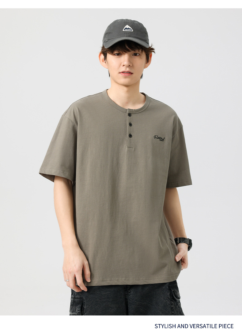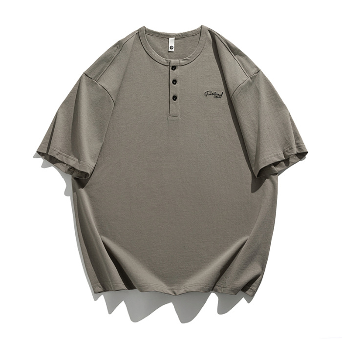 여름 반팔 티셔츠 남자 크루 넥 버튼 하프 카디건 무거운 편지 자수 캐주얼 반팔베이스 탑