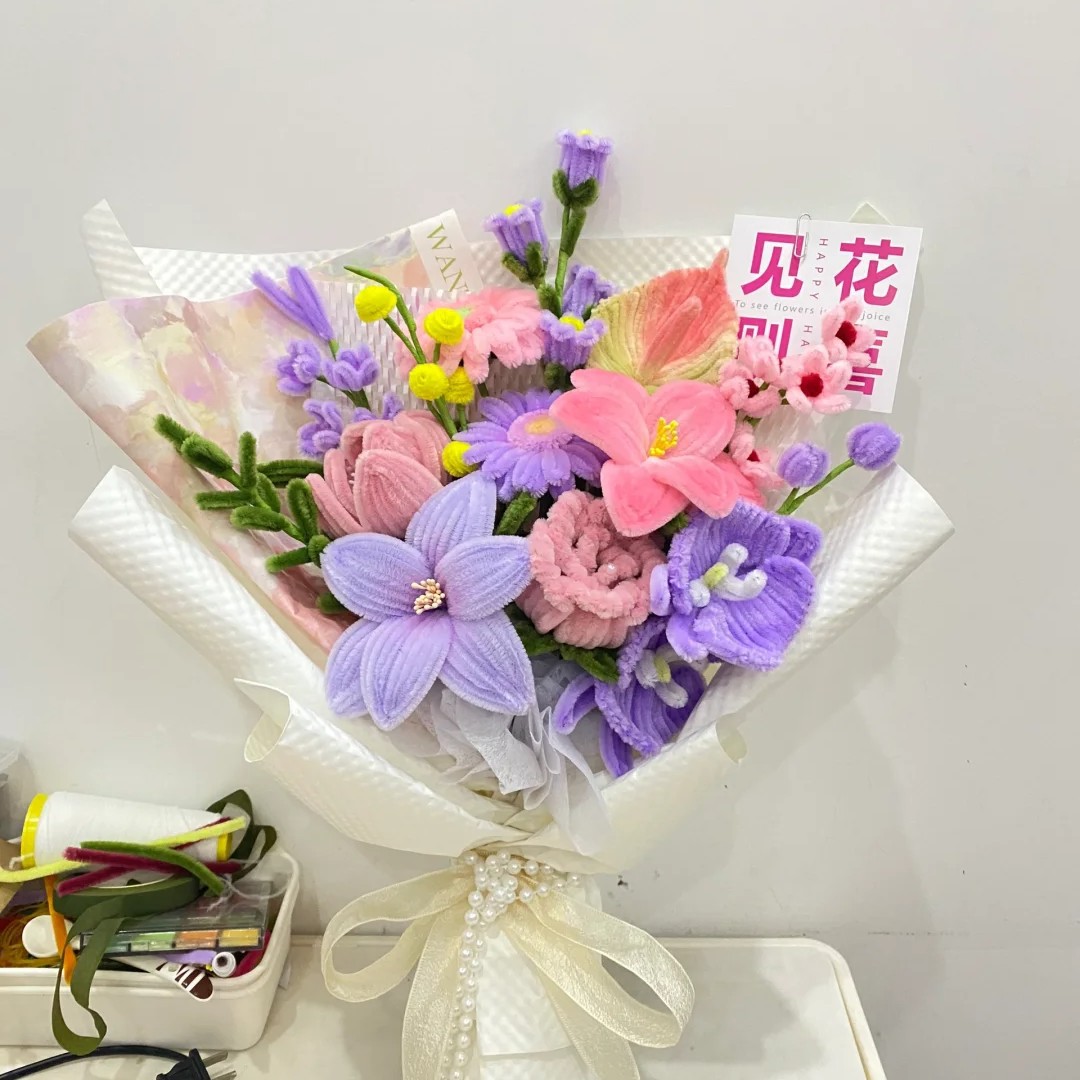 • 튜토리얼이 포함된 분홍색과 보라색 토끼 귀 꽃다발 재료의 큰 묶음