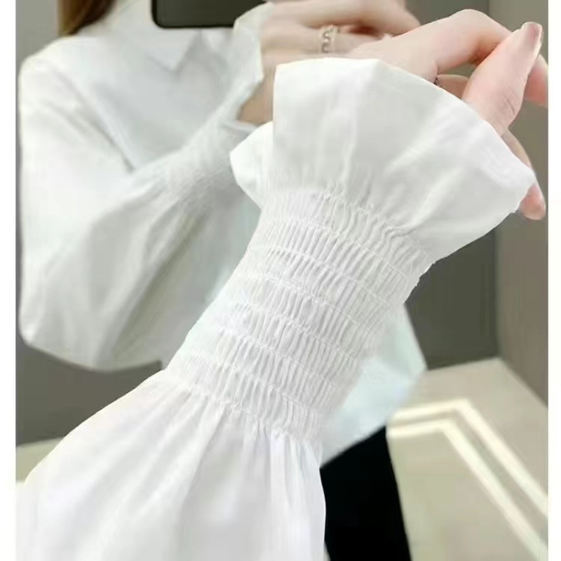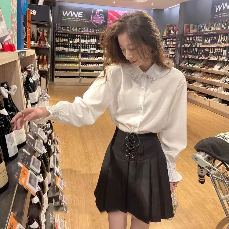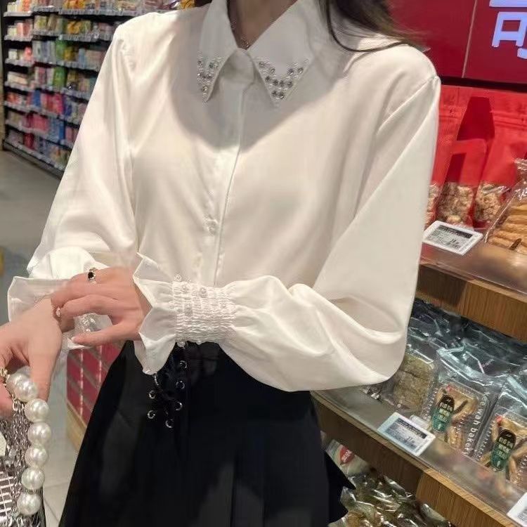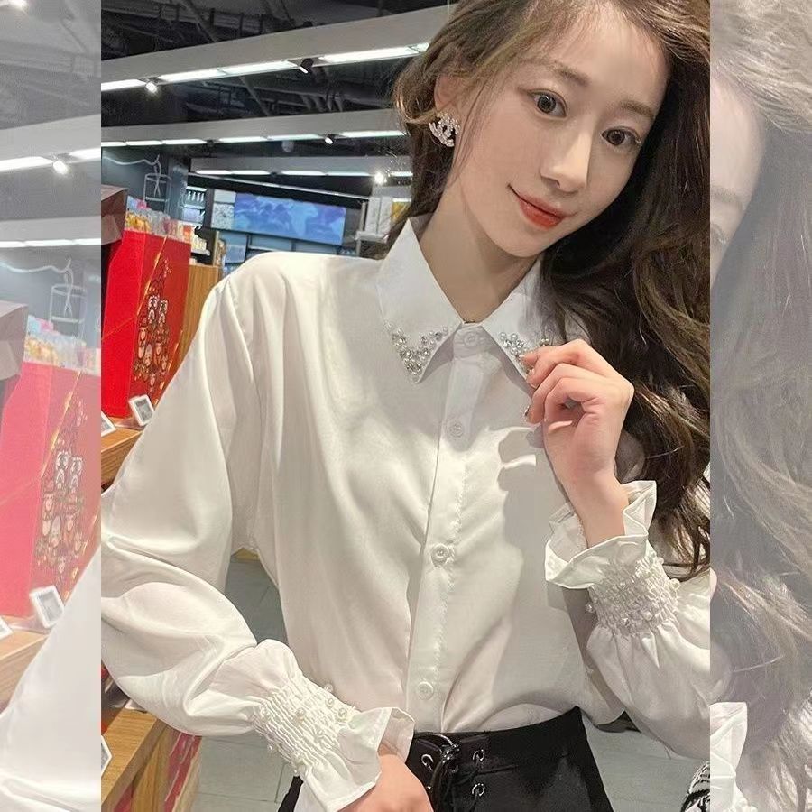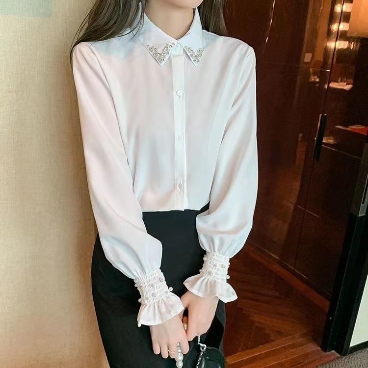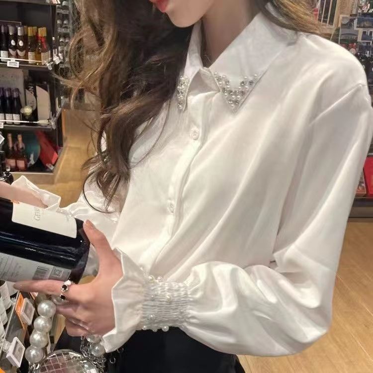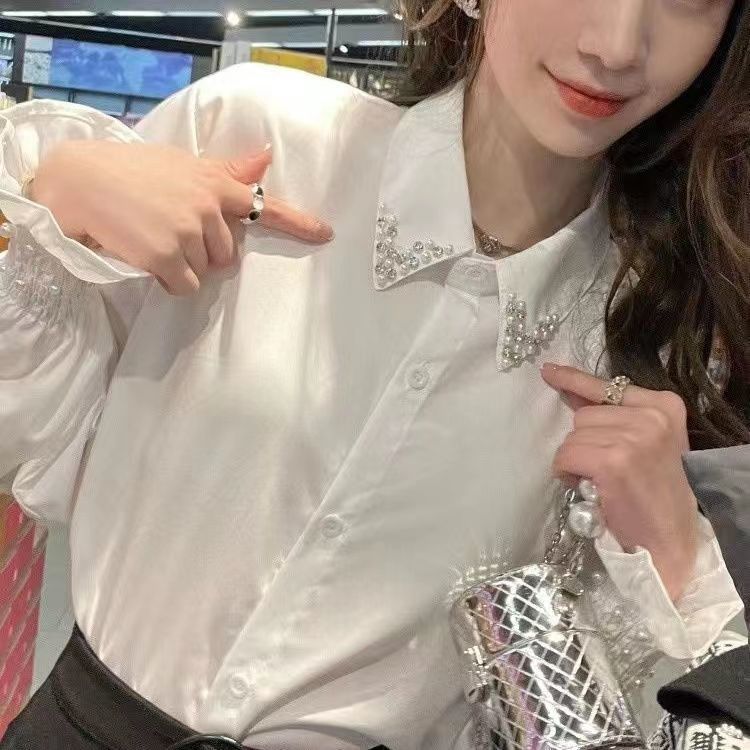 여성용 프렌치 헤비 비즈 셔츠, 봄, 가을 새로운 디자인, 틈새 스타일, 달콤한 퍼프 슬리브, 통근 OL스토어 가기