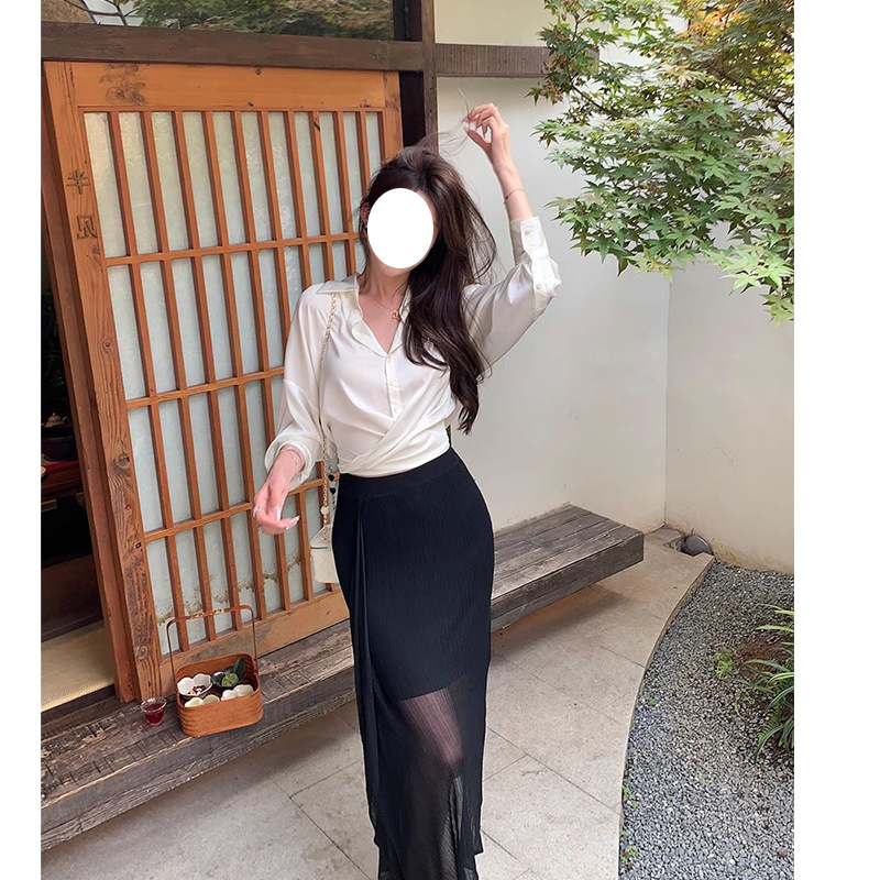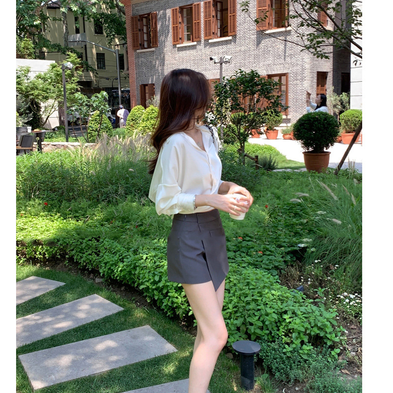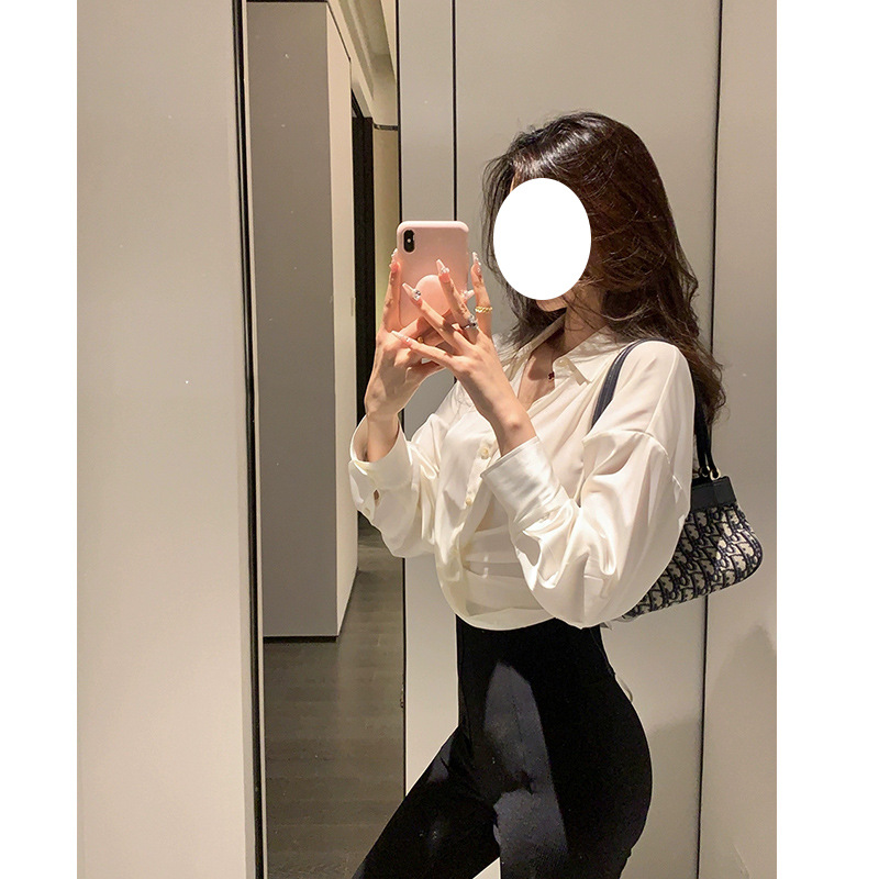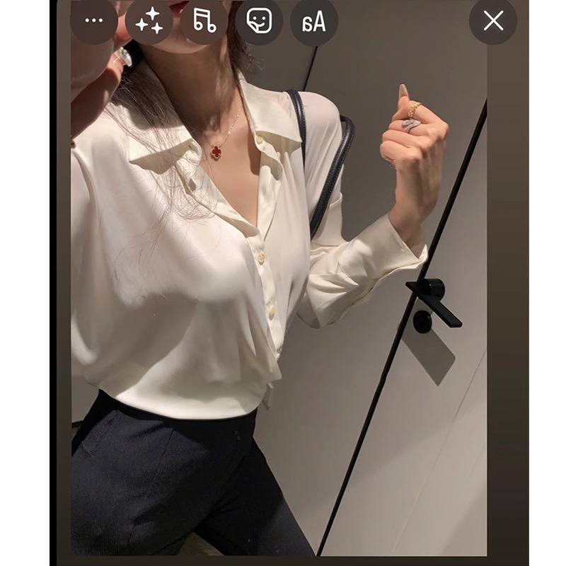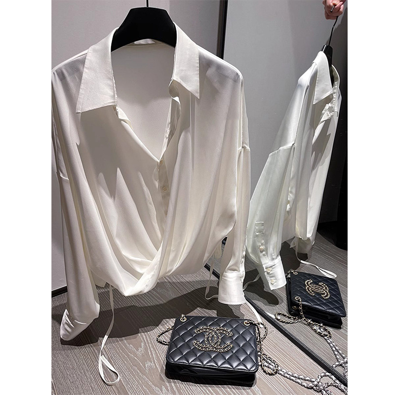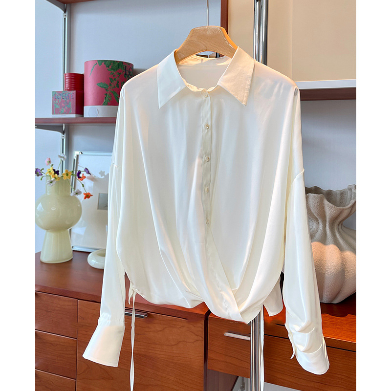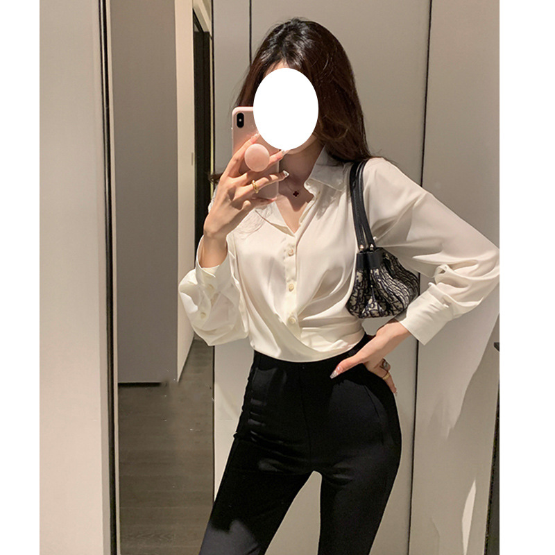 프랑스 스타일 우아한 통근 흰색 새틴 V 넥 쉬폰 셔츠 여자 올 매치 느슨한 긴 소매 옷깃 드로우 스트링 셔츠 탑
