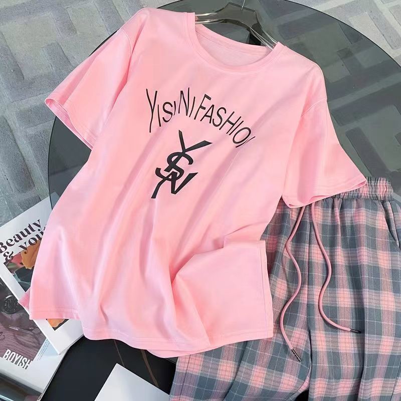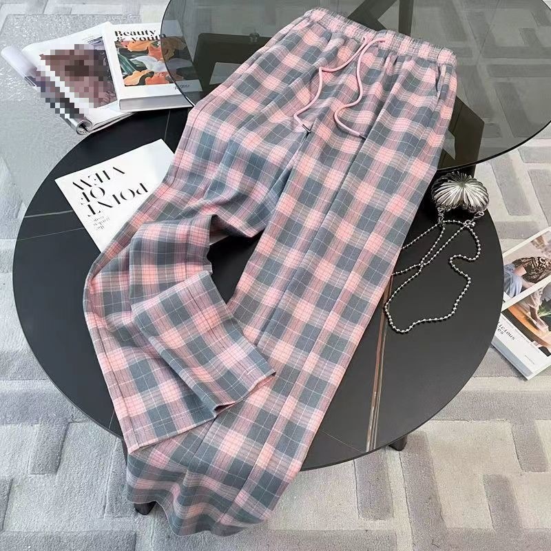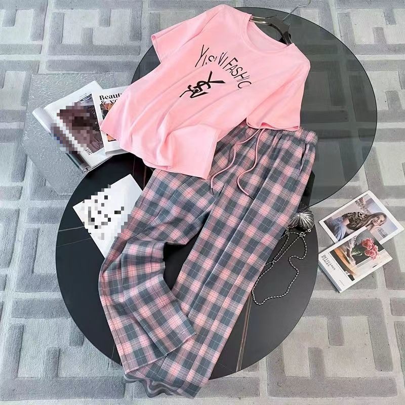 솔트 스타일 프라이드 스트리트 캐주얼 스포츠 세트 여성 여름 한국 스타일 핑크 연령 감소 라이블리 체크 와이드 레그 팬츠 투피스 세트스토어 가기