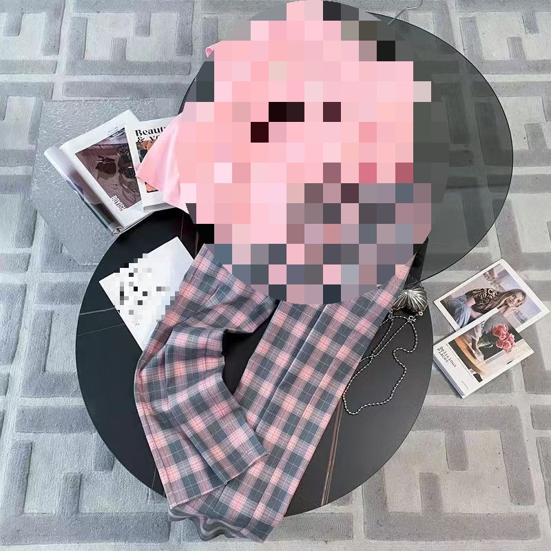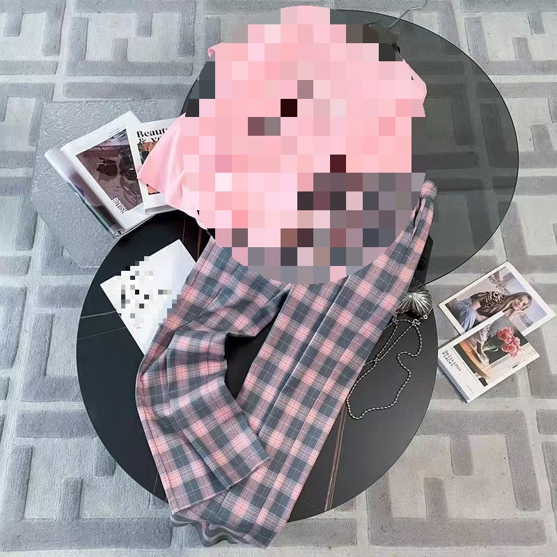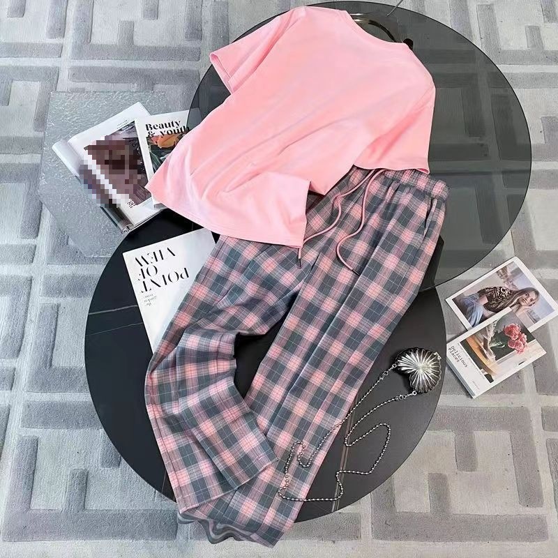 솔트 스타일 프라이드 스트리트 캐주얼 스포츠 세트 여성 여름 한국 스타일 핑크 연령 감소 라이블리 체크 와이드 레그 팬츠 투피스 세트