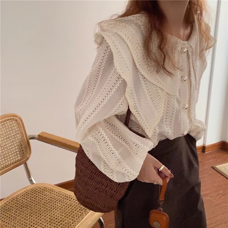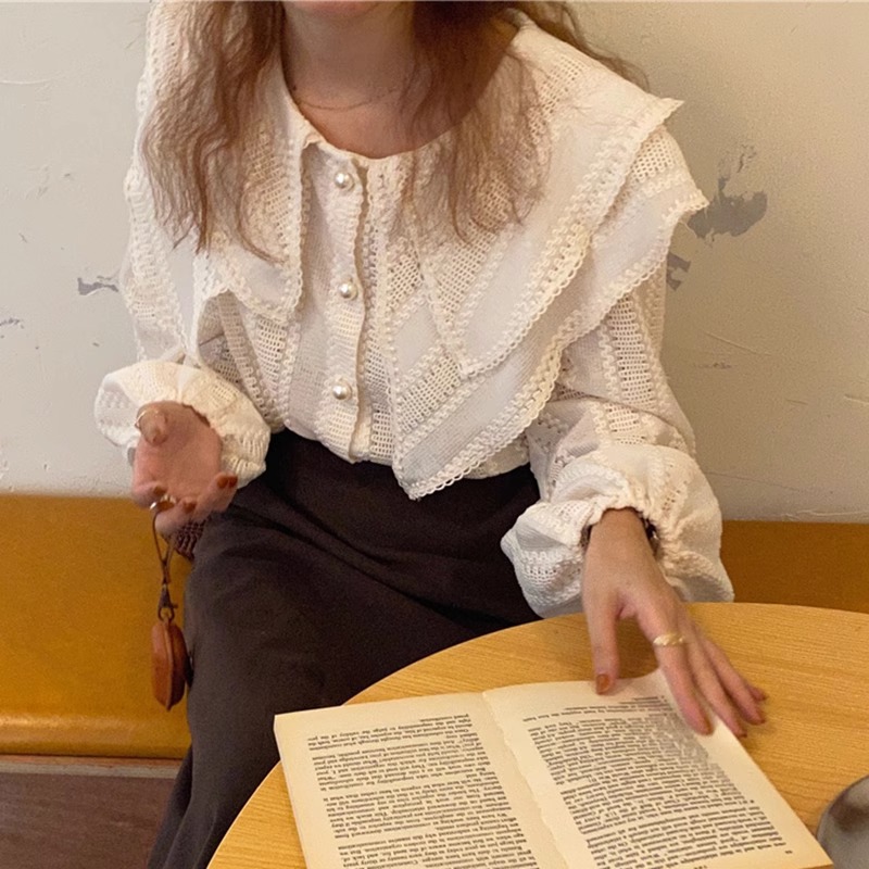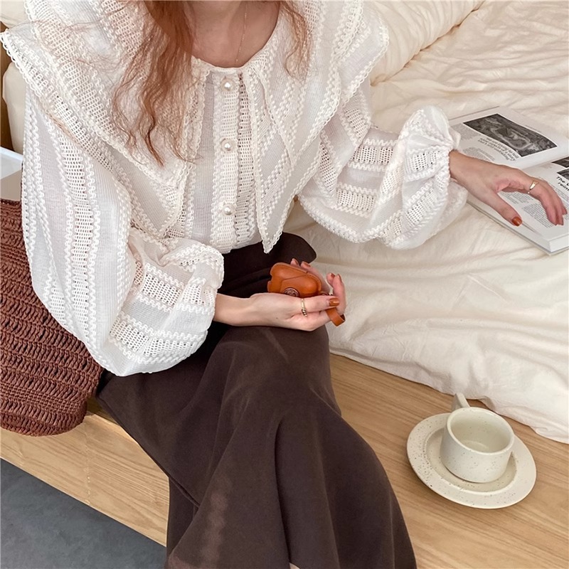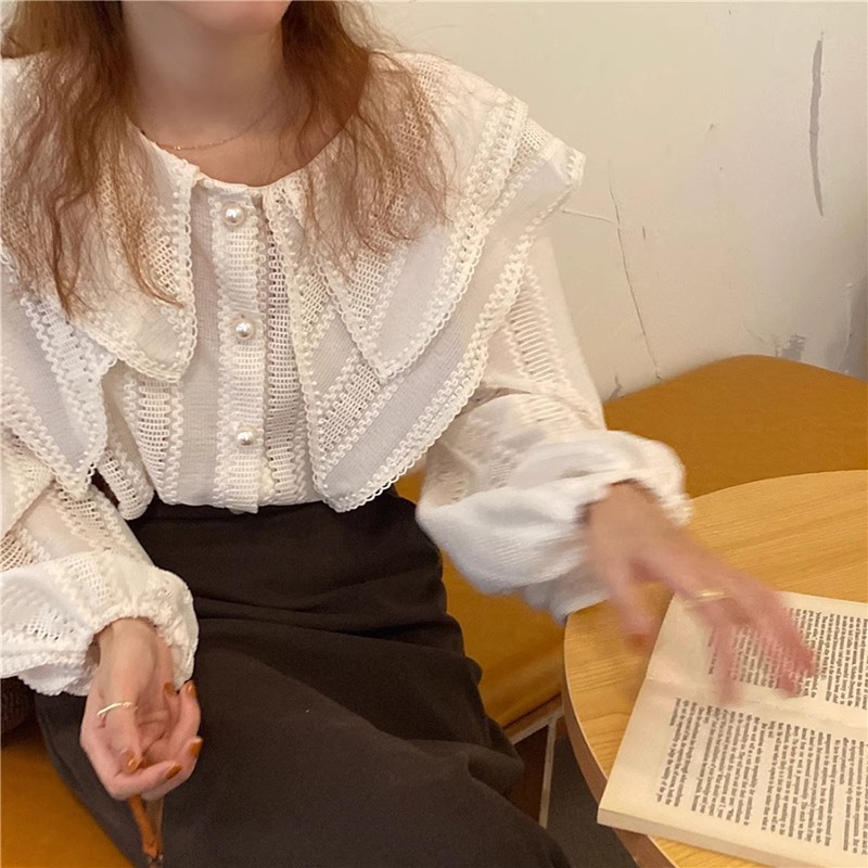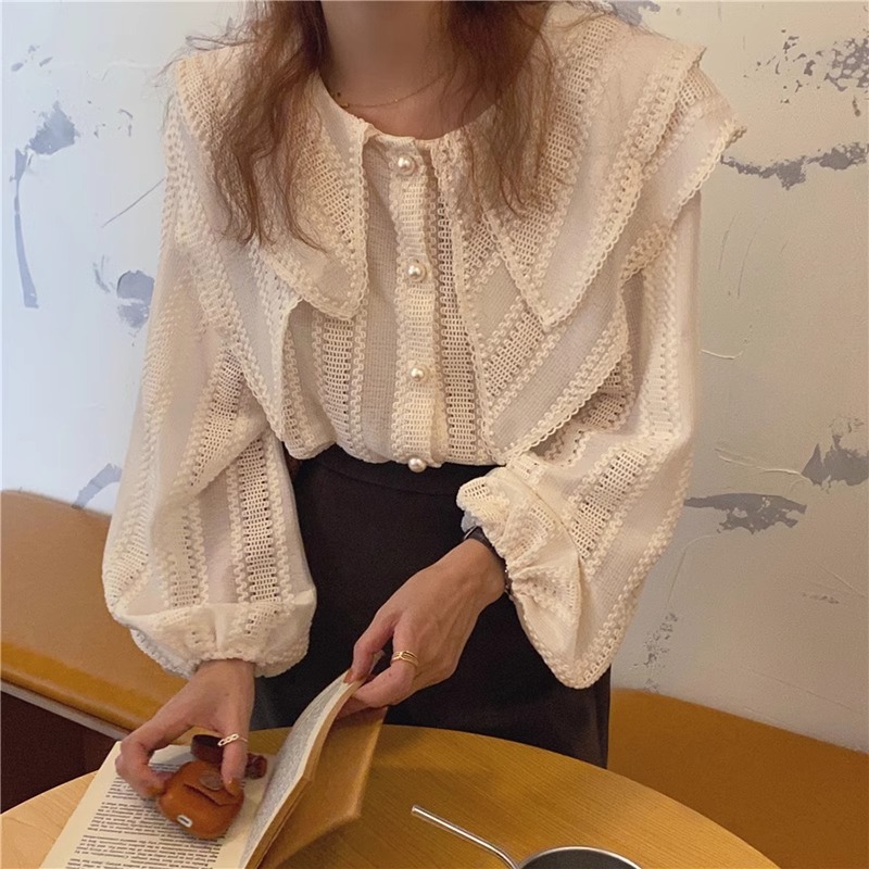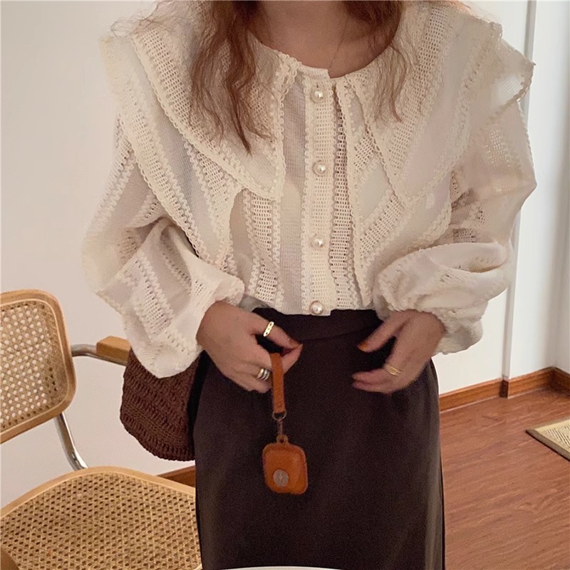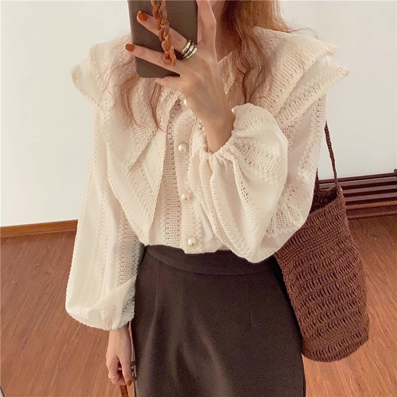 한국어 버전 chic2025 여름과 가을 연령 감소 더블 레이어 프릴 대형 라펠 진주 버튼 루즈 랜턴 슬리브 셔츠 탑 여성용스토어 가기