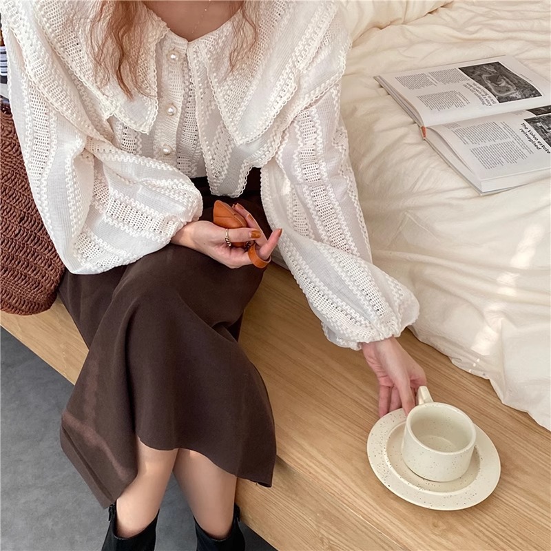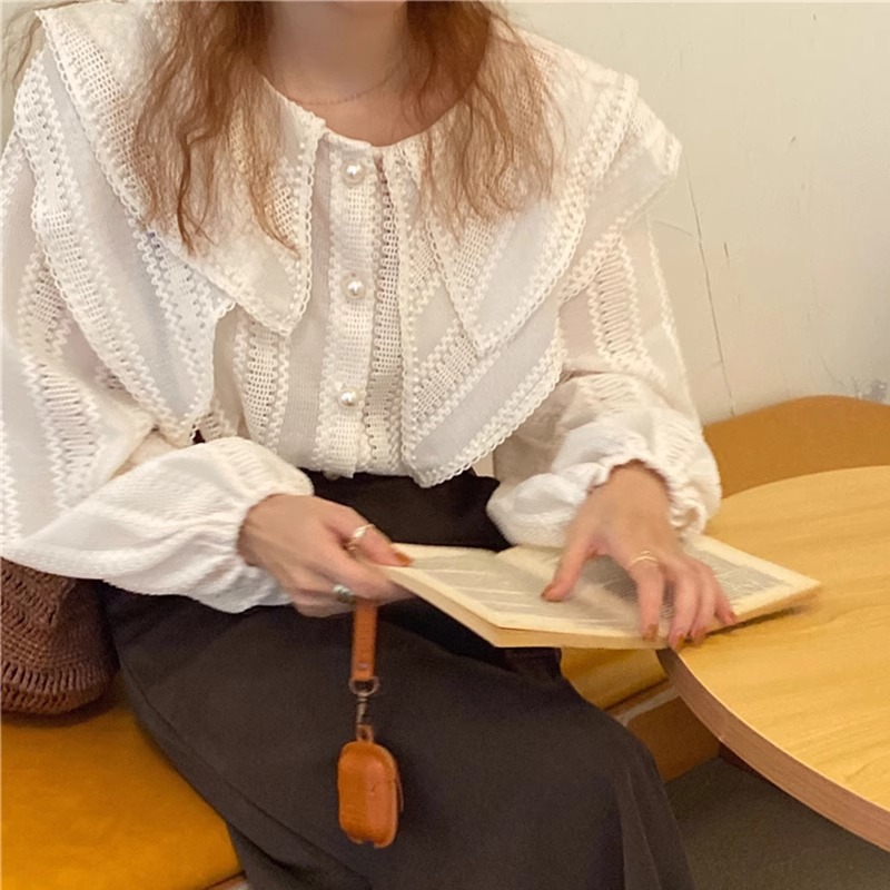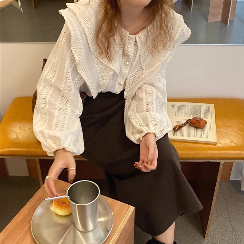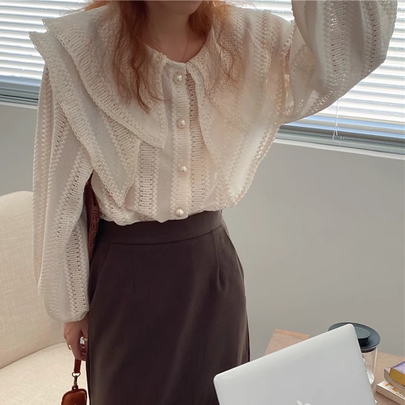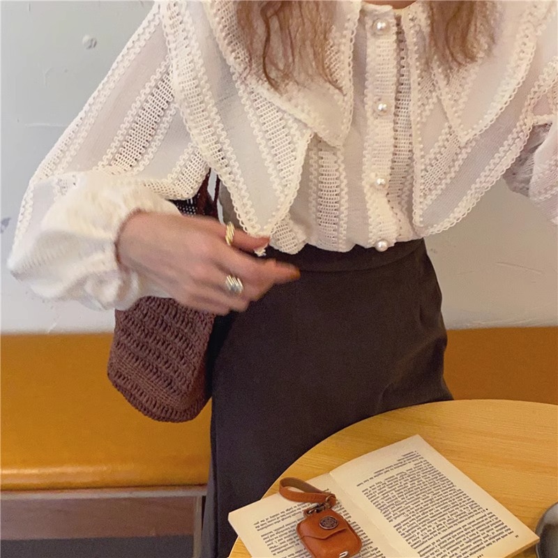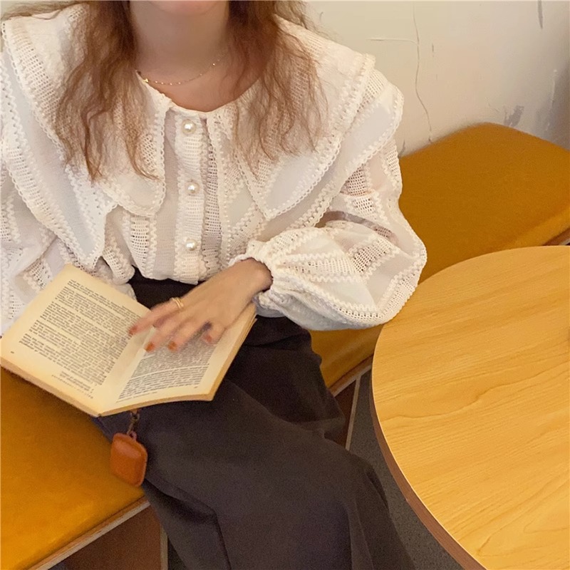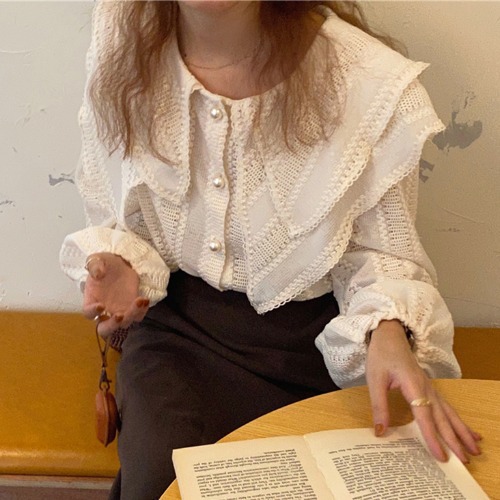 한국어 버전 chic2025 여름과 가을 연령 감소 더블 레이어 프릴 대형 라펠 진주 버튼 루즈 랜턴 슬리브 셔츠 탑 여성용스토어 가기