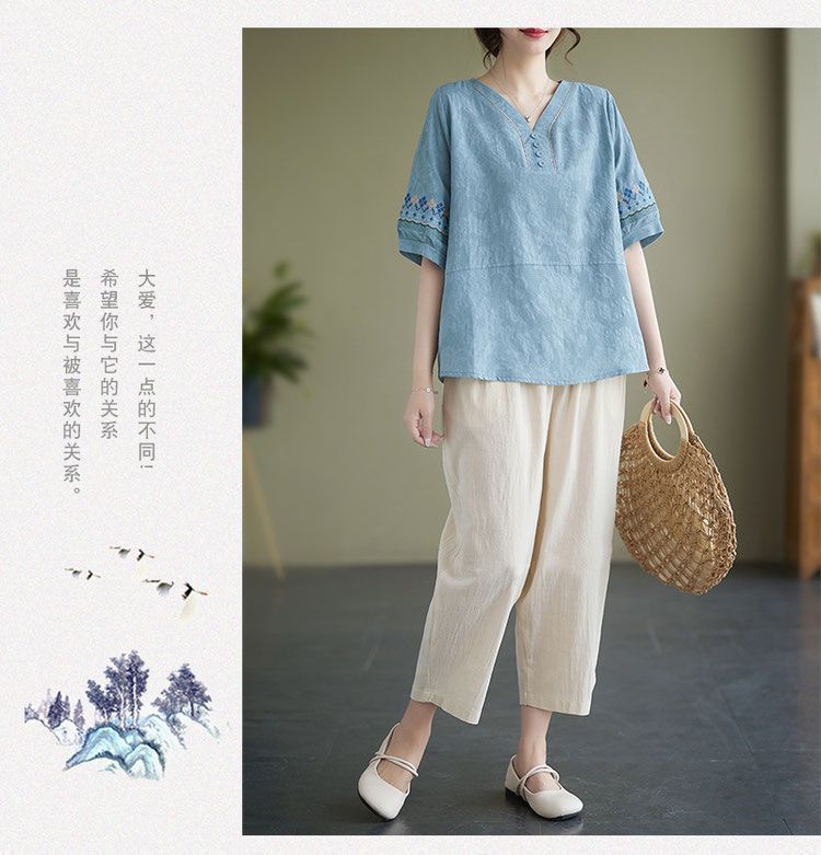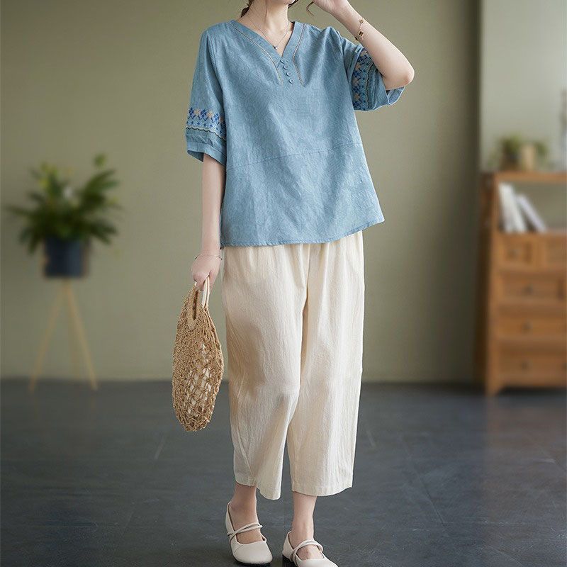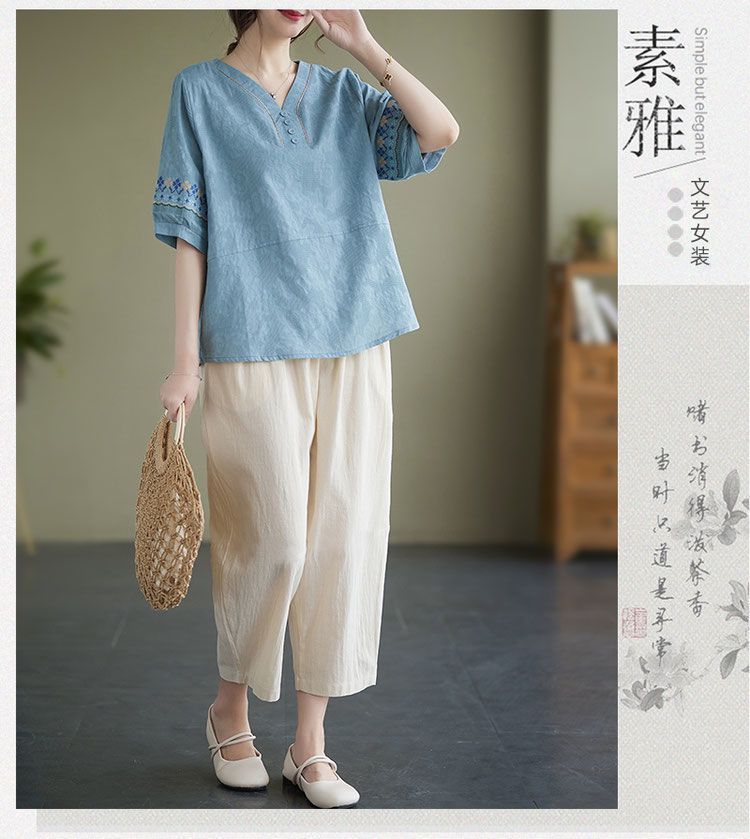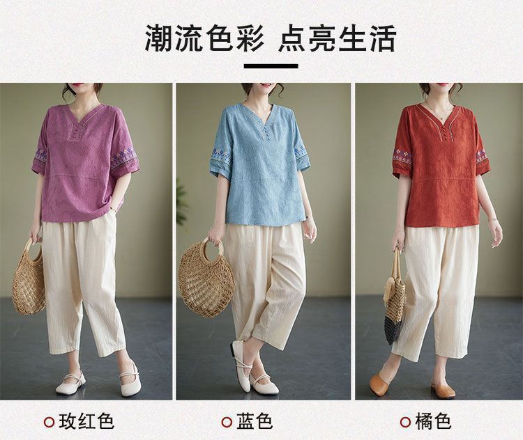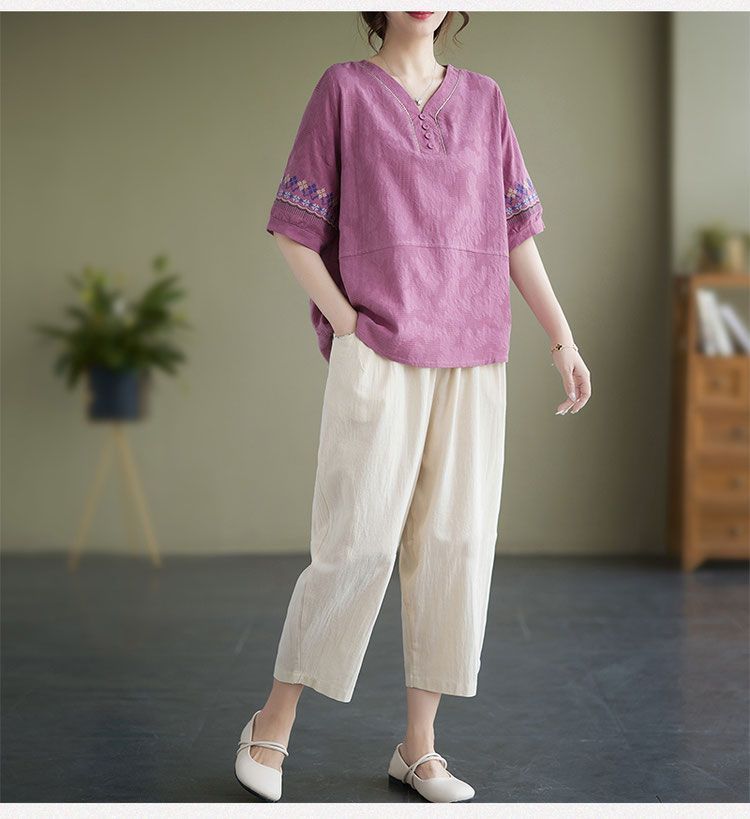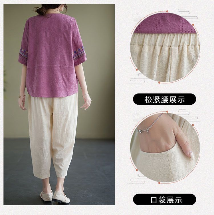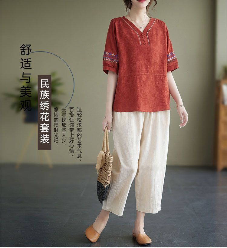 빈티지 민족 여름 패션 어머니 코튼 리넨 우아한 느슨한 슬리밍 세트 탑 와이드 다리 바지 투피스 세트