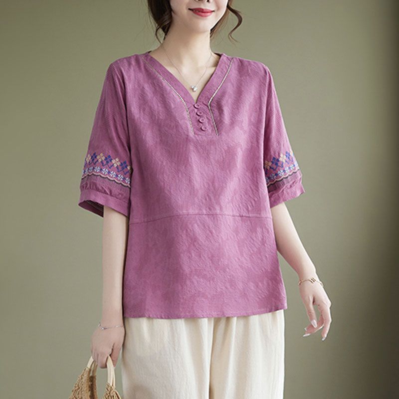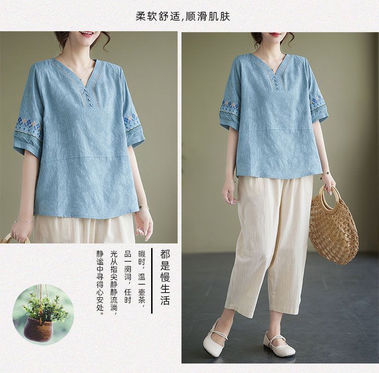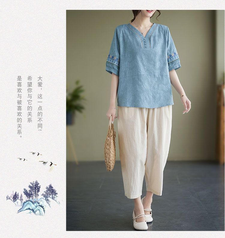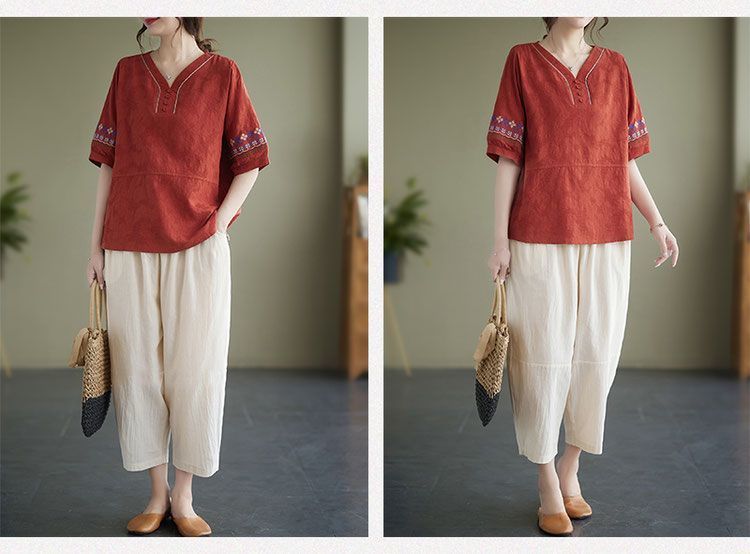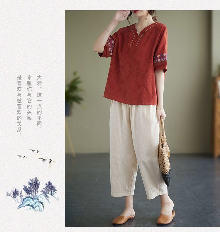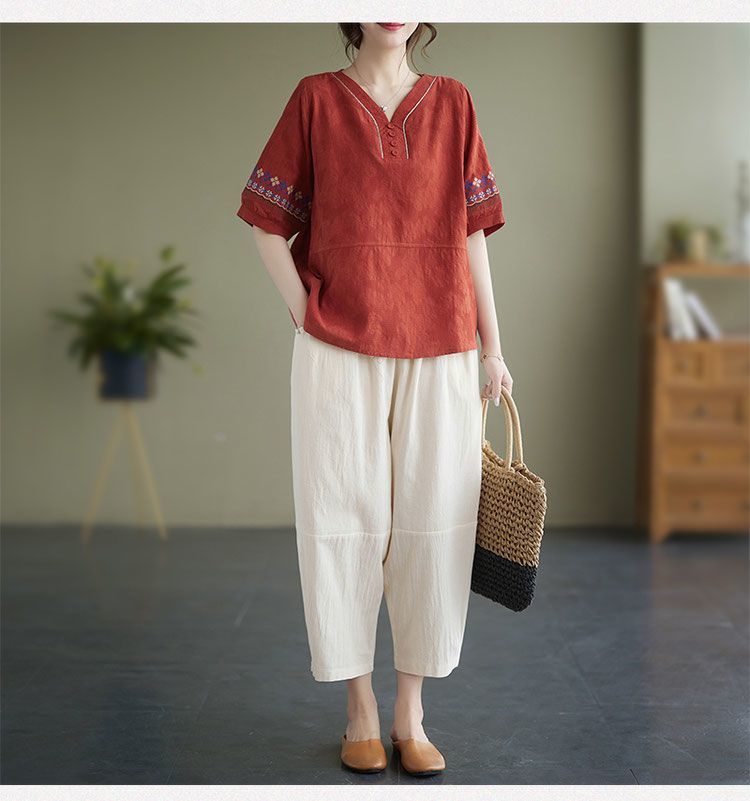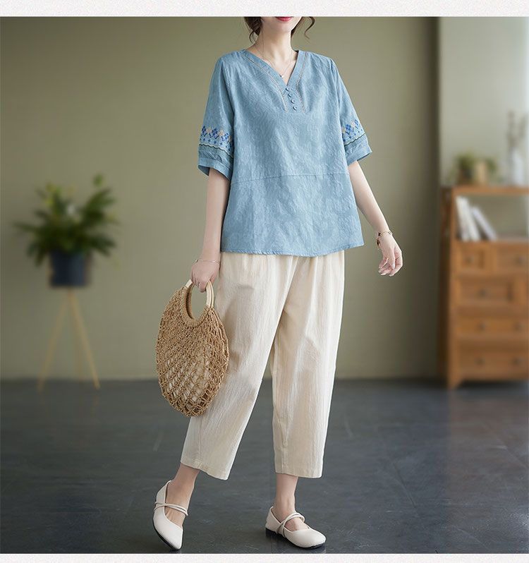 빈티지 민족 여름 패션 어머니 코튼 리넨 우아한 느슨한 슬리밍 세트 탑 와이드 다리 바지 투피스 세트