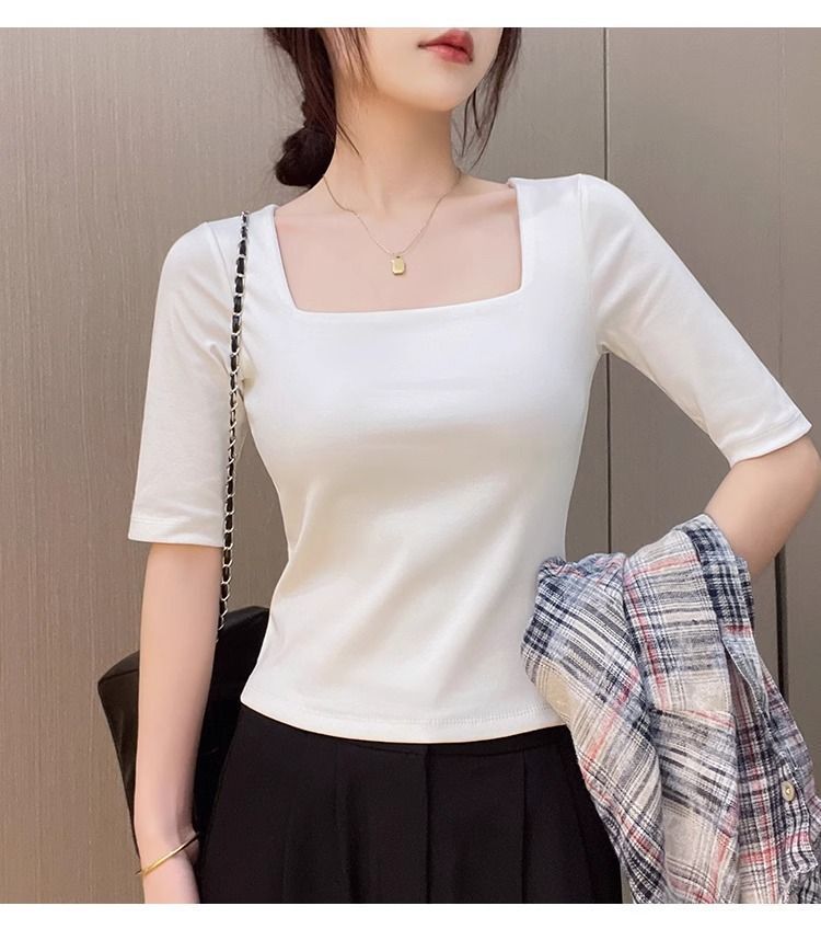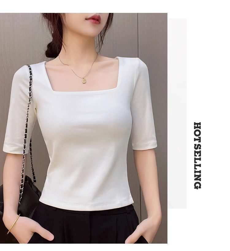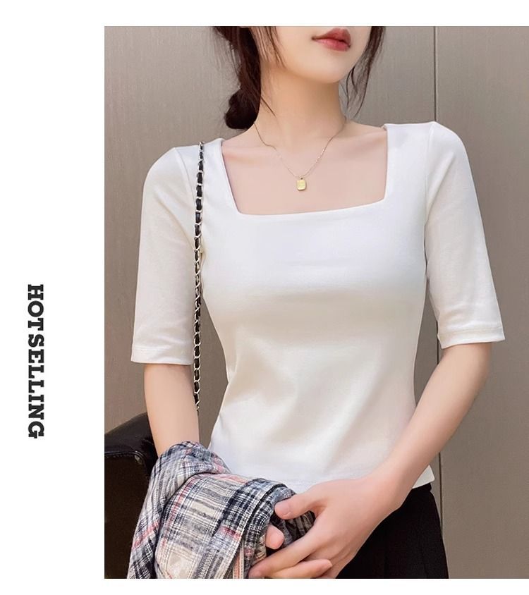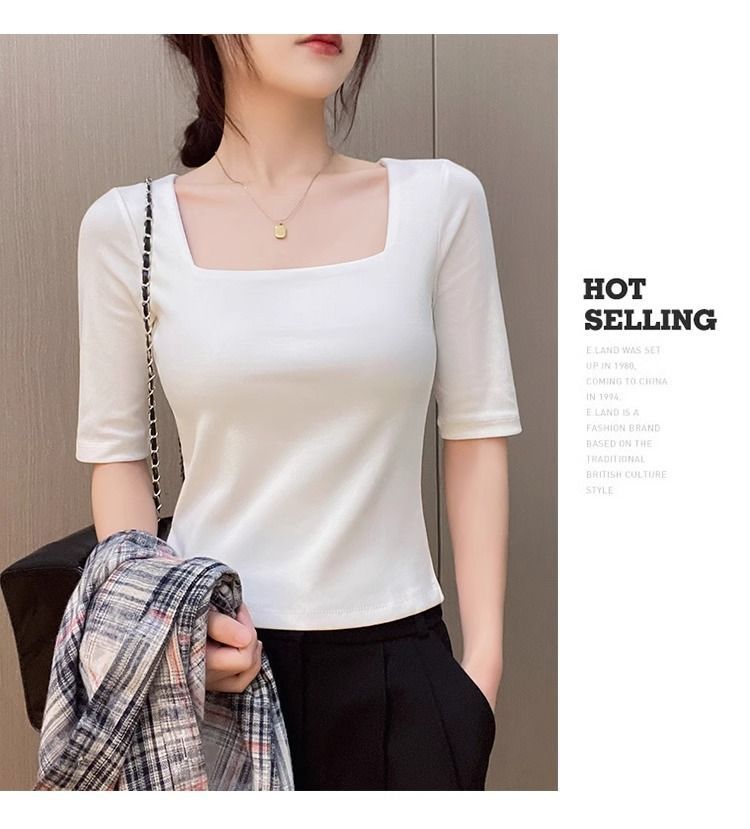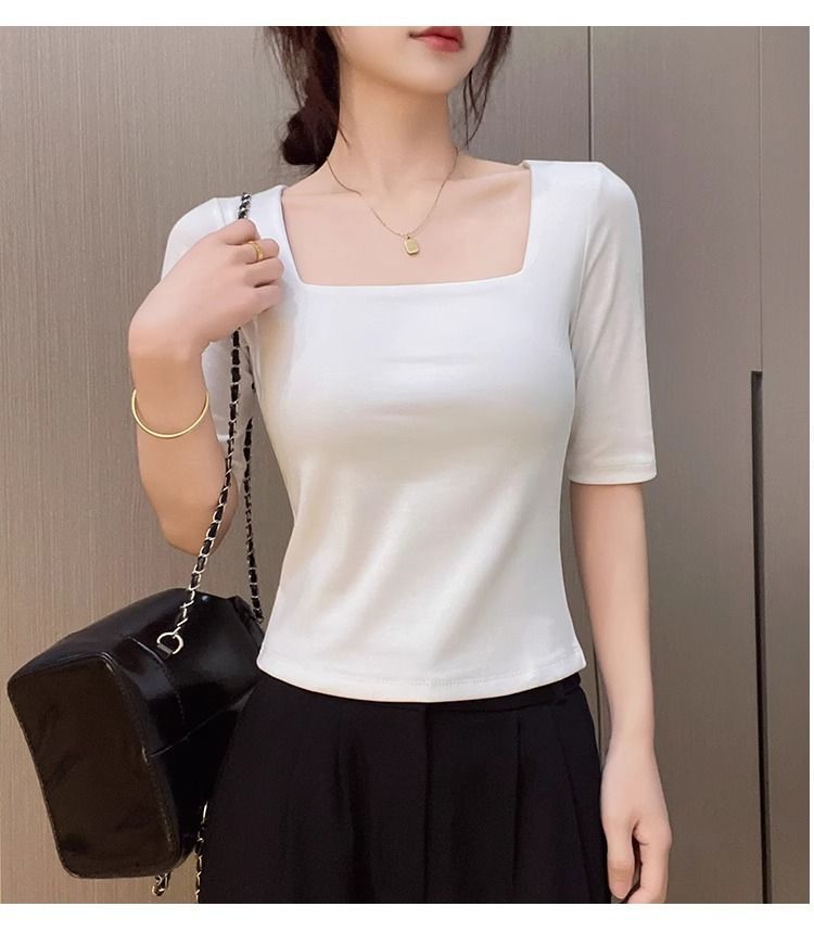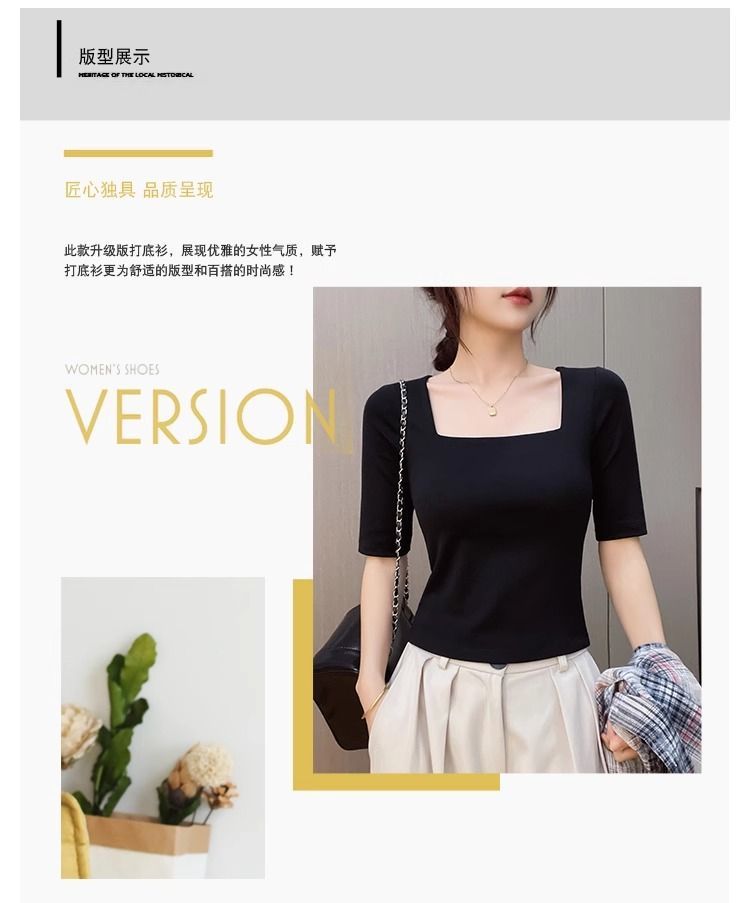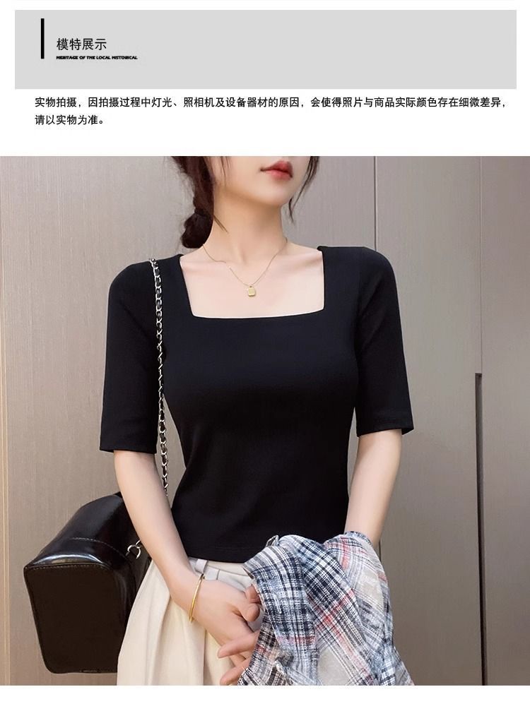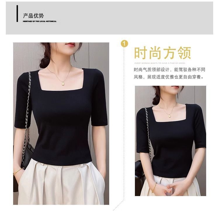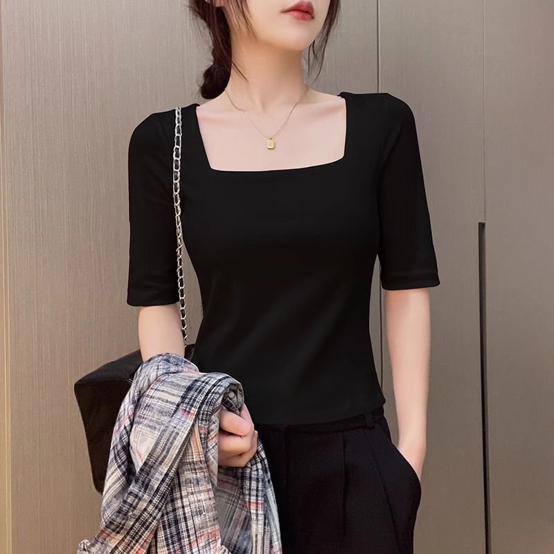 블랙 미드 슬리브 티셔츠 여성 2025 년 여름 새로운 디자인 센스 프렌치 스퀘어 넥 어깨 슬리밍 하프 슬리브 베이스 탑스토어 가기