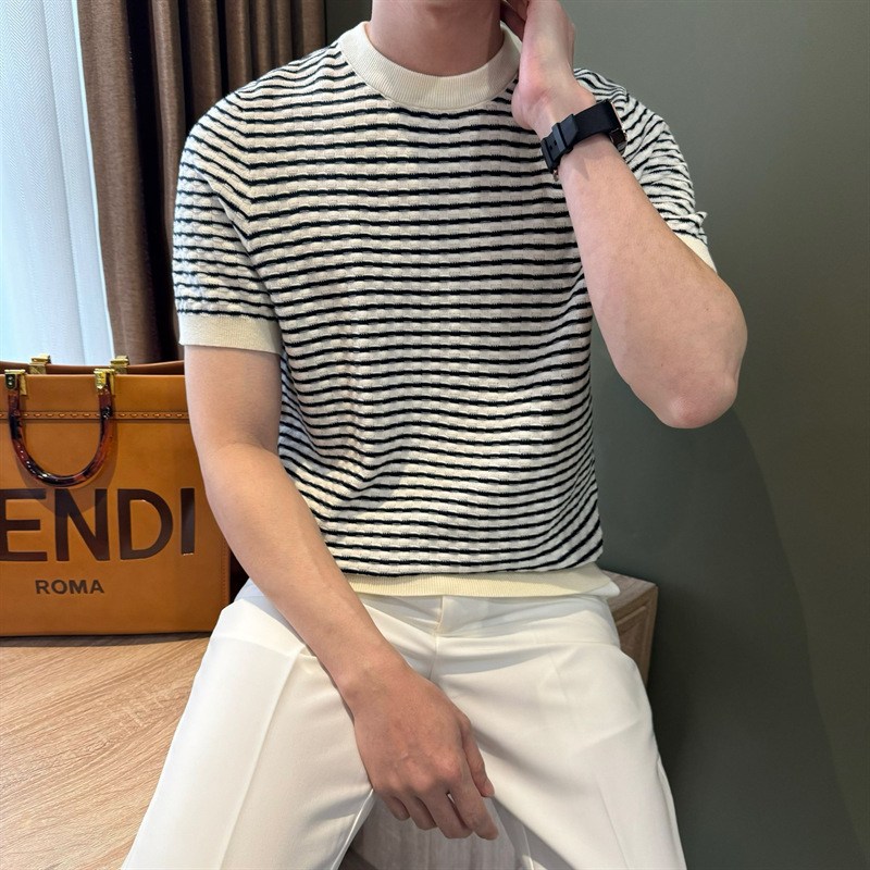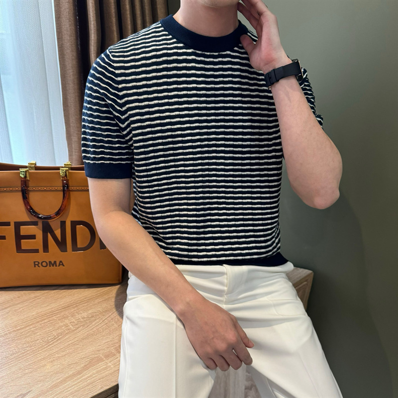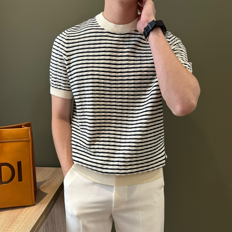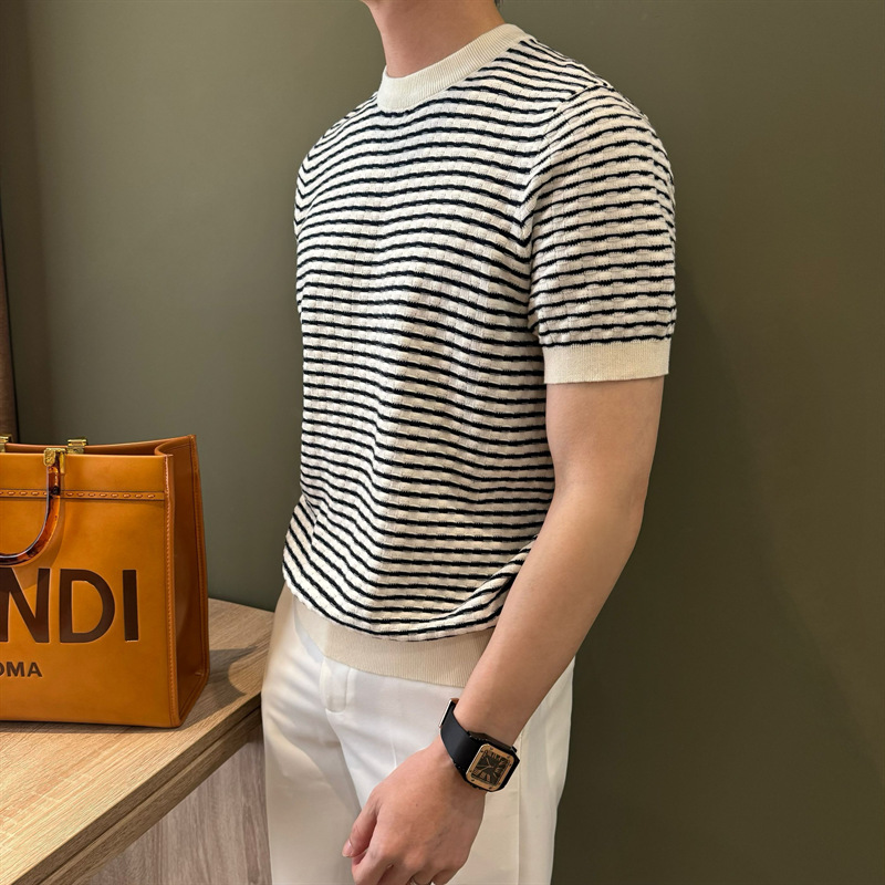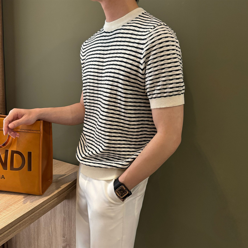 여름 반팔 라운드 넥 남성용 스웨터, 가벼운 럭셔리, 통기성, 피부 친화적인 자카드 스트라이프 대비 컬러 스웨터, 남성용 스웨터, 바닥 셔츠스토어 가기